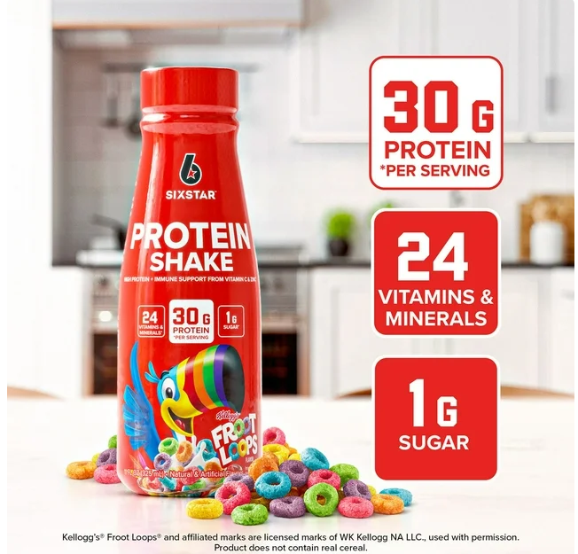 Experience the Nostalgic Taste of Froot Loops Indulge in a nostalgic flavor experience with the Six Star Kellogg's Froot Loops Ready-to-Drink Protein Shake. This delicious and convenient drink offers a perfect blend of taste and performance. It's not just a tasty treat, but also a powerful nutritional supplement. The shake features the fun and familiar flavor of Kellogg’s Froot Loops, turning your protein shake into a delightful indulgence. Packed with High-Quality Protein Each bottle of this ready-to-drink protein shake delivers a potent dose of 30g of high-quality protein. Protein is essential for muscle growth and recovery, making this drink a perfect choice for post-workout refueling. Stay energized throughout your day with this protein-packed drink. Rich in Essential Vitamins and Minerals Along with high-quality protein, this drink also provides 24 essential vitamins and minerals. It includes immune-supporting Vitamin C and Zinc, contributing to your overall daily nutrition. This shake is not just about taste, but also about supporting your health and wellness. Low in Sugar and Calories Despite its delicious taste, the Six Star Kellogg's Froot Loops Ready-to-Drink Protein Shake contains only 1g of sugar and 160 calories per bottle. It aligns seamlessly with your health and fitness goals, making it a guilt-free indulgence. Enjoy the flavors you love without compromising on your diet. Soy-Free and Convenient This ready-to-drink protein shake is soy-free, making it suitable for those with soy allergies or sensitivities. It comes in a 15-count package, offering convenience and ease. Whether for busy mornings or as a satisfying snack, this protein shake is ready when you are.