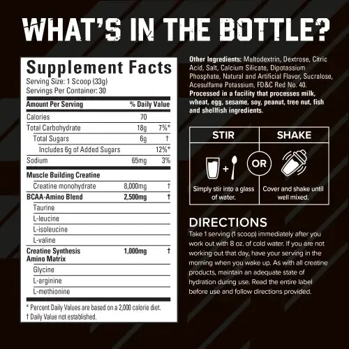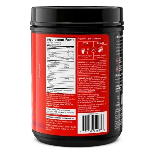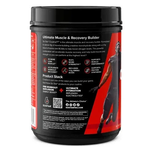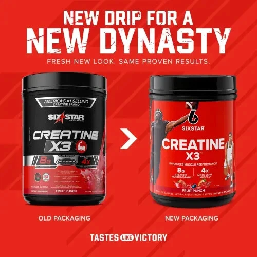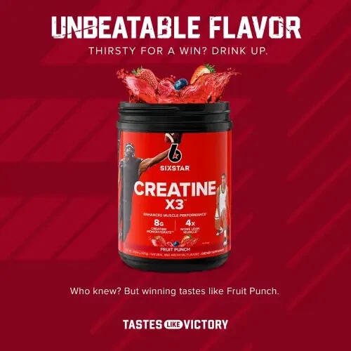 Product details Six Star Pro Nutrition Creatine X3 Fruit Punch Powder is formulated to delivery 8g of muscle building creatine, along with 2.5g of BCAAs and taurine to help boost nitrogen levels. The fuel you need to. Build muscle and strength, and it’s engineered for all athletes. Every scoop delivers 8g of premium creatine monohydrate and creatine HCl. In a 12-week study, those who consumed the creatine in Creatine X3 and taking part in the training program gained over 4X more lean muscle compared to placebo. When used continuously, Creatine X3 saturates your muscles, improving your between-set recovery and enabling you to train harder, for longer periods of time. Every serving delivers an impressive 8,000mg dose of a premium creatine blend, featuring creatine monohydrate and creatine HCl 2,500mg of free-form BCAAs and taurine in every scoop to help boost nitrogen levels Coupled with a training program, increased their strength capacity by 18.6% compared to baseline (6,658 vs. 5,613 joules) in 10 days Testers taking part in the training program gained over 4 times more lean muscle, compared to participants who were taking a placebo Engineered for active men & women, strength trainers, all athletes, fitness enthusiasts, body builders, endurance athletes and great for preworkout