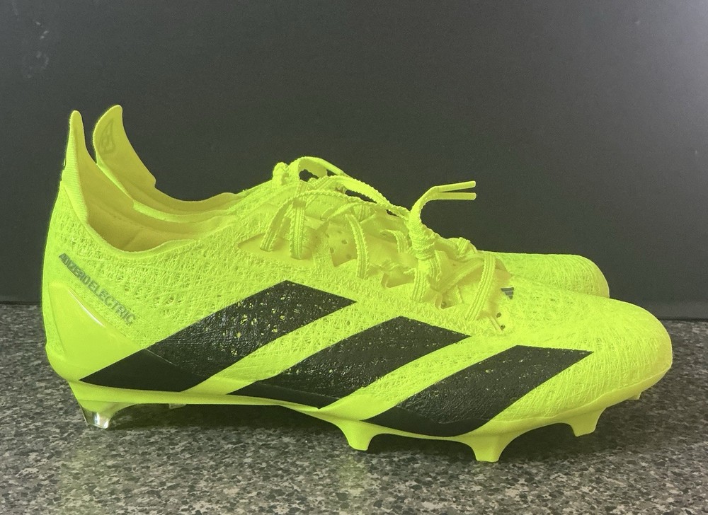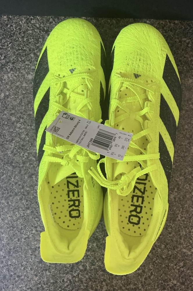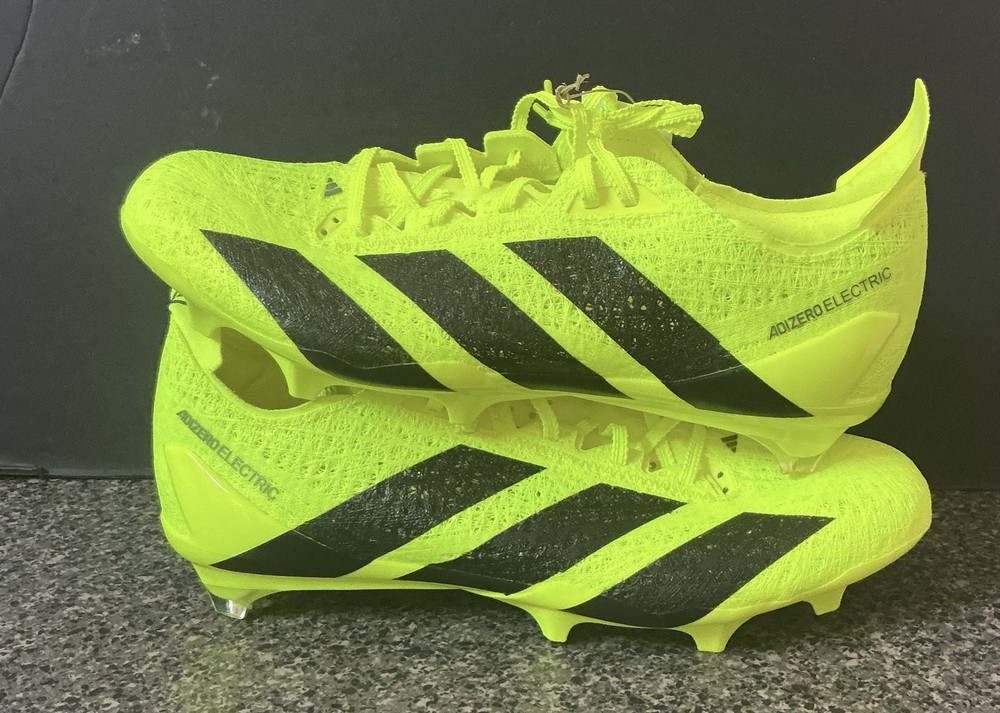 The product is a size 10 Adidas Adizero Strung Men's football cleats in yellow. These cleats are part of the Adidas Adizero product line and designed specifically for football players. They come in a unit quantity of 1 and are personalized with the Adidas brand logo. Perfect for players looking for high-quality, non-personalized cleats in a vibrant yellow color, these Adidas Adizero cleats are a great choice for serious athletes.
