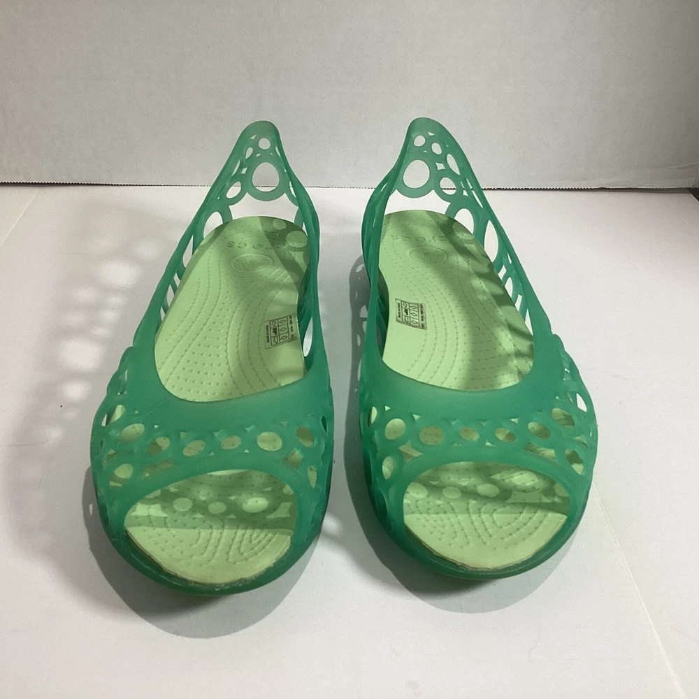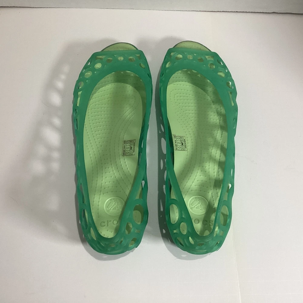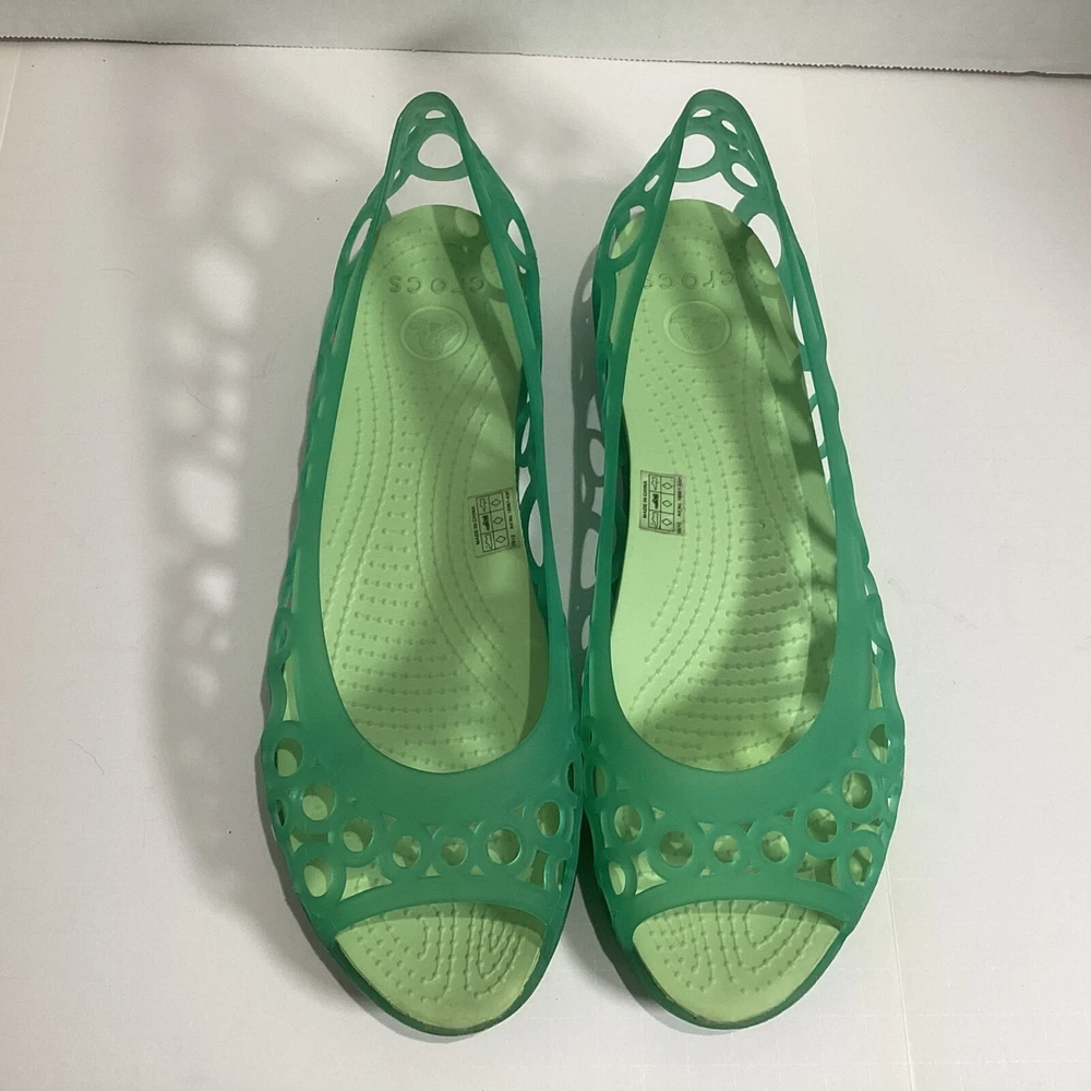 Size 10 Women’s Crocs Adrina Jelly Sandals Ballet Flats Open Toe Two Tone Green Please see photos for condition, quality and size details. Jelly flat with laser-cut upper featuring footbed with CrosLite material and circulation nubs Non-marking outsole 194C2/5/02253