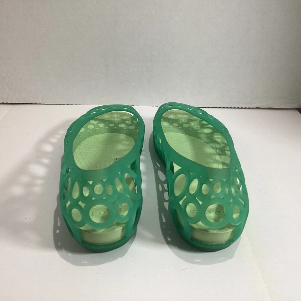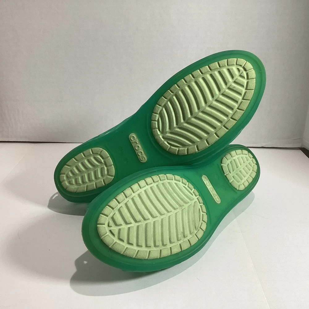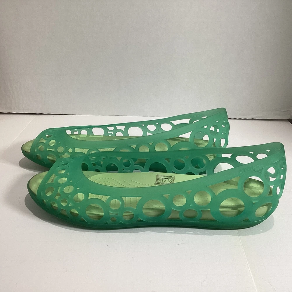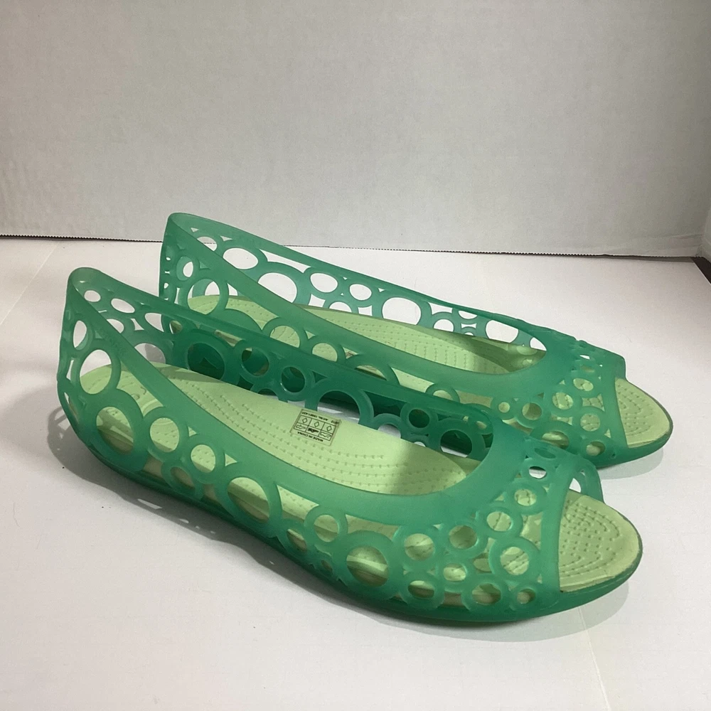 Size 10 Women’s Crocs Adrina Jelly Sandals Ballet Flats Open Toe Two Tone Green Please see photos for condition, quality and size details. Jelly flat with laser-cut upper featuring footbed with CrosLite material and circulation nubs Non-marking outsole 194C2/5/02253