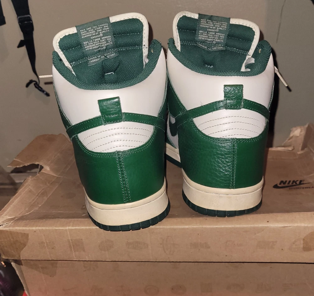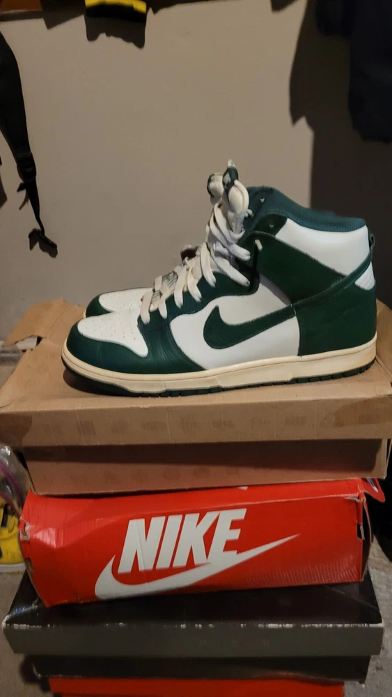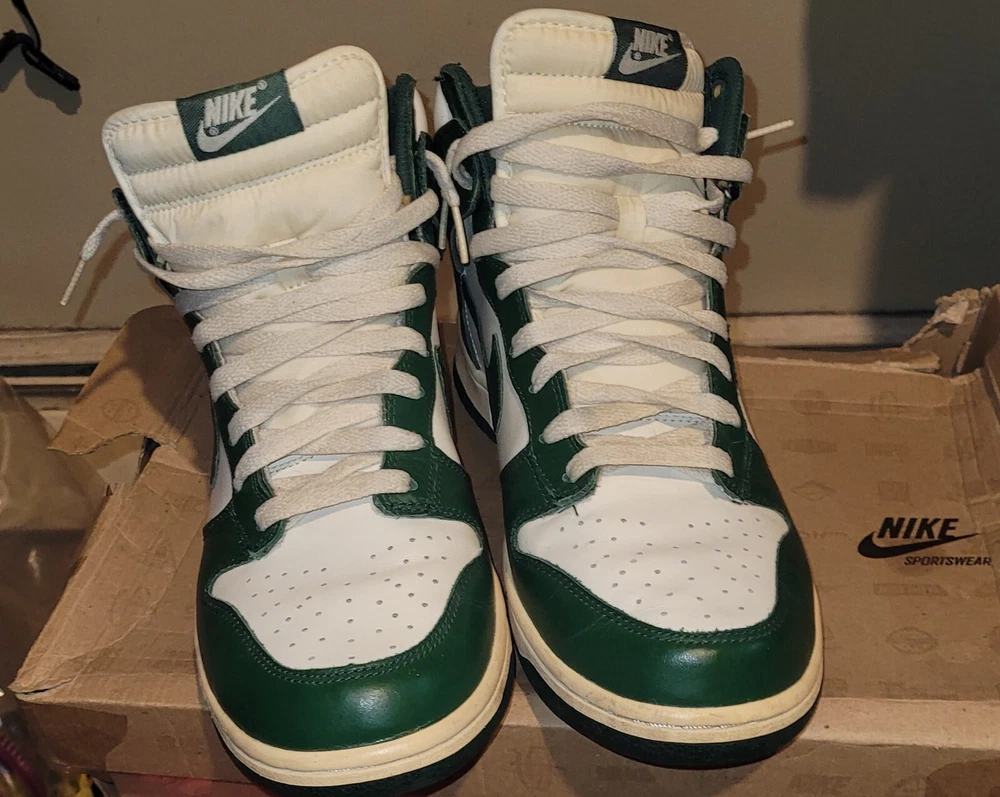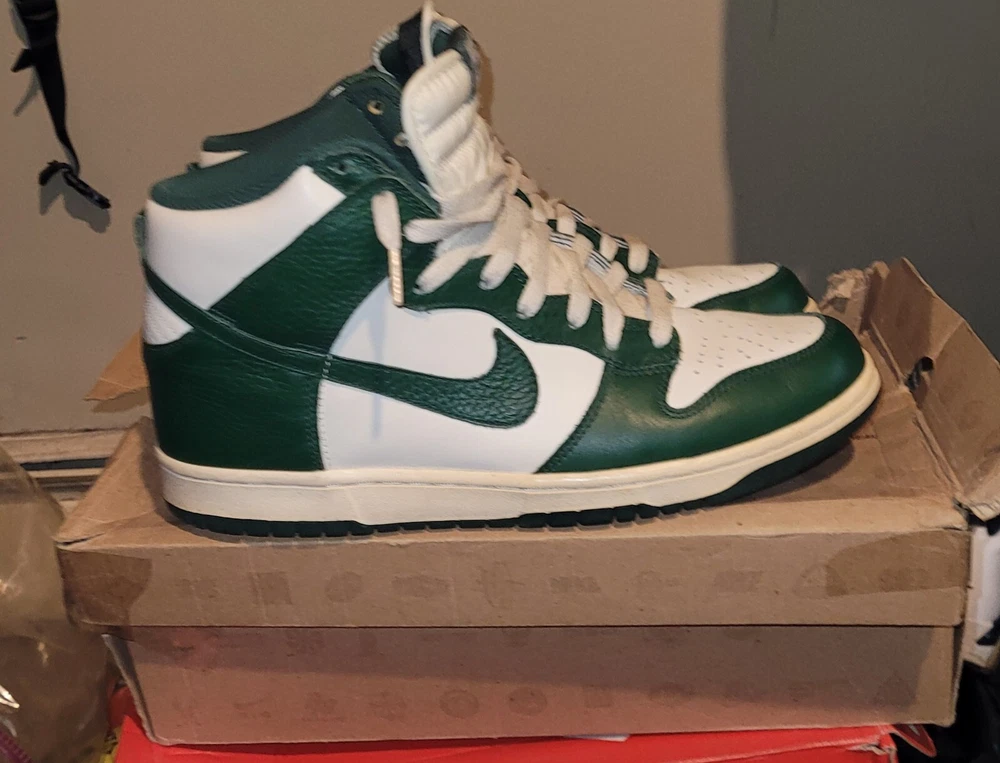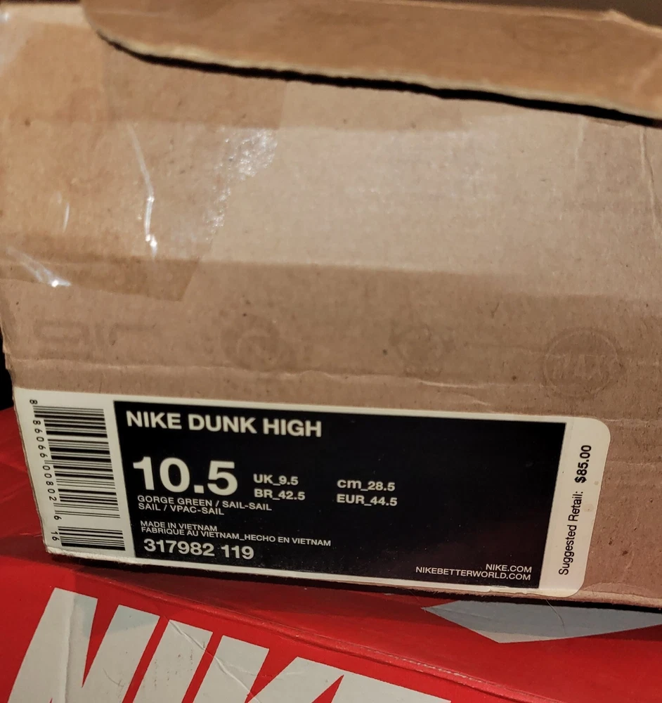 Release Date, 02-29-2012. SKU, 317982 119. Nickname, Gorge Green. Colorway, Gorge Green/Sail/Sail. Main Color, Green. Category, Lifestyle.Nike Dunk High Gorge Green used in amazing shape one owner. The box is in bad shape I posted pics of it but it is the original box they came in. Thanks for looking and have a good one.