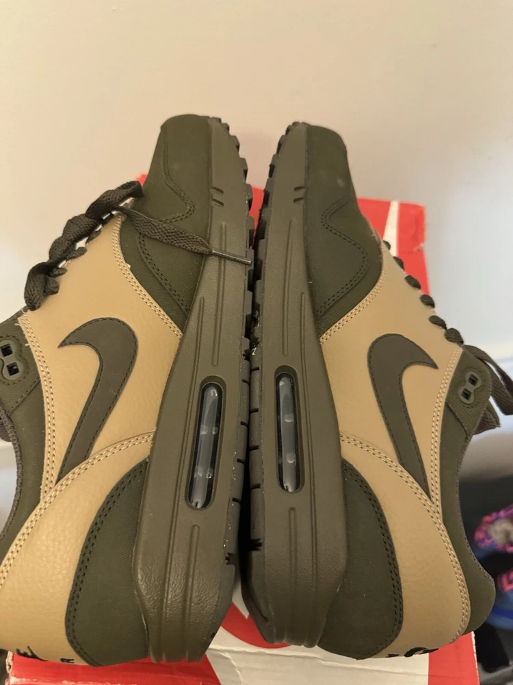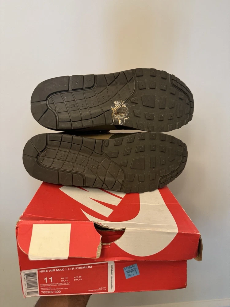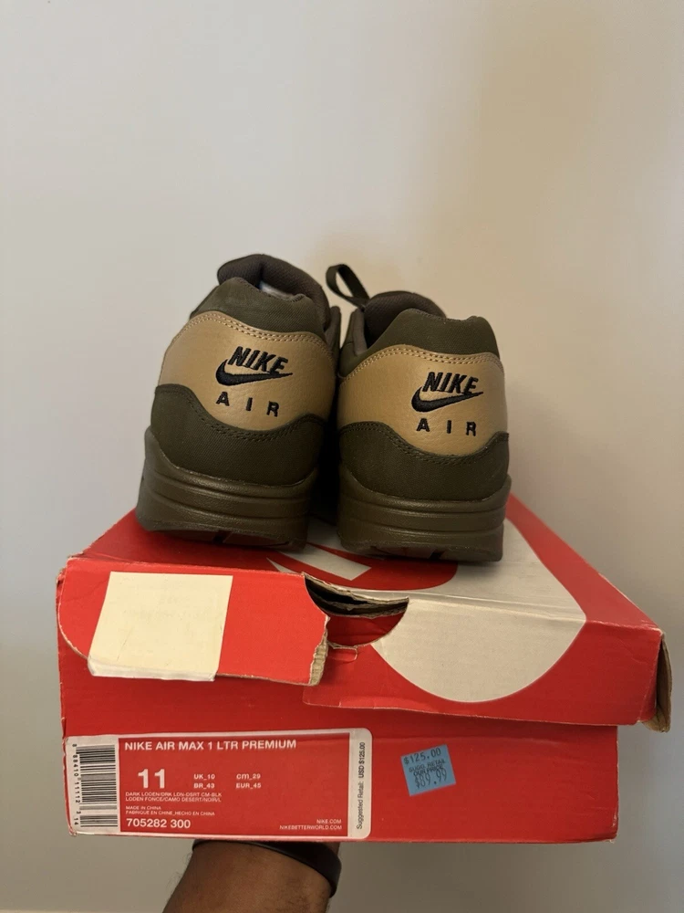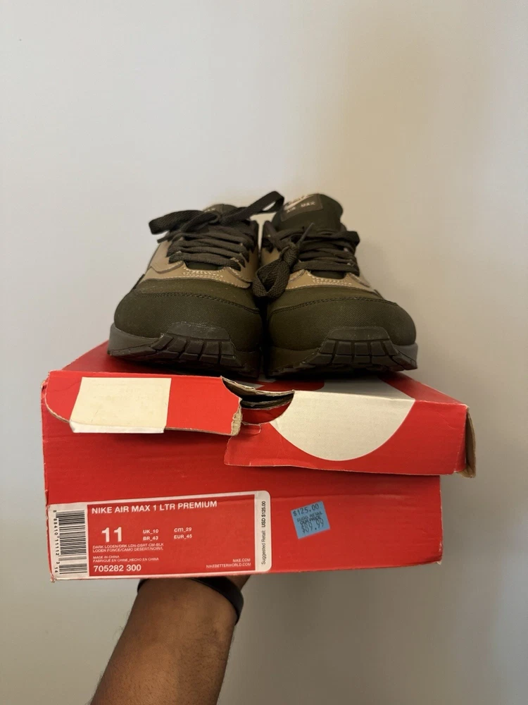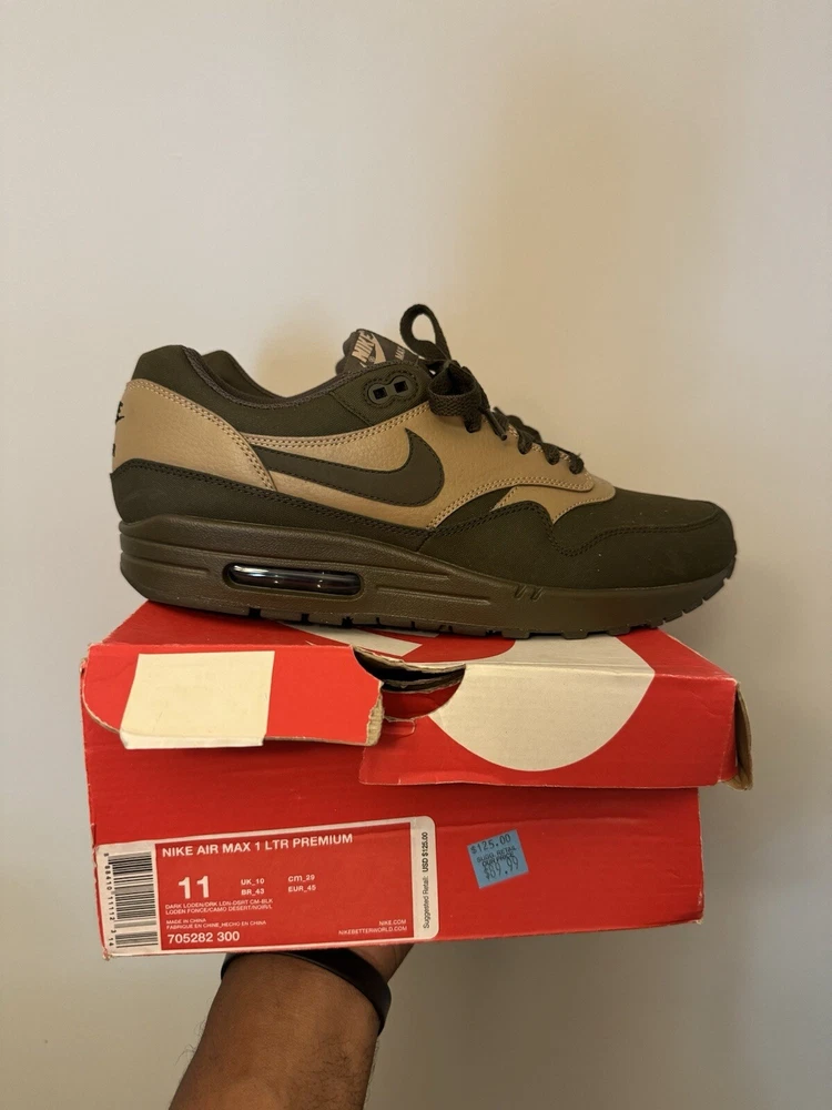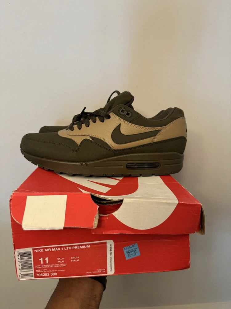 Elevate your shoe game with these Nike Air Max 1 LTR Premium sneakers in Dark Loden. Featuring a tie and lace-up closure, these shoes are perfect for any occasion from casual wear to workwear and even activewear. The cushioned insole and arch support provide comfort and breathability, making them ideal for gym and training activities, walking, boxing, cross-training, CrossFit, and running. These limited edition sneakers have a unique colorblock pattern in shades of green and a low-top shoe shaft style. The outsole is made of rubber for durability and the upper is made of leather for a premium look. These shoes are part of the Nike Air Max product line and have a style code of 705282-300. They were manufactured in 2015 and are available in US shoe size 11 and UK shoe size 10.