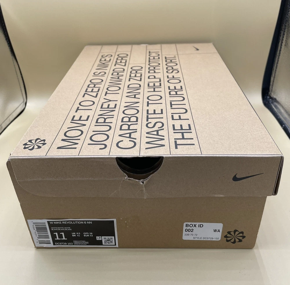 Style Code: DC3729-102 Department: Women Country/Region of Manufacture: Vietnam Type: Athletic Performance/Activity: Running & Jogging Insole Material: Foam Closure: Lace Up Style: Sneaker Shoe Width: Standard Shoe Shaft Style: Low Top Outsole Material: Rubber Vintage: No Brand: Nike Accents: Logo Pattern: Solid Occasion: Activewear, Casual, Workwear UK Shoe Size: 8.5 Features: Breathable, Comfort, Cushioned Upper Material: Synthetic Color: White Product Line: Nike Revolution Model: Nike Revolution 6 EU Shoe Size: 43 Season: Fall, Spring, Summer US Shoe Size: 11