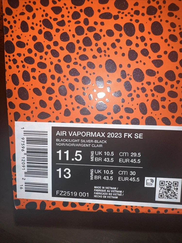 Style Code: FZ2519-001 Color: Black US Shoe Size: 11.5 Department: Men Type: Athletic Upper Material: FlyKnit Model: Nike Air VaporMax Brand: Nike Product Line: Nike Air VaporMax Style: Sneaker