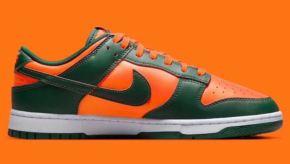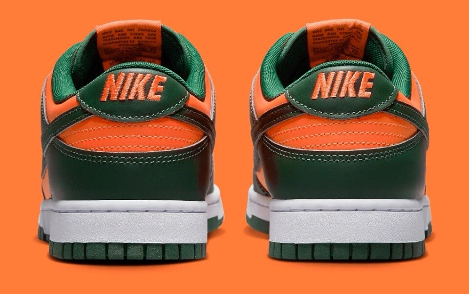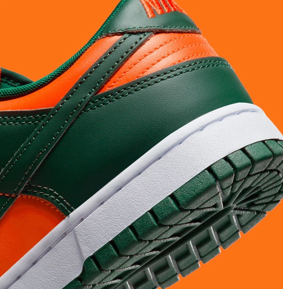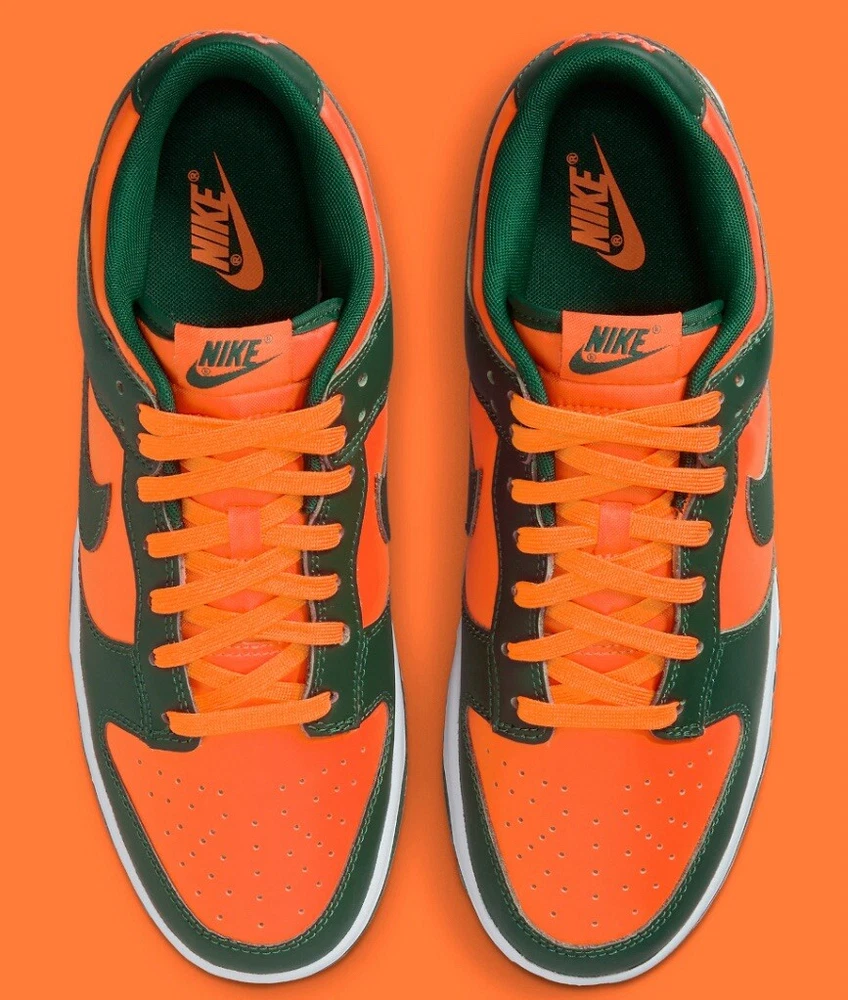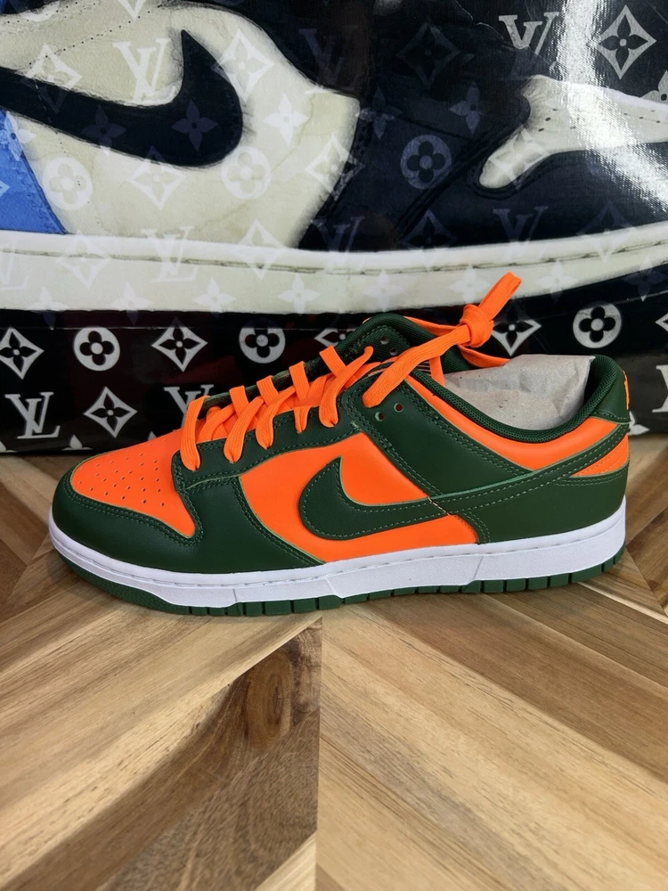 This Nike Dunk Low in size 12 features a green colorway inspired by the Miami Hurricanes with collaborations from Kith, Concepts, Supreme, Travis Scott. It is a limited edition sneaker with a cushioned comfort design, ideal for walking, skateboarding, or basketball. The shoe has a standard width, lace-up closure, low-top style, and is made of leather. Perfect for fans of college-themed footwear.