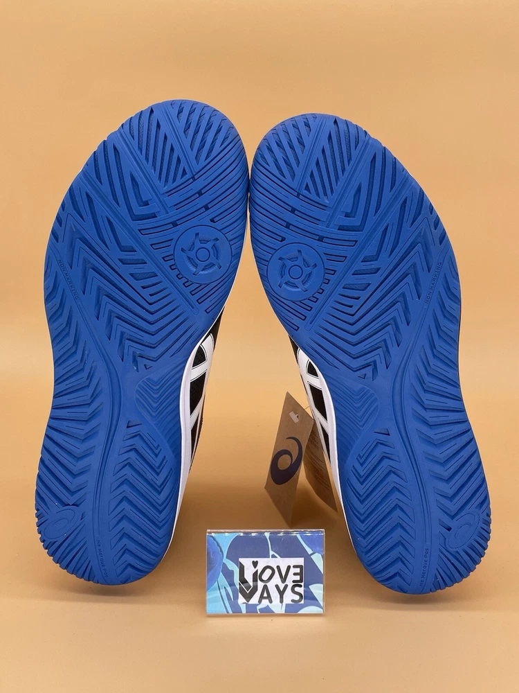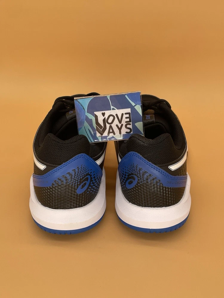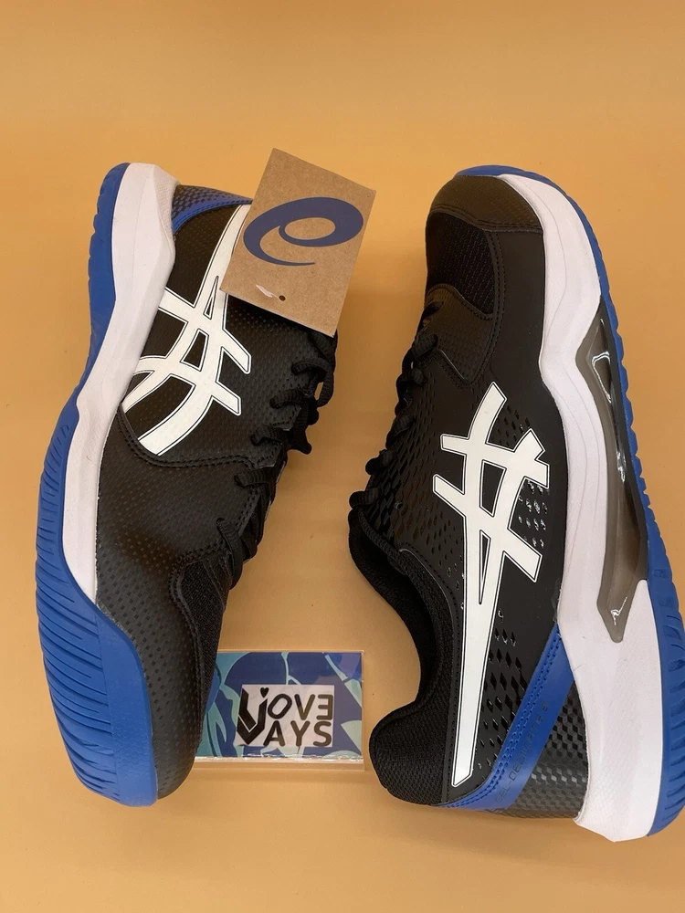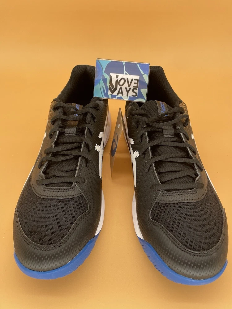 This is a pair of ASICS Gel Dedicate 8 men's running shoes in black with tuna blue accents. They are lace-up sneakers in size 13 (UK 12, EU 48) designed for activewear and casual occasions. The upper material is synthetic, suitable for summer, fall, and spring seasons. The style code is 1041A408-002, part of the ASICS Gel Dedicate product line.
