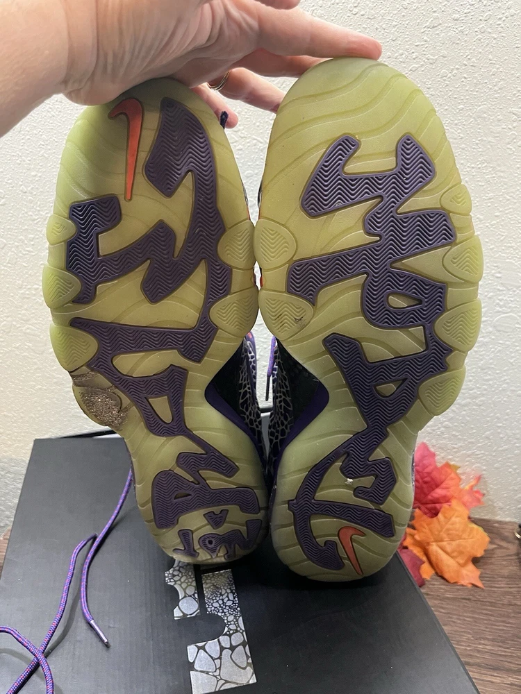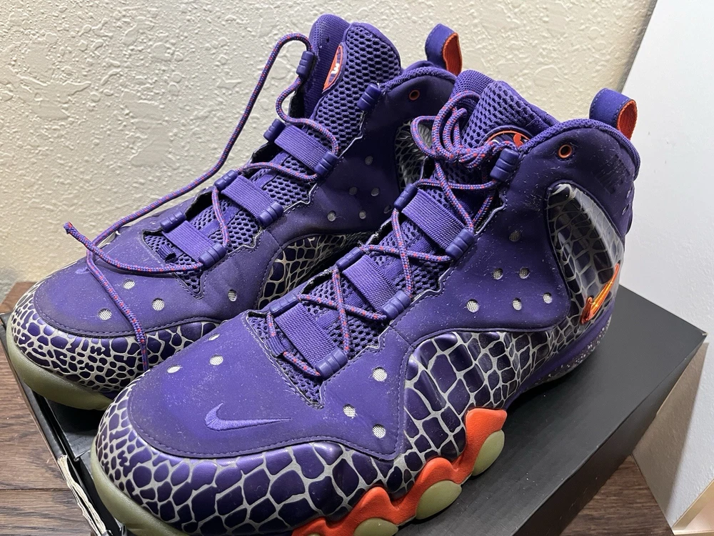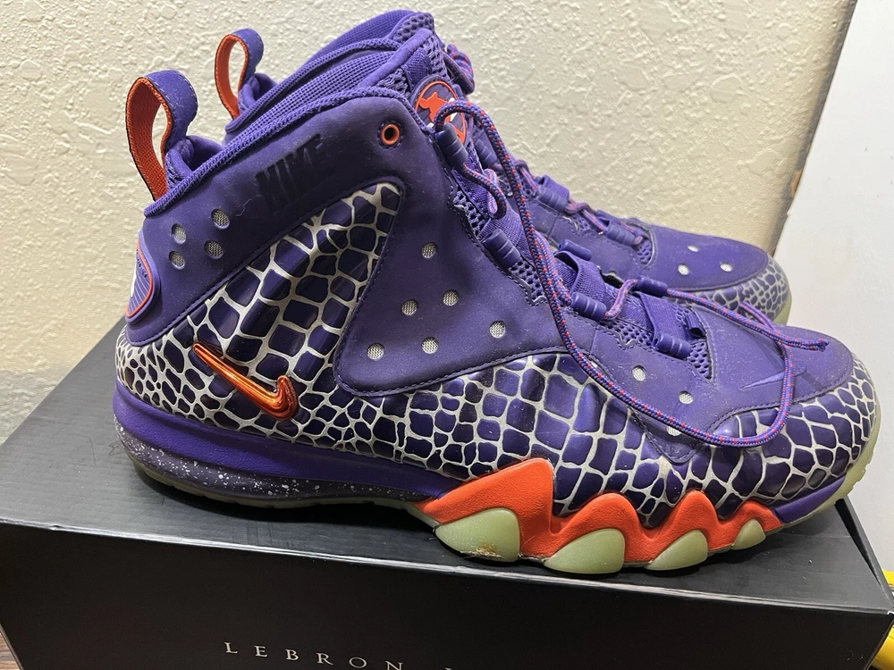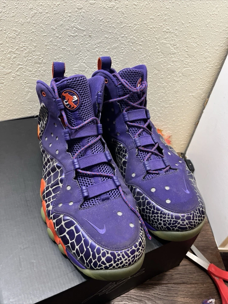 Elevate your sneaker game with these Nike Barkley Posite Max sneakers, featuring a striking purple colorway and Godzilla character design. These lace-up sneakers were released in 2013 and are a must-have for any sneakerhead. The size 14 shoes are made for men and are perfect for athletic activities. The Nike Barkley Posite Max sneakers are a popular choice for those who want to add a touch of style to their wardrobe. These sneakers are perfect for casual wear and are made with high-quality materials that ensure they last for a long time. Get your hands on these sneakers today and elevate your fashion game! Good sturdy, preowned shoes. bottoms could stand a good cleaning and the shoelace on the right hand shoe is broken. I do not have time to find replacement laces and this great collector shoe is offered at a highly discounted price.