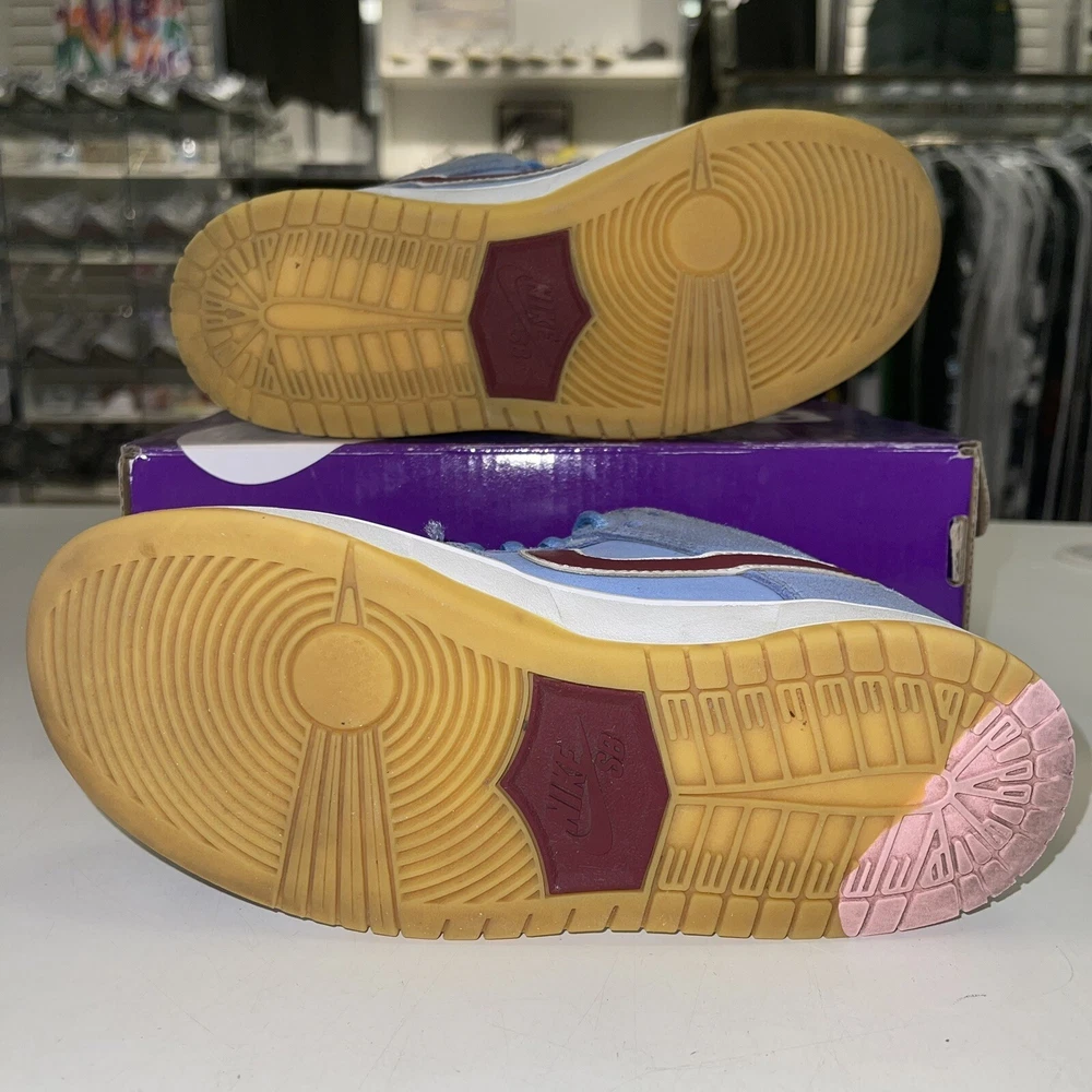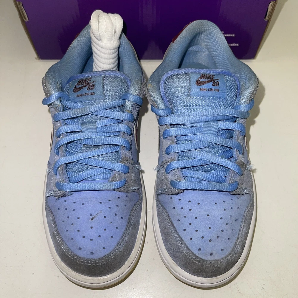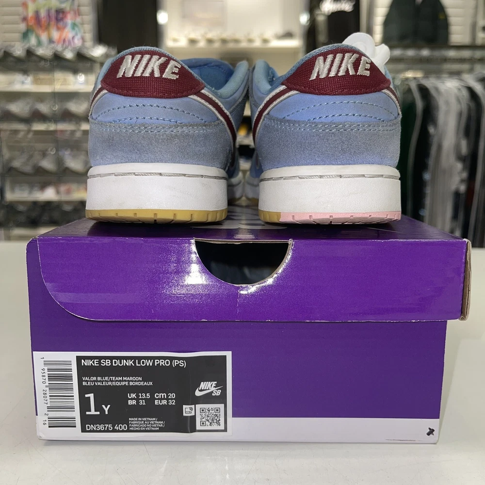 Step up your game with these Nike Dunk Low SB sneakers. The blue suede upper material and Philadelphia Phillies theme make these shoes a stylish choice for any young fan. The standard shoe width and lace-up closure provide a comfortable fit, perfect for both boys and unisex kids. These sneakers are designed for athletic performance and activity, specifically boxing. The low top shoe shaft style and Nike Dunk product line ensure that these shoes are of the highest quality. Don't miss out on the chance to own a pair of these popular sneakers, worn with the original box.