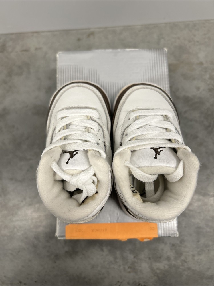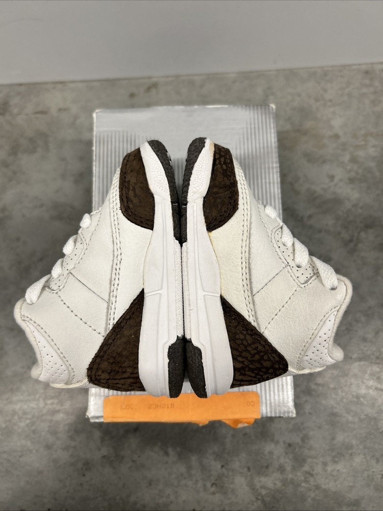 The product is a brand new pair of 2001 Baby Jordan 3 Retro Mocha sneakers in size 3C. These sneakers feature a solid brown color with a lace-up closure and rubber outsole for comfort. The shoes are made of leather fabric with logo accents, perfect for activewear occasions during the summer, fall, and spring seasons. This very rare item comes in its original box, making it a valuable addition to any baby or toddler's shoe collection.
