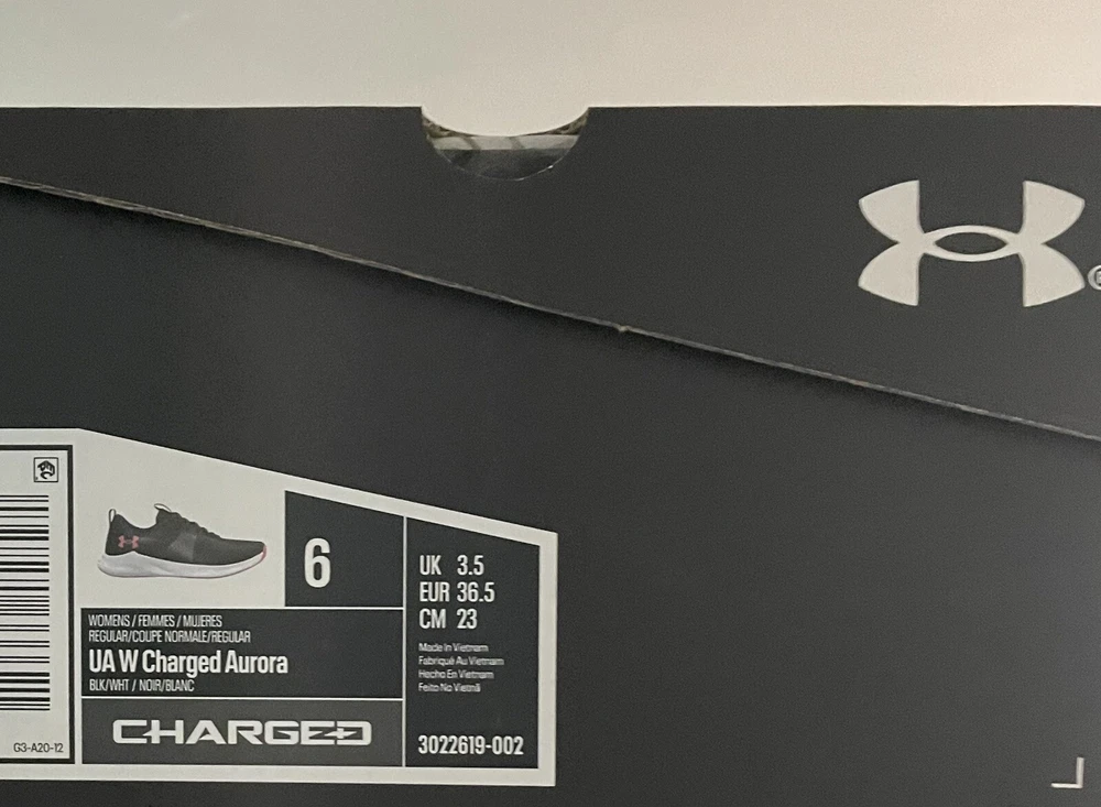 Features: Breathable, Comfort, Performance Shoe Width: Standard Season: Fall, Spring, Summer US Shoe Size: 6 Upper Material: Synthetic Type: Athletic Occasion: Activewear, Casual, Workwear UK Shoe Size: 3.5 EU Shoe Size: 36.5 Accents: Logo Country/Region of Manufacture: Vietnam Closure: Lace Up Model: Charged Aurora 2 Vintage: No Shoe Shaft Style: Low Top Performance/Activity: Gym & Training, Running & Jogging, Walking Color: Black Pattern: Solid Style Code: 3022619-002 Insole Material: Foam Product Line: Under Armour Charged Department: Women Style: Sneaker Outsole Material: Rubber Brand: Under Armour