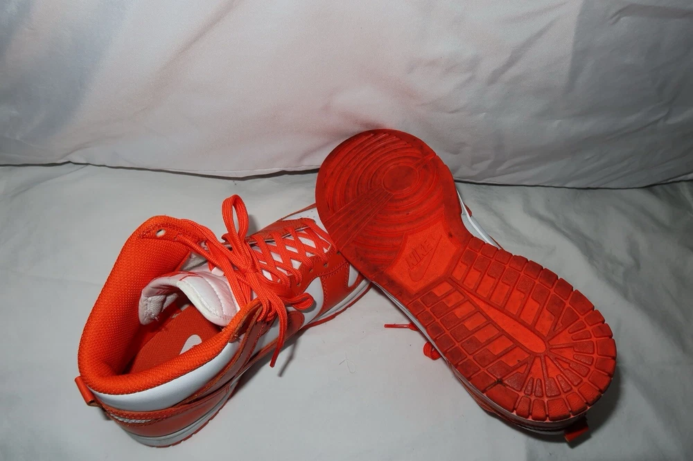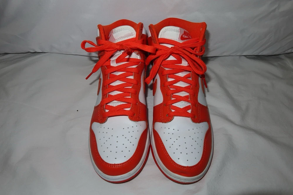 This Nike Dunk SP 2021 High Syracuse sneaker in size 6.5 features a High Top shoe shaft style in a vibrant White/Orange Blaze colorway. Worn twice