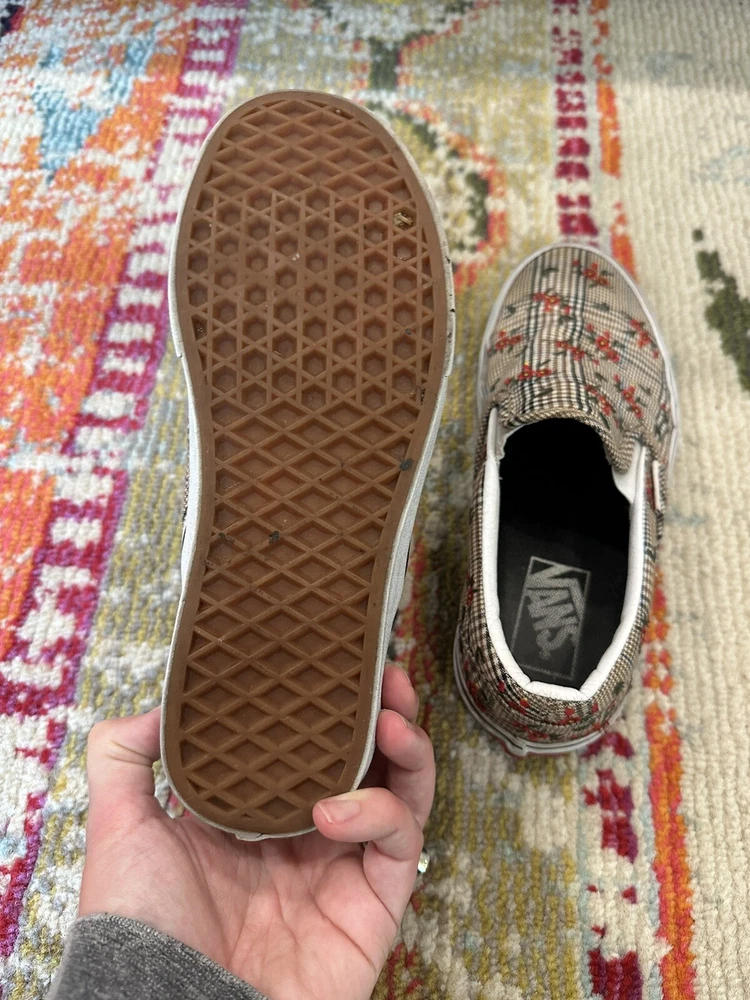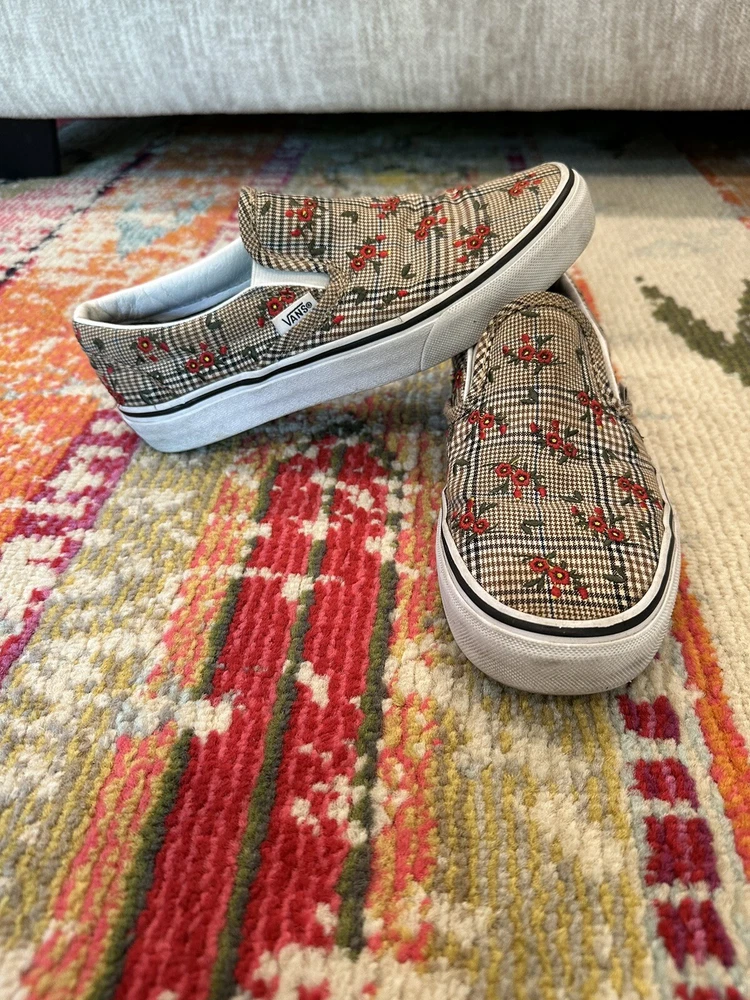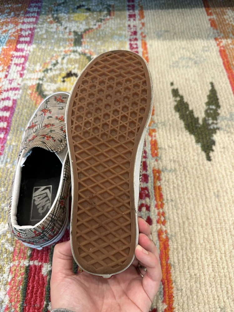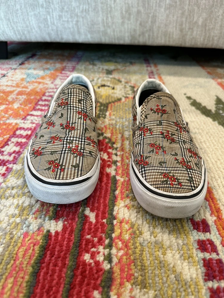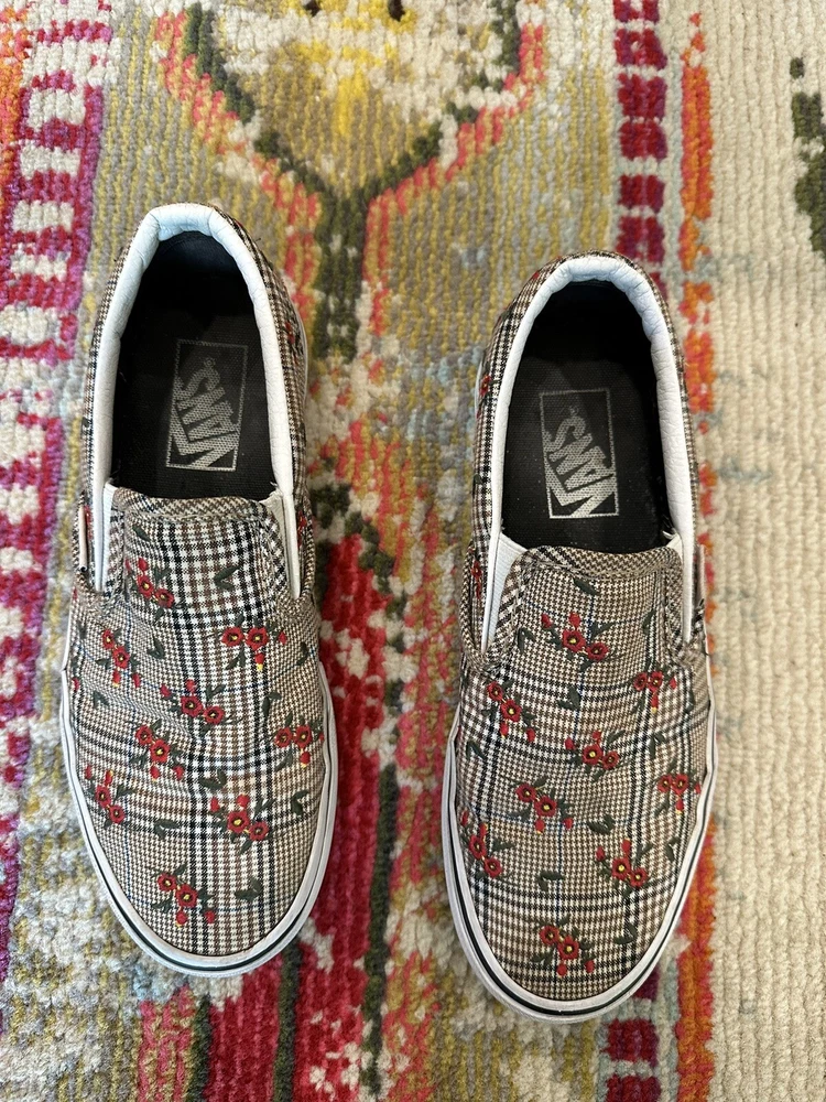 Elevate your casual look with these VANS Authentic sneakers in a size 6.5. The Glen Plaid Floral Embroidery adds a touch of elegance to the classic design, making them perfect for any occasion from activewear to casual outings. The slip-on style and low-top shoe shaft make them easy to wear and comfortable for all-day use. These sneakers are made with breathable fabric and feature a cushioned insole for added comfort. The rubber outsole provides durability for walking, beach activities, school, or even skateboarding. These VANS Authentic sneakers are a must-have for any shoe collection and are sure to become a favorite.