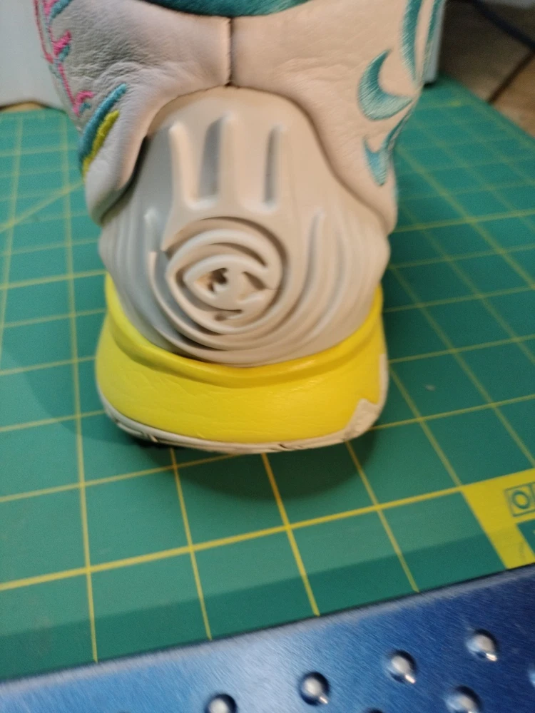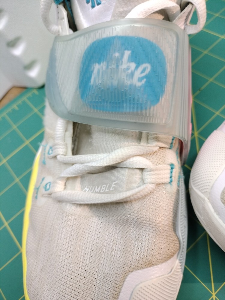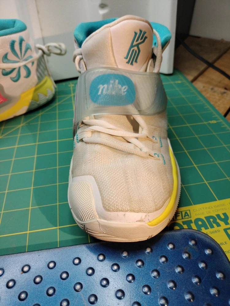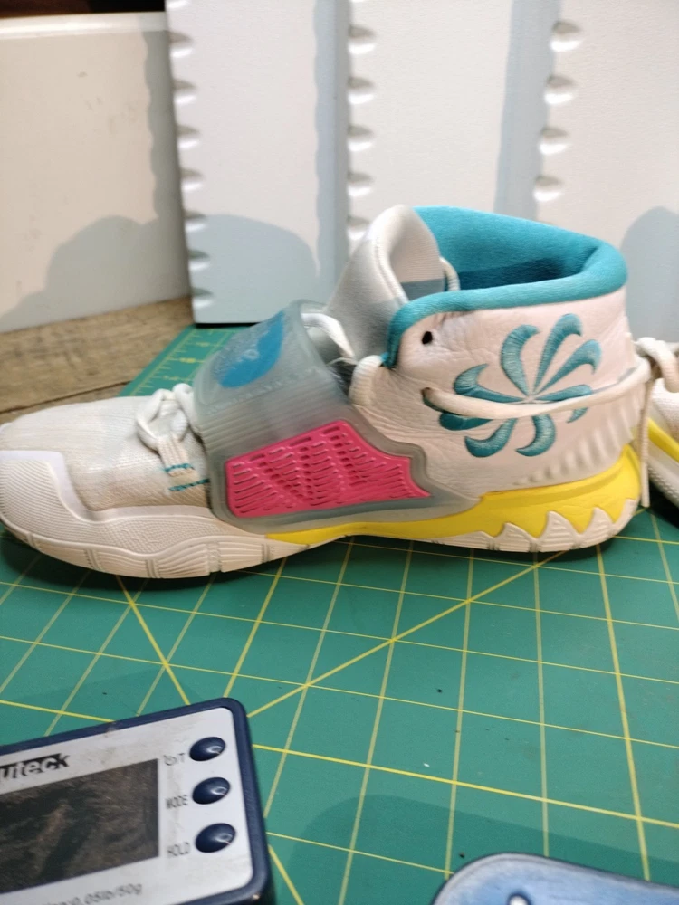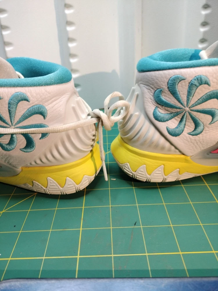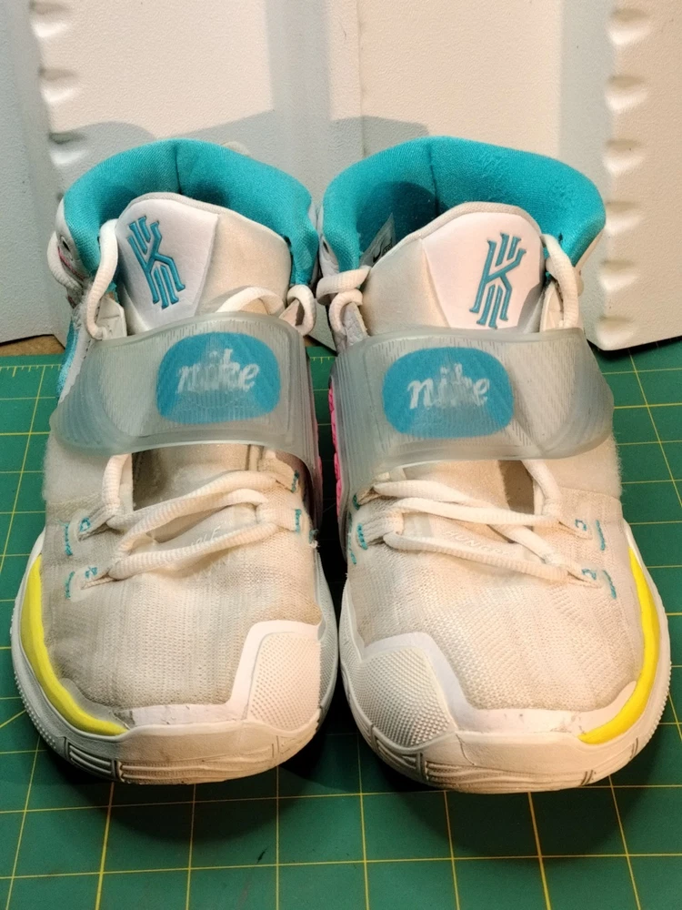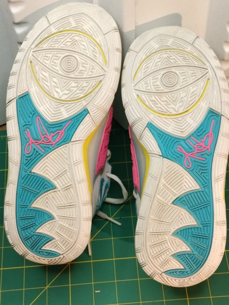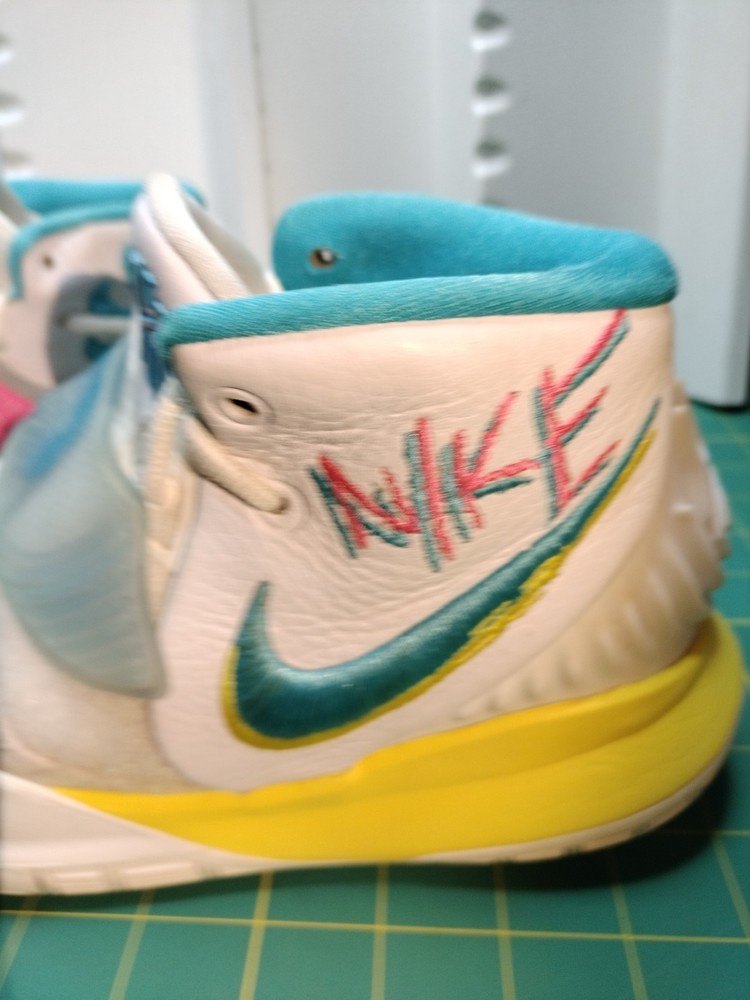 The product is a pair of Nike Kyrie 6 Mid sneakers in size 6.5Y, featuring a vibrant neon graffiti design in pink, blue, and yellow colors. These athletic shoes have a mid-top shoe shaft style and are part of the Nike Kyrie product line. The sneakers are designed for unisex kids and offer a stylish and comfortable option for play or casual wear. . Pre owned..light Wear as seen in pics.. good condition.. Fast shipping...