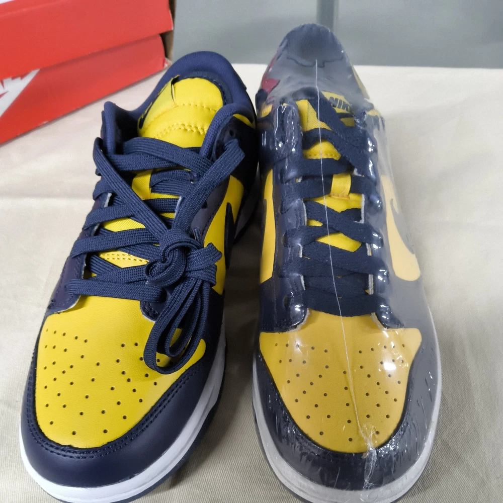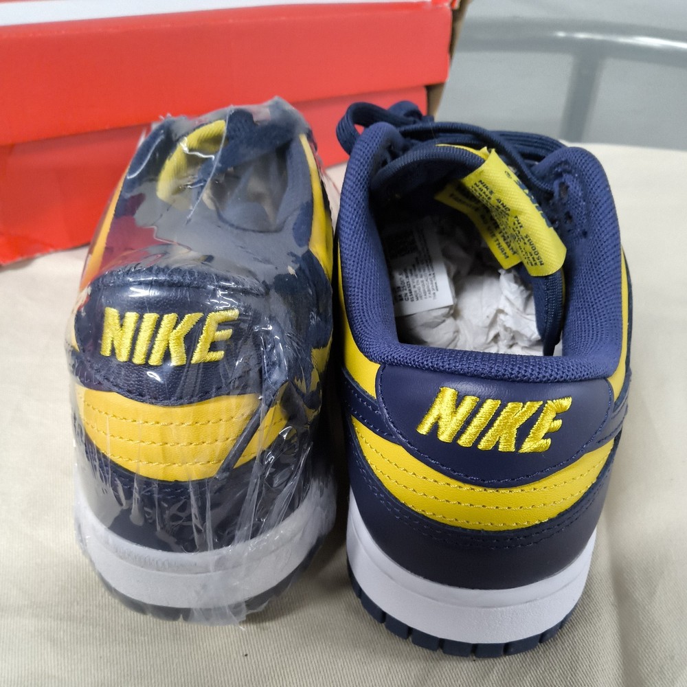 This is a size mismatched pair. The Nike Dunk Low Michigan 2021 in size 7 is a stylish and athletic sneaker perfect for men. This shoe features a low top design, leather upper material, and a multicolor colorway specific to the Michigan theme. Released in 2021, this Nike Dunk model is part of the iconic Nike Dunk product line, known for its quality and fashionable design. Ideal for sports or casual wear, this sneaker combines comfort and style in one sleek package.