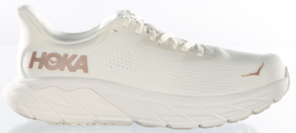 These Hoka One One Arahi 7 sneakers for women in white with rose gold accents are lace-up athletic shoes featuring cushioned comfort, adjustable fit, and breathable synthetic upper material. With a low-top shoe shaft style, they are designed for gym, walking, and running activities in all seasons. The sneakers are in US size 7, UK size 5.5, and EU size 37.