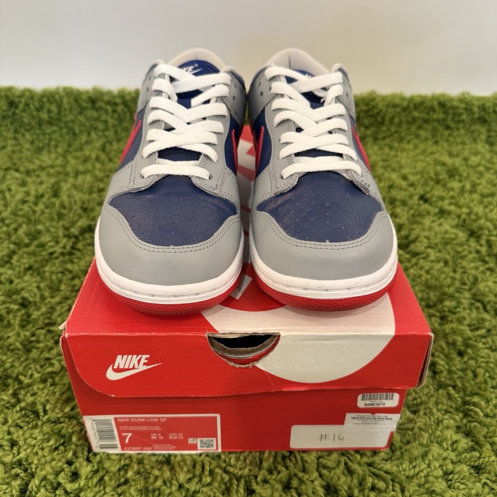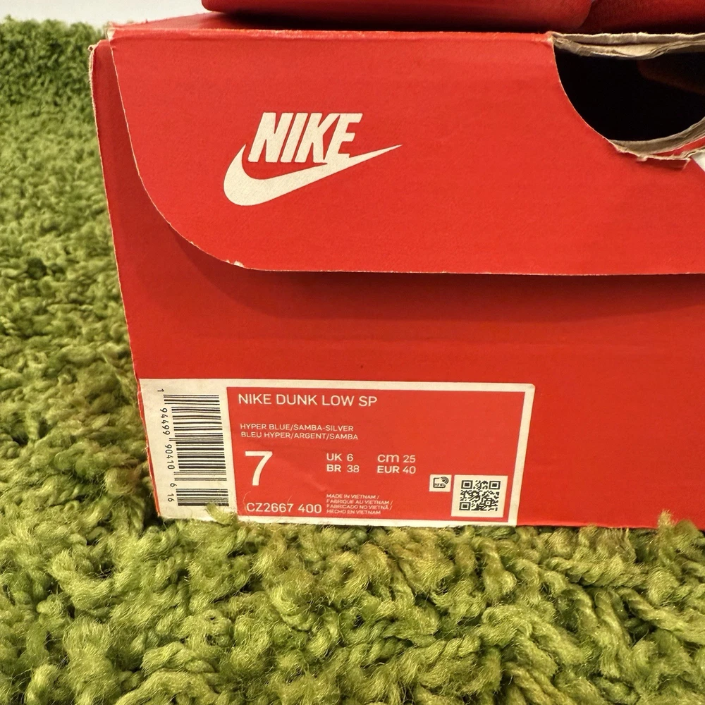 You a re b uy ing a pair of NIKE DUNK LOW RETRO SHOES MODEL : NIKE DUNK LOW RETRO "SAMBA" COLORWAY: Hyper Blue/Samba-Silver SIZE: Mens US 7 released in 2020 CZ2667-400 CONDITION: VNDS. WORN ONCE. MINT CONDITION. INFO: The Nike Dunk Low CO.JP Samba comes during the Swoosh’s resurgence of the traditional basketball silhouette. Just like the Nike Dunk Plum that dropped earlier in 2020, the Co.JP Samba originally released exclusively in Japan back in 2001. 2020 marks the first time the sneaker receives a retro treatment. The Nike Dunk Low CO.JP Samba features an entirely leather upper. Hits of Samba Silver and Hyper Blue dress the Dunk Low model. True Red outsole, Nike Swoosh and back tab add contrast to the upper. A hidden detail can be found in the swoosh itself, displaying a weave-like pattern. These sneakers released in August of 2020