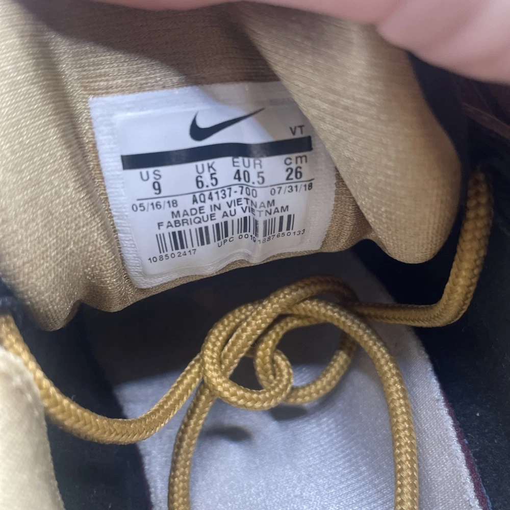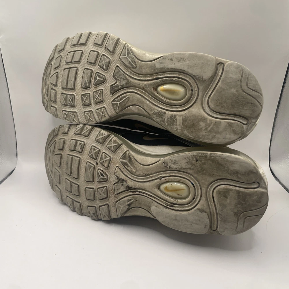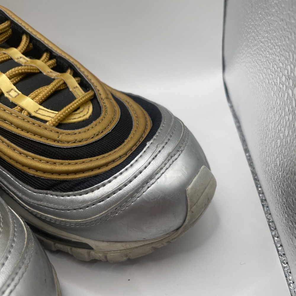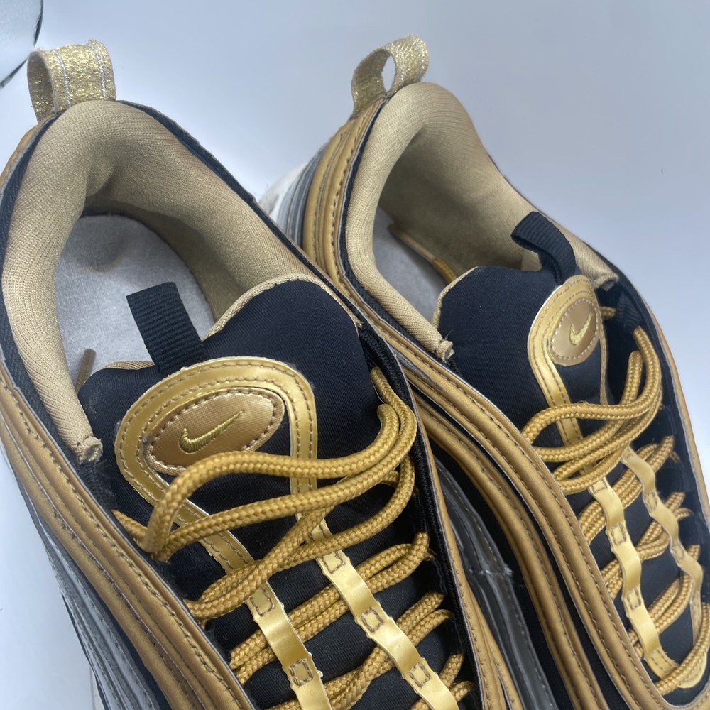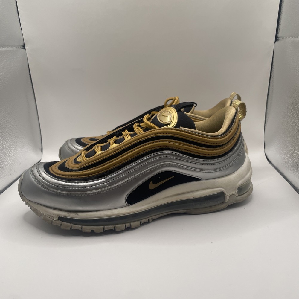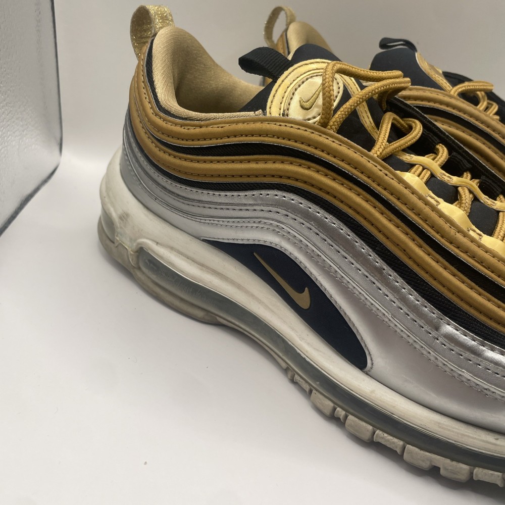 The Nike Air Max 97 Metallic Gold W in size 9 is a stylish and sporty athletic sneaker for women. Released in 2018 as part of the Nike Air Max product line, this shoe features a shimmering gold colorway with metallic accents. With the iconic Nike Air Max 97 model and comfortable sneaker style, this shoe is perfect for those looking to make a statement while staying active. The size 9 fit ensures a comfortable and secure feel for all-day wear.