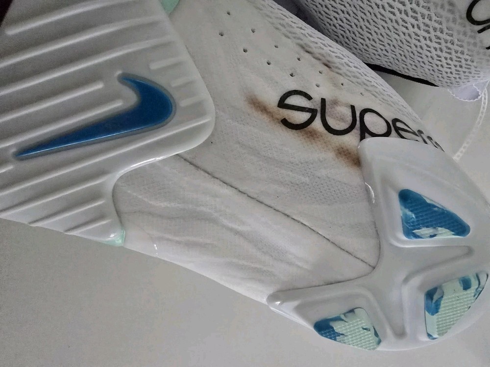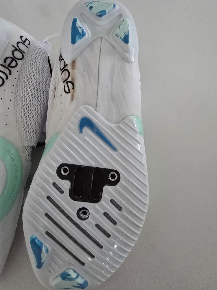 The product is a pair of Nike SuperRep Cycle 2 sneakers in a white and mint foam colorway, designed for women. With a size 9 and a hook & loop closure, these cycling shoes feature an adjustable strap and are made with mesh upper material for breathability. Specifically designed for cycling, these sneakers from the Nike SuperRep product line offer style and performance for active women. Shoes do have a brown stain near the bottom (shown in pictures) that appears to be from the manufacturing process. Ready to use with your cycling cleats!