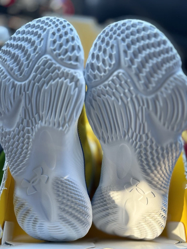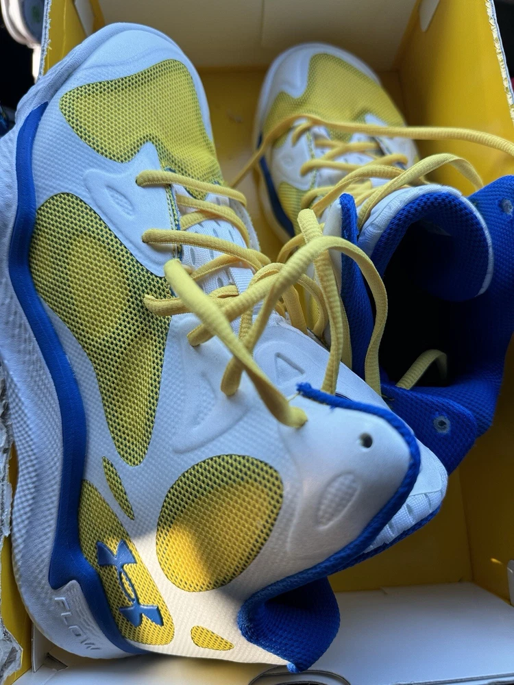 Elevate your game with these Under Armour Curry FloTro Dub Nation sneakers. Designed with the input of Stephen Curry himself, these shoes feature a white blue and yellow colorway and are perfect for any athletic activity. The size 9 sneakers are ideal for men and come in a UK size 8 and EU size 42.5. Crafted with high-quality materials, these sneakers are durable and comfortable. The style code for this shoe is 48408959 and it belongs to the Under Armour Stephen Curry product line. Whether you're hitting the court or the streets, these sneakers are sure to turn heads.