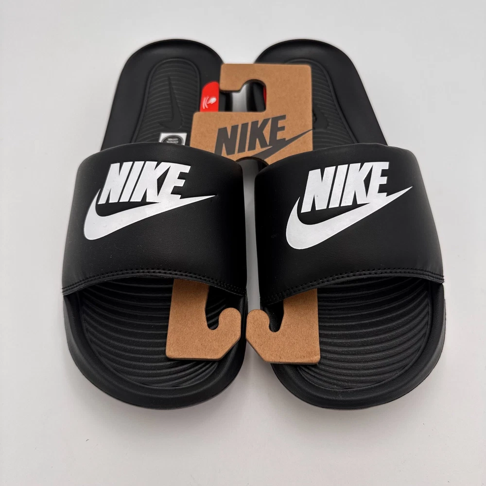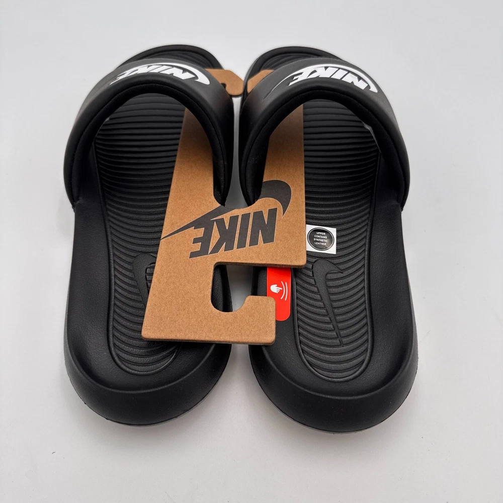 Size 9W Nike Victori Slide Slip On Black/White - CN9677-005 BRAND NEW Elevate your casual style with these chic Nike Victori Slide slip-on sandals. Featuring a synthetic upper material, these black sandals with white accents are perfect for any woman on the go. The slip-on closure provides easy wear, making them perfect for those lazy summer days. These sandals are a must-have for any fashion-forward woman and are perfect for any occasion. The size 9W fits comfortably, and the stylish design is sure to turn heads. Don't miss out on the opportunity to add these Nike Victori Slide slip-on sandals to your shoe collection. FAST AND FREE SHIPPING FEEL FREE TO REACH OUT WITH QUESTIONS OR CONCERNS
