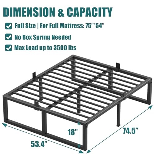 Return Policy Fast Delivery Trusted seller Full Size Bed Frame, 18 Inch Heavy Duty Support 3500 lbs Metal Platform, No Box Spring Needed/Noise Free/Non-Slip/Steel Slat Support/Easy Assembly Product Description Heavy Duty Bed Frame:The full size bed frame is made of alloy steel with reinforced legs designed to prevent structural distortion and support up to 3500 lbs of weight Non-slip Design:The steel slats comes with four strips of tape to effectively reduce mattress slippage.The foot plug added to the bottom of the bed frame support foot prevents the bed frame from sliding and protects your floor from being scratched Easy Assembly:All assembly tools and instructions are packaged with the twin size bed frame,and it takes 15 minutes to complete the installation according to the instructions No Box Spring Needed:The bed frame with strong and durable steel slats will support and extend the life of your latex,memory foam or innerspring mattress without the need for a box spring.Steel slats with four strips of tape effectively reduce mattress slippage Under-bed Storage:18-inch high full bed frame with 16-inch high storage space under the bed.Provides convenient storage space for your out-of-season clothes,shoes,etc Shipping Returns Payment Shipping Shipping is FREE to all addresses other than APO/PO boxes in the lower 48 states. All our stock ships from US-based warehouses. Shipped via USPS or UPS (depending on location and package weight) Unless stated otherwise, all orders will ship within 24-72 hours of your payment being processed. Check our feedback to see the great reviews of FAST shipping we offer. Returns Seller does not accept returns Payment We currently accept payment via eBay managed payments only. Once payment is cleared, we will dispatch your shipment within 1-3 business days. Please refer to the "Shipping" tab for more information regarding shipping speed to your destination.