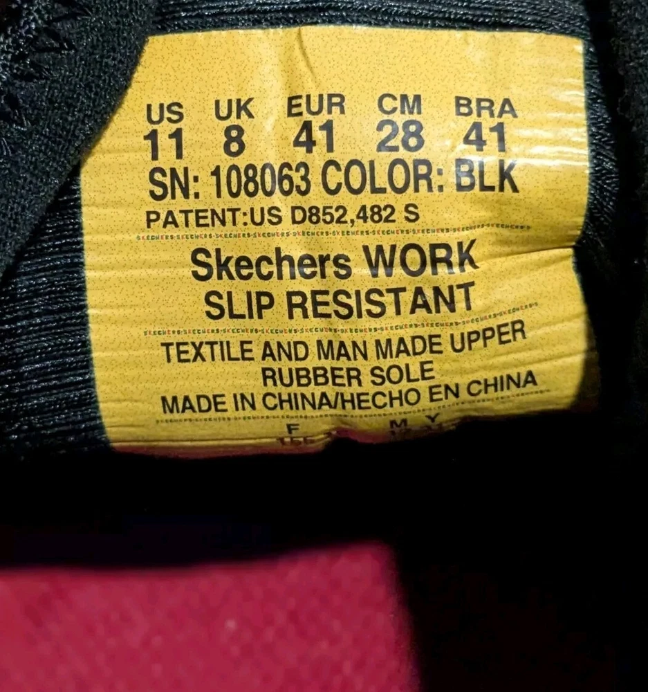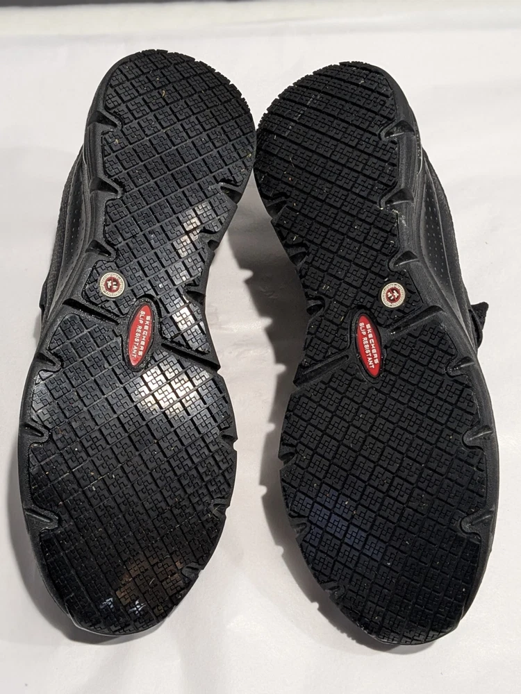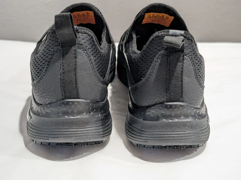 Skechers Arch Fit Slip-On work shoes for women in black, size 11 (UK 8, EU 41). Features include slip-resistant outsoles, W width, synthetic upper material, and Arch Fit technology for comfort. The model number is 108063W.