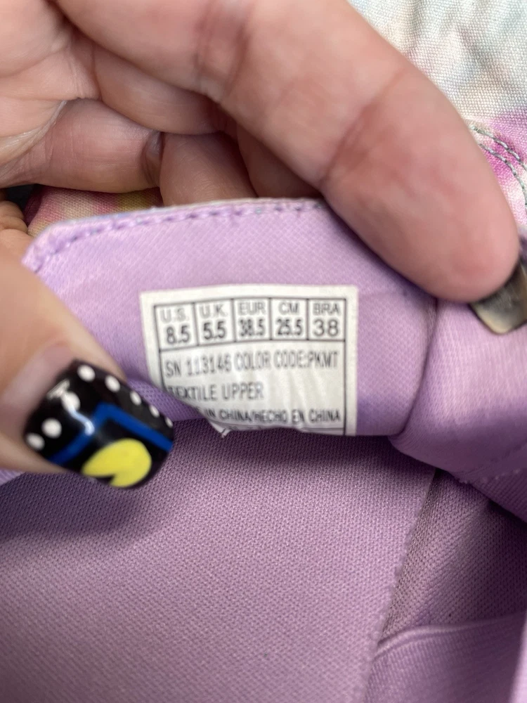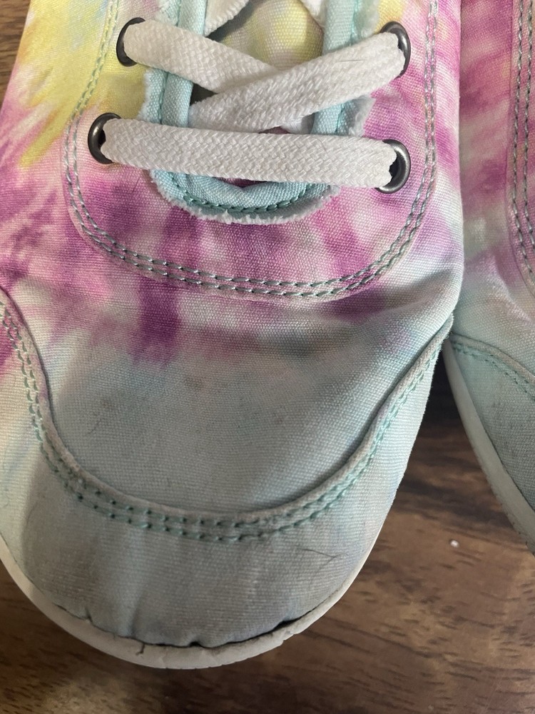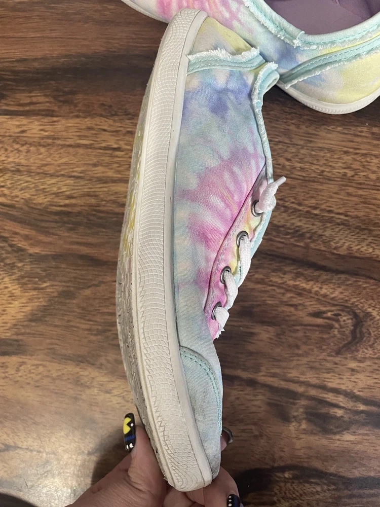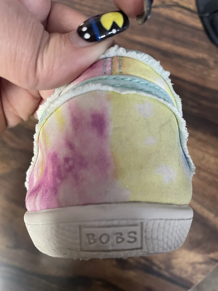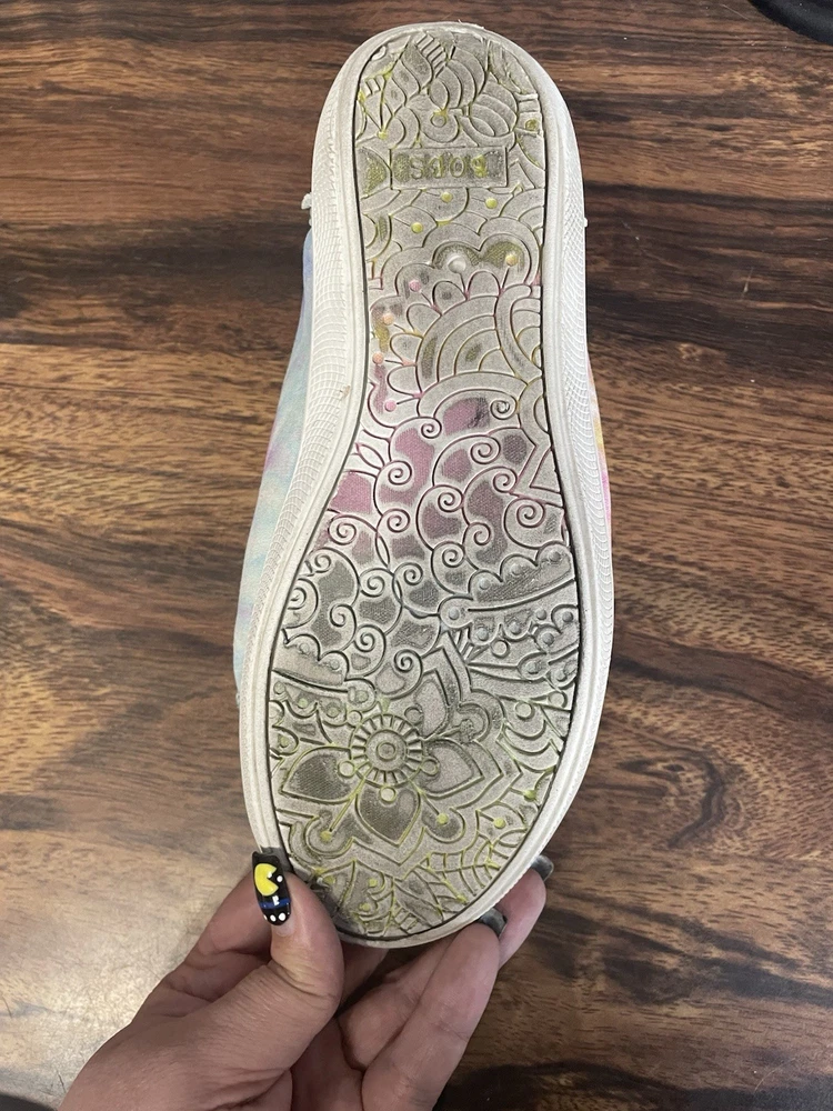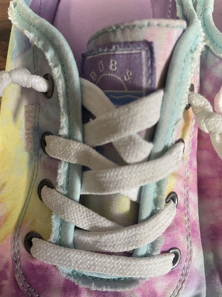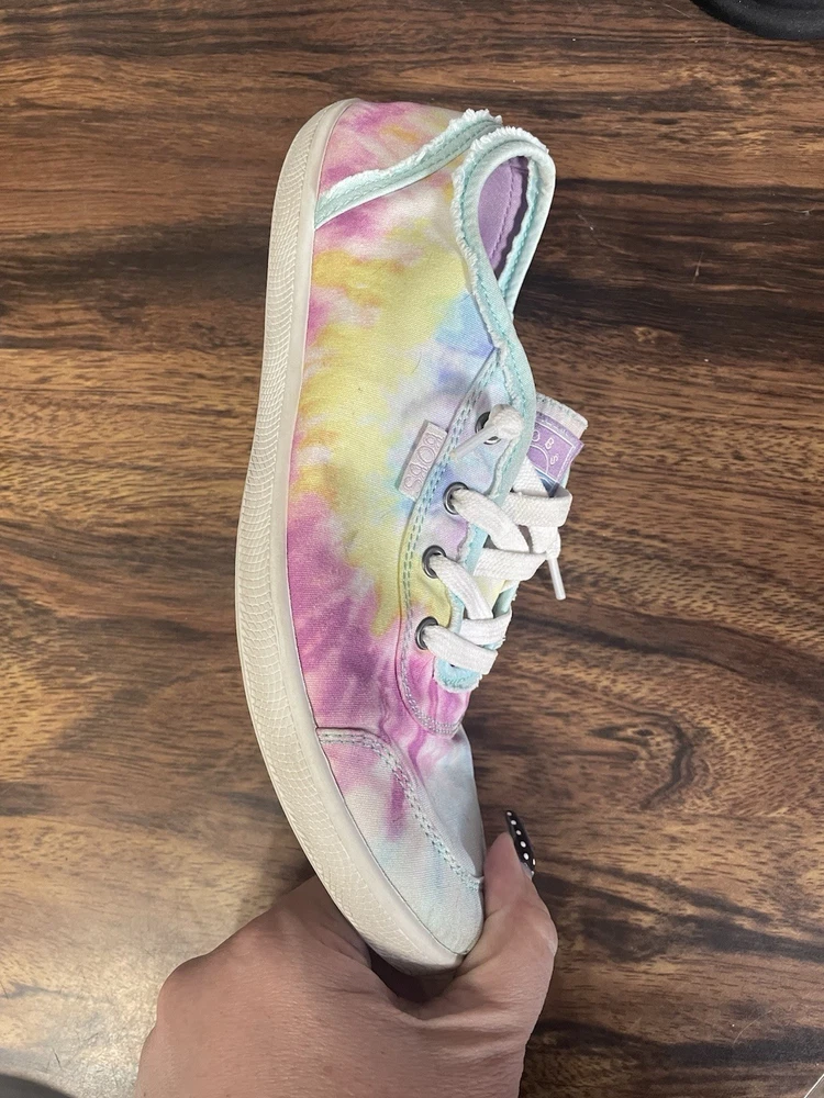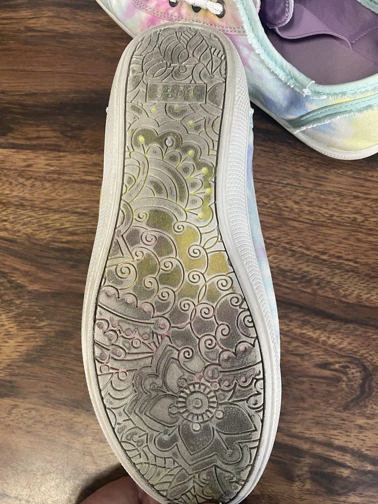 The Skechers Bobs Women's Size 8.5 Tie-Dye Sneakers with Memory Foam are a colorful and stylish pair of athletic shoes. Featuring a standard shoe width and synthetic upper material, these sneakers offer comfort and durability. The memory foam insole provides additional cushioning for all-day wear, while the tie-dye pattern adds a fun and vibrant touch. Perfect for adding a pop of color to your workout or casual outfit, these Skechers Bobs sneakers are a fashionable and functional choice for women looking for both style and comfort in their footwear. These shoes are lightly used with normal wear and tear.