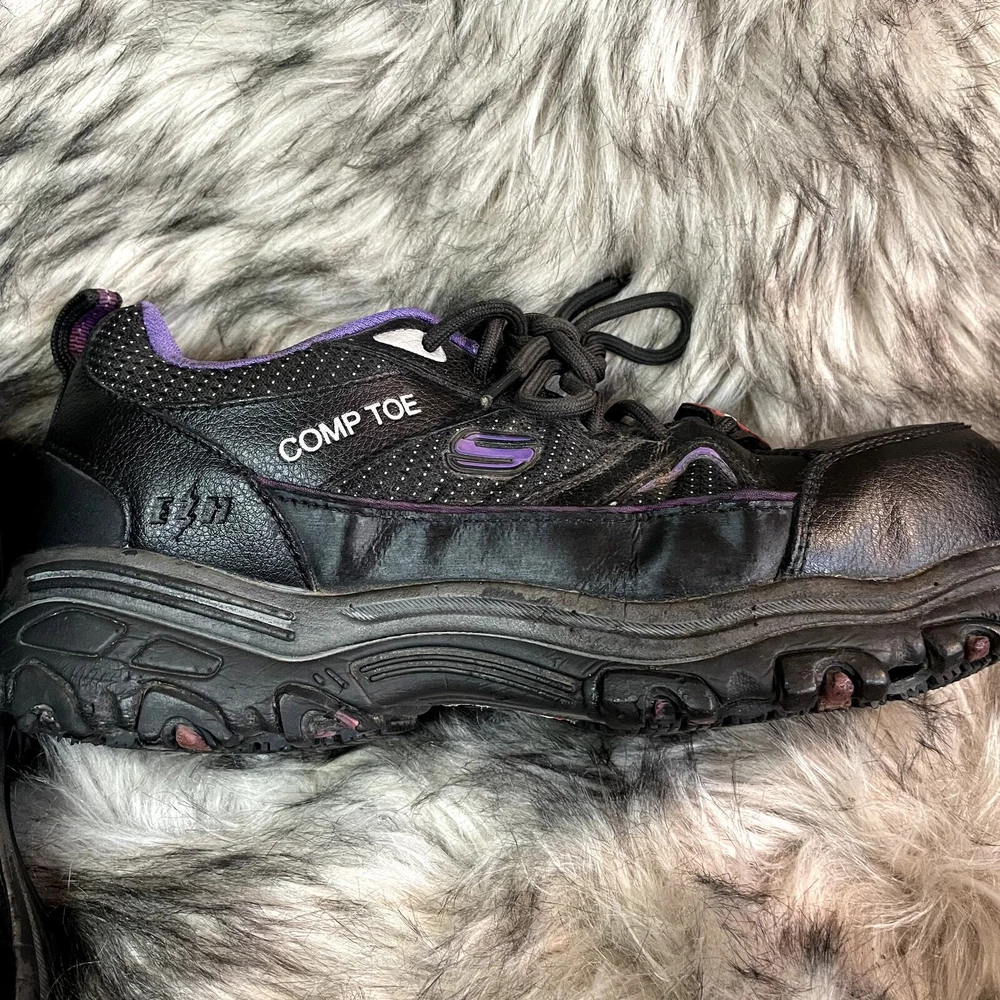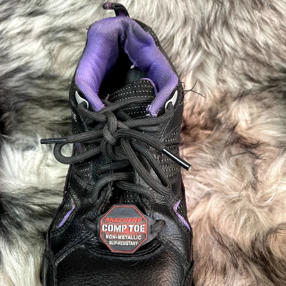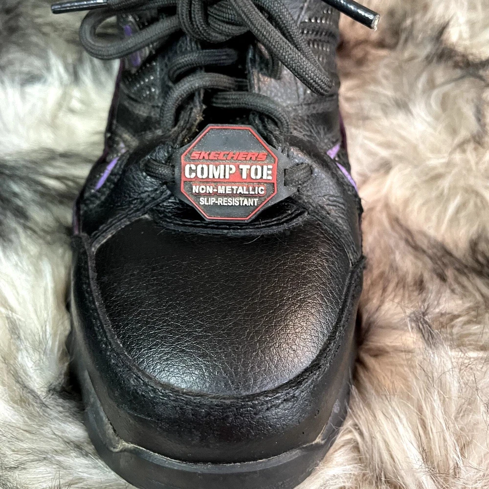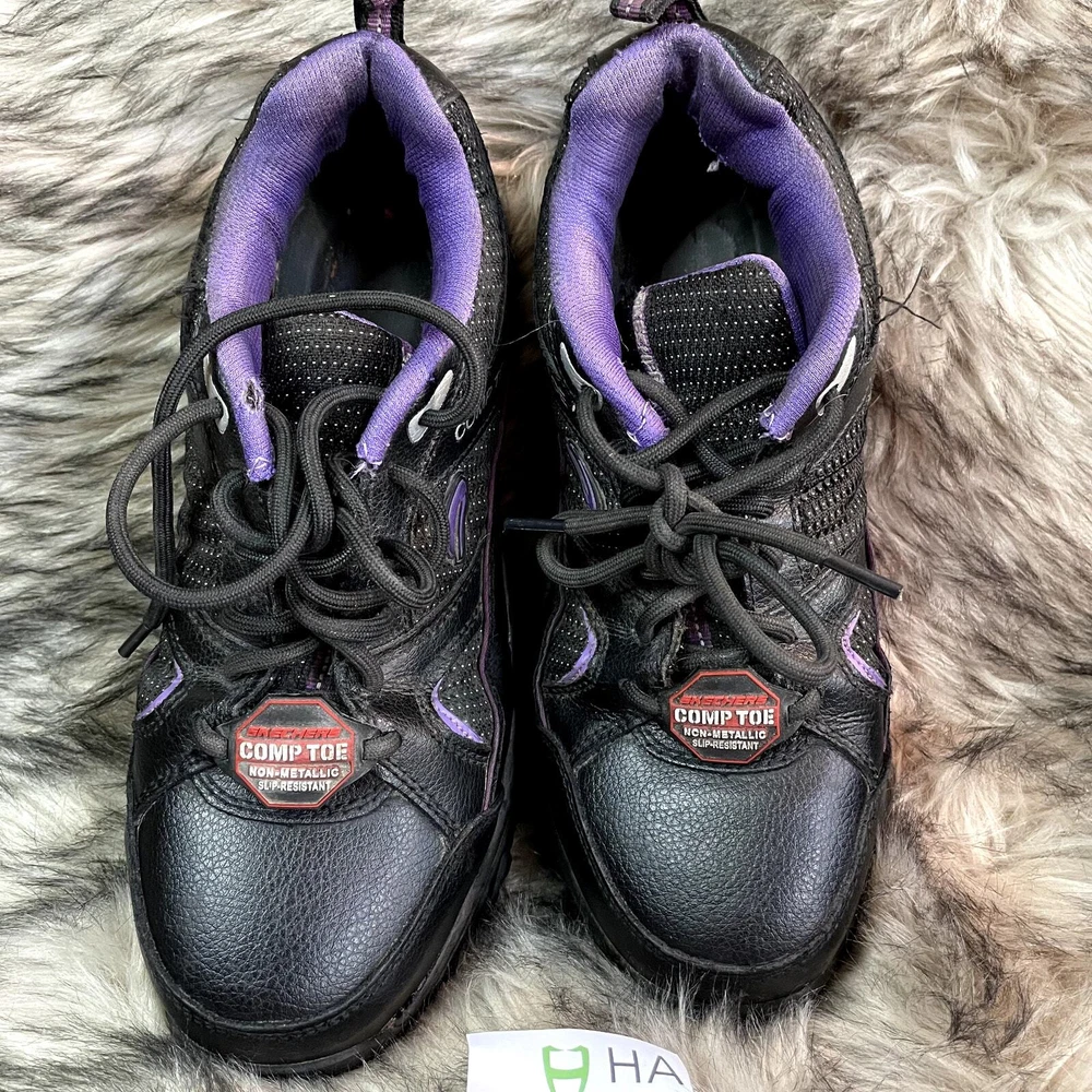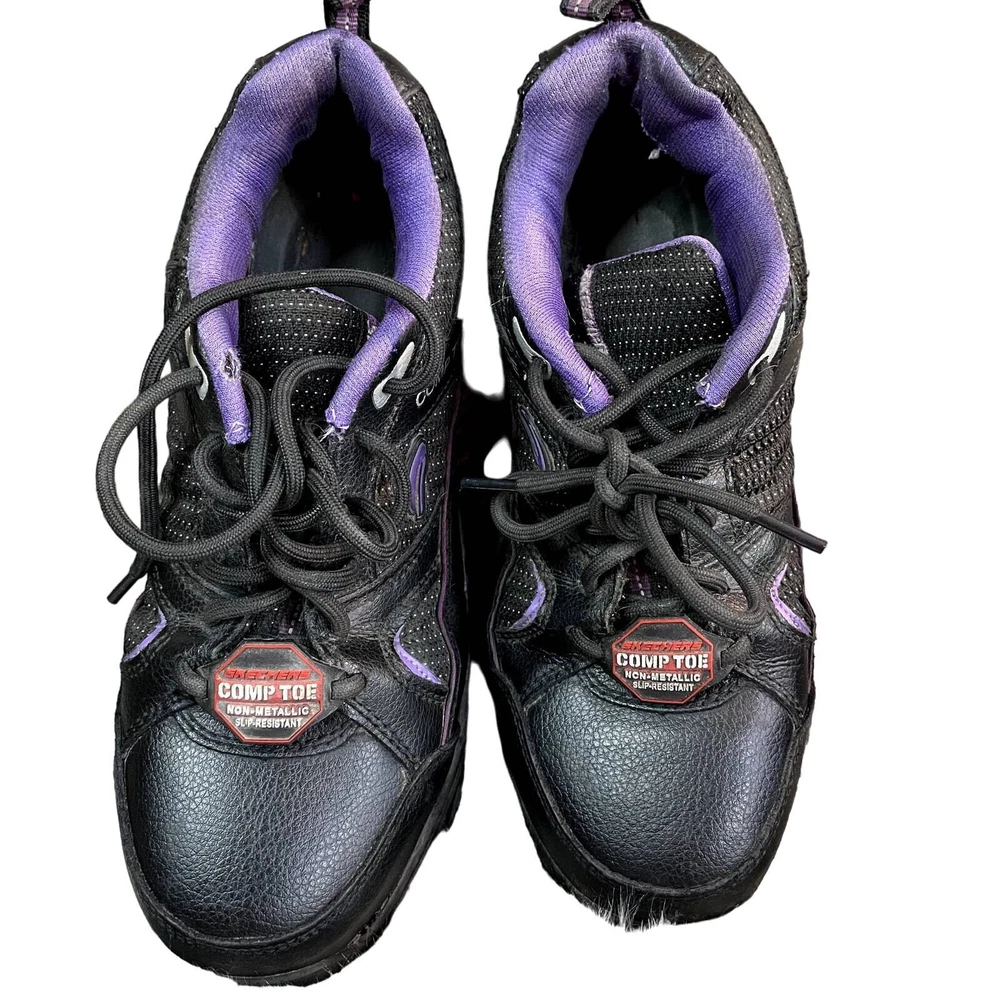 Skechers COMP TOE Size 7 wide , Women Work shoe, non-metallic , Leather slip resistant Composition toe, Black leather with purple trim lace-up You Are Enough 1425 3 lb $60
