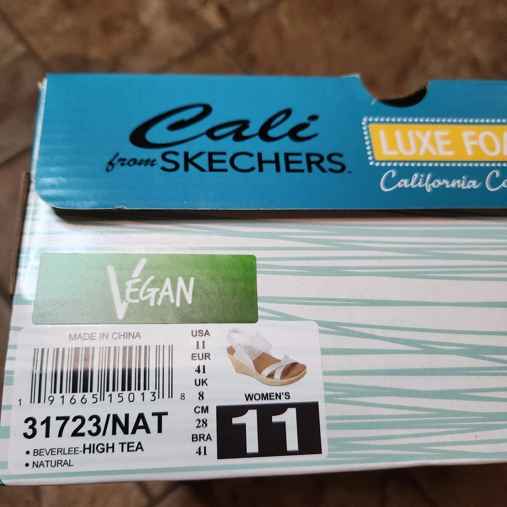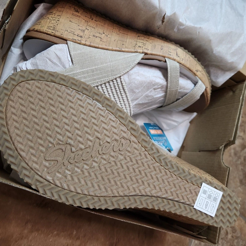 Cali from Skechers Luxe Foam Beverlee High Tea Sandals US size 11 Euro 41 natural color clean soles, with original box Please go by the photos and typed description (not auto fill) for item details. Any questions, just ask!