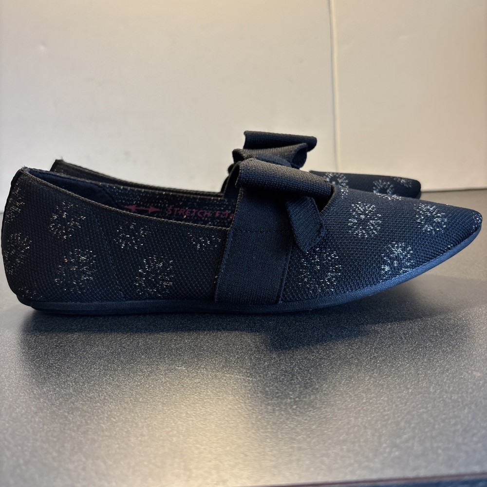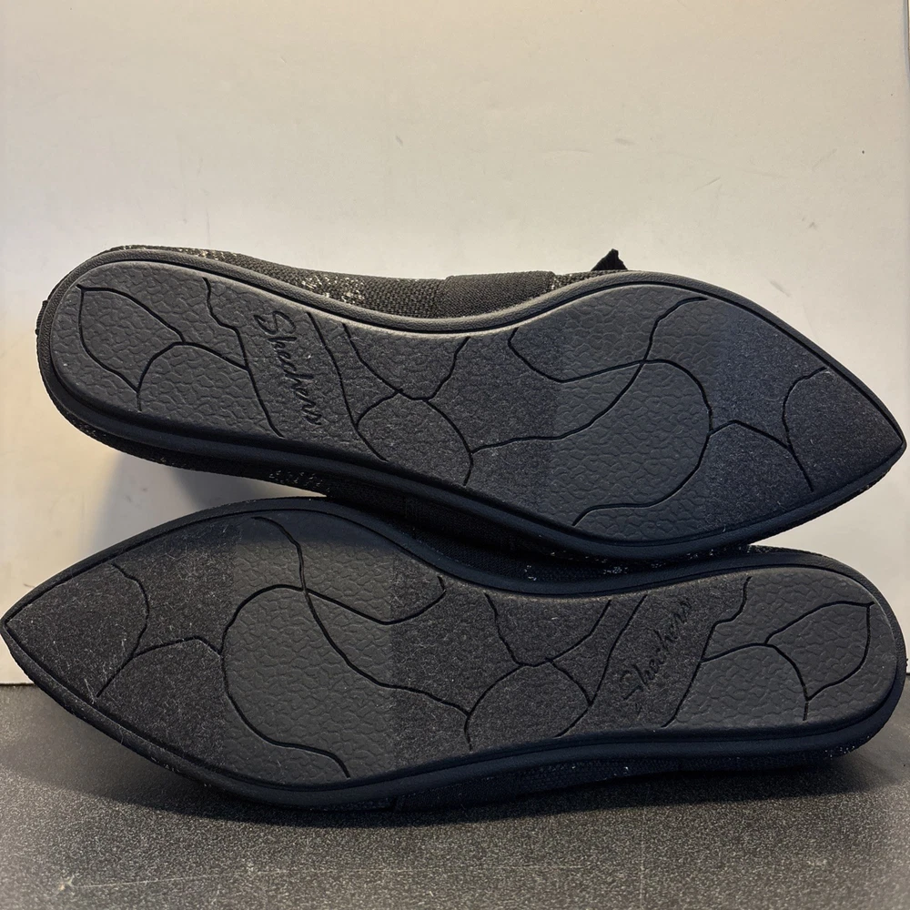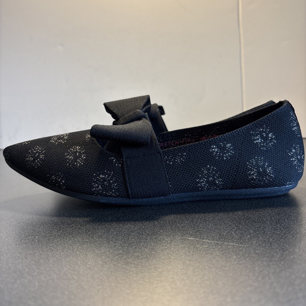 The Skechers Cleo Point-Feel Good Stretch Fit Knit Sparkle Flats in Black are a comfortable and stylish choice for women. These slip-on flats feature a knit fabric upper with a rubber outsole for durability. The bow accent adds a touch of elegance, while the memory foam insole provides added comfort. Perfect for casual outings, these flats are easy to wear and perfect for the summer, fall, and spring seasons. Made by the brand Skechers, these flats combine style and functionality for the modern woman.