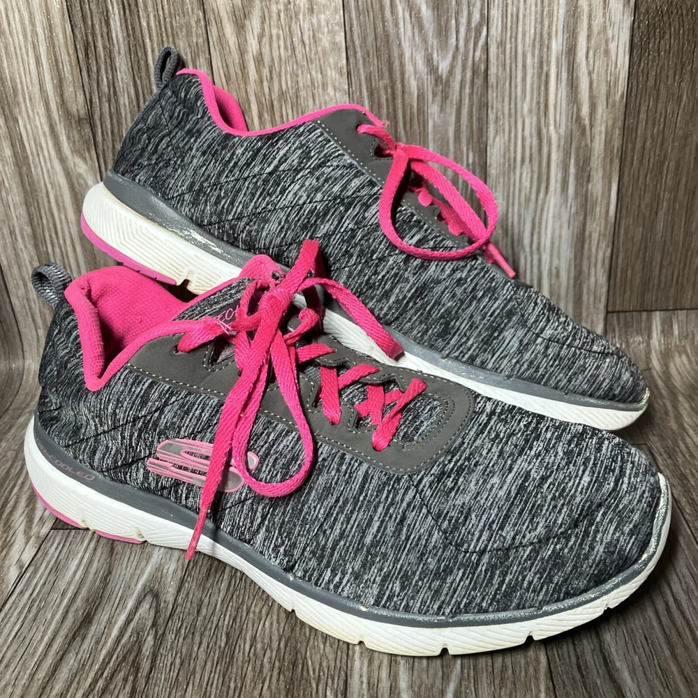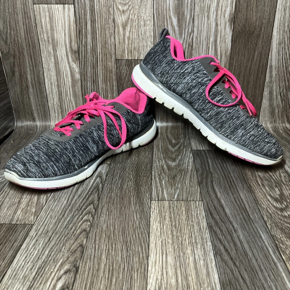 The Skechers Flex Appeal 3.0 13067 Running Shoes are a stylish and colorful athletic sneaker designed for women. Featuring a black and hot pink color combination with lace-up closure, these sneakers offer comfort with a foam insole and rubber outsole for walking or sports activities. The low-top shoe has a synthetic upper material with a blended fabric construction and a logo accent. This model was manufactured in 2018 and released in 2019, making it a trendy and sporty choice for those looking for both style and functionality in their footwear.