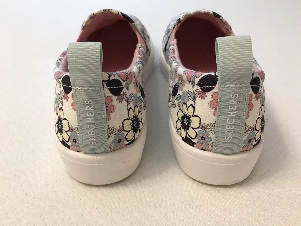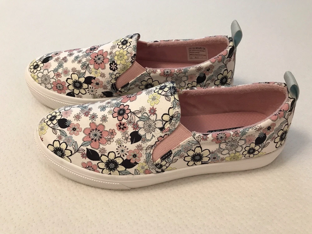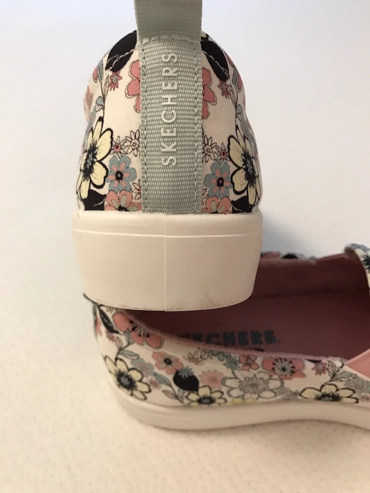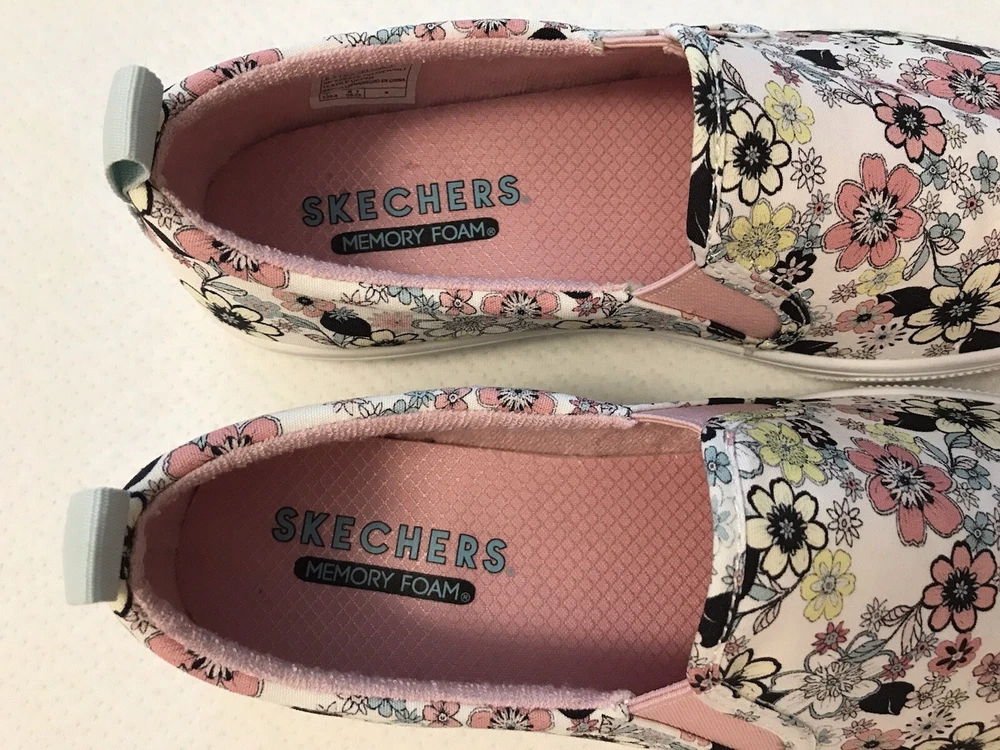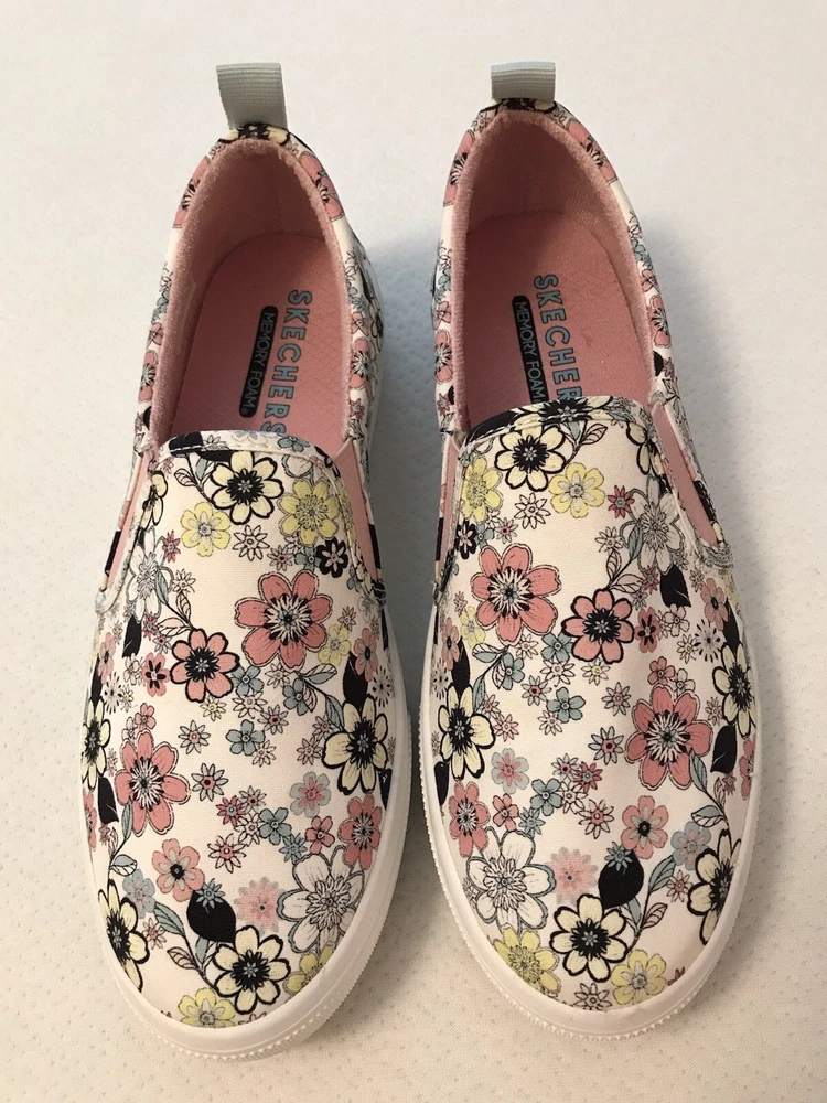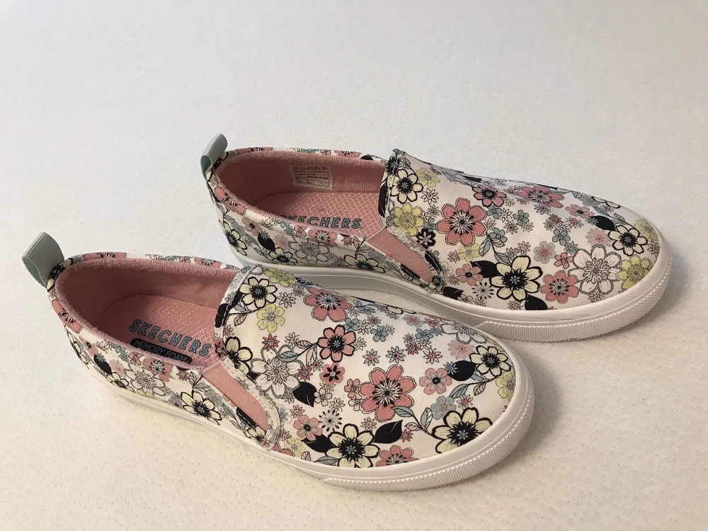 Elevate your style with these charming Skechers boat shoes! Featuring a vibrant floral pattern, these sneakers are perfect for any occasion - whether you're traveling, working out, or just running errands. The round toe and low heel provide both comfort and style, while the pull-on closure makes them easy to wear. Made with memory foam and breathable fabric, these shoes are perfect for those long walks or workouts. The rubber outsole ensures durability and longevity, while the cushioned insole provides added comfort. Available in US size 8.5, these preppy and colorful sneakers are a must-have for any shoe collection. In a smoke free home.