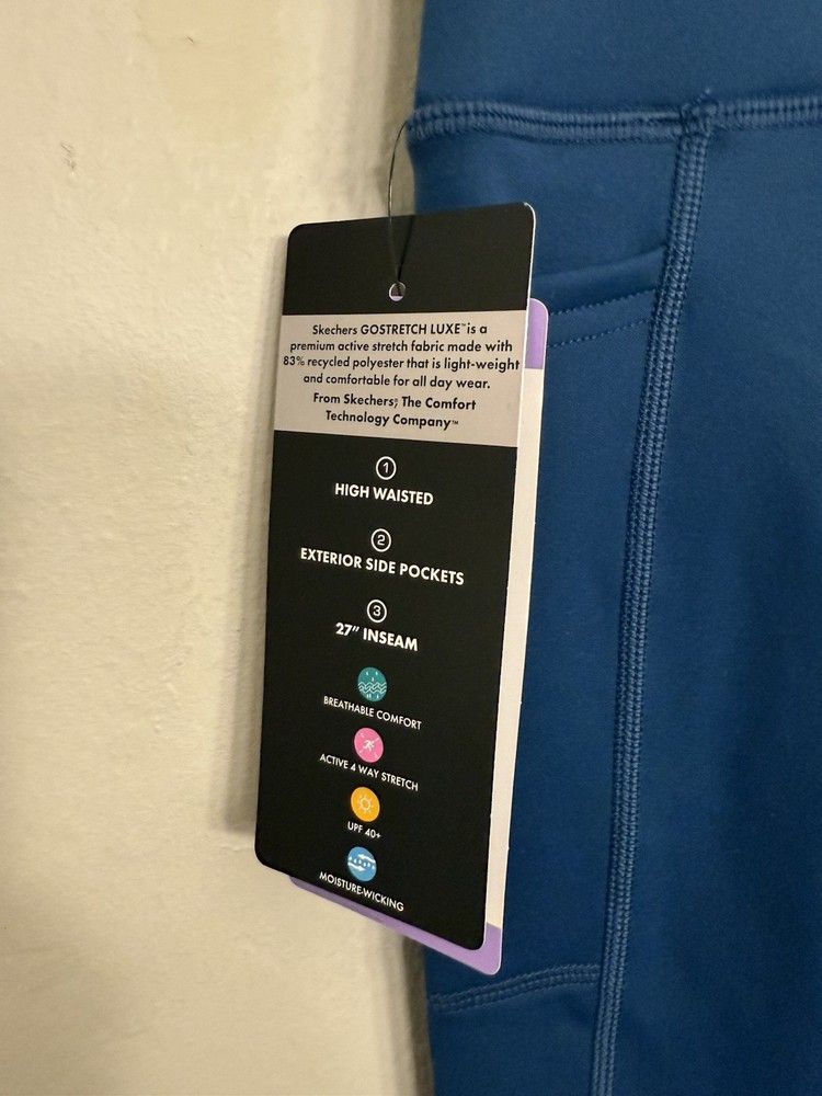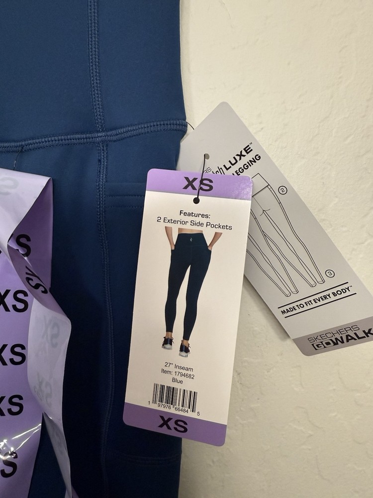 Personalize: No gtin13: Does not apply Pattern: Solid Color: Blue Size: XS Performance/Activity: Yoga Accents: Logo Theme: Sports Material: 83% Polyester Recycled 17% Elastane Vintage: No Department: Women Features: ["Easy Care", "Elastic Waist"] Style: Leggings Size Type: Regular UPC: Does not apply Brand: Skechers Type: Leggings Occasion: Casual Rise: High (Greater than 10.5 in)