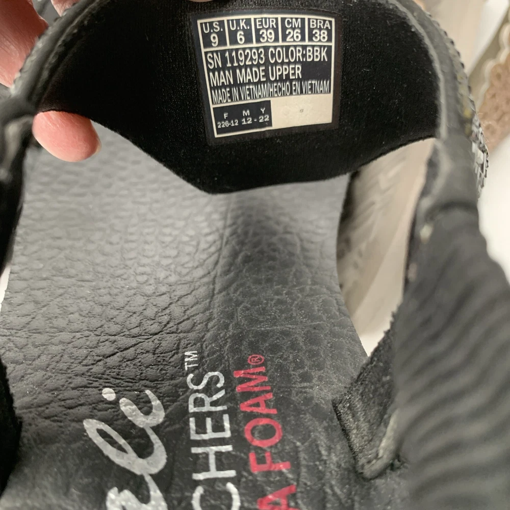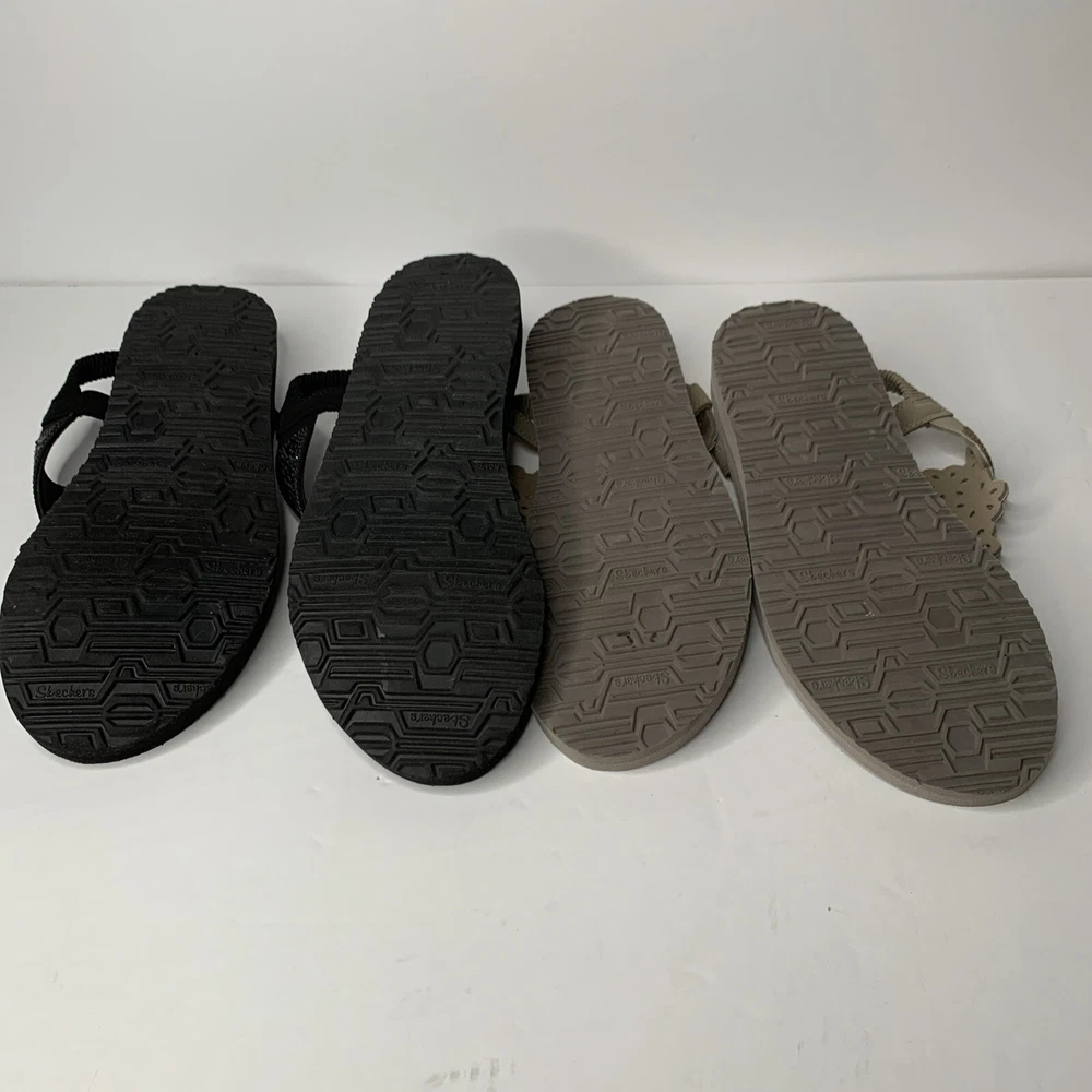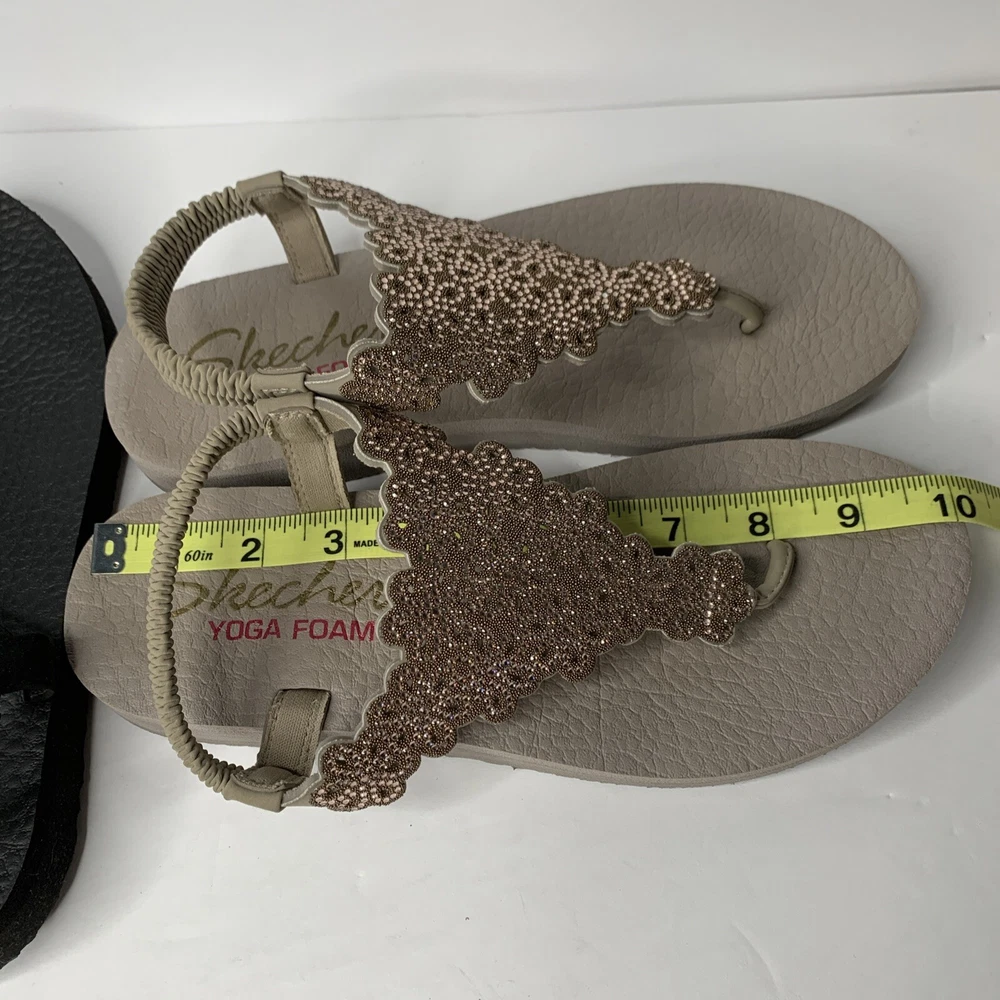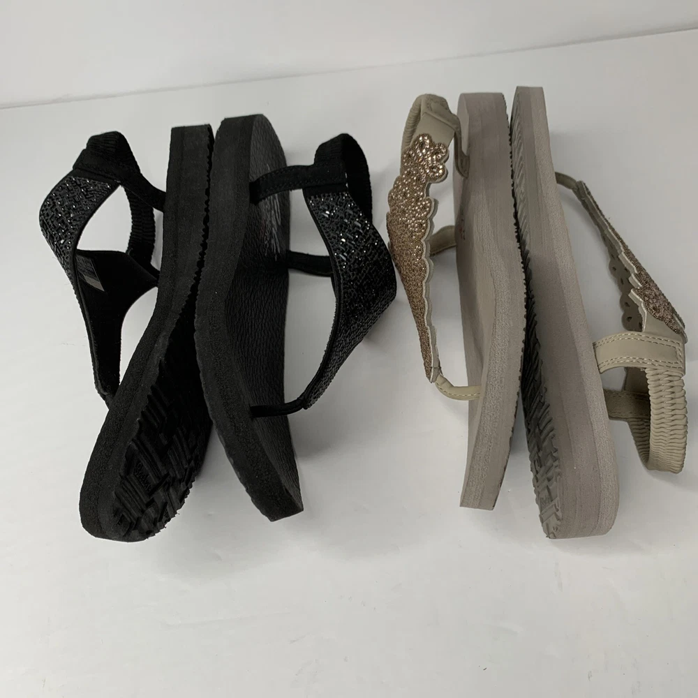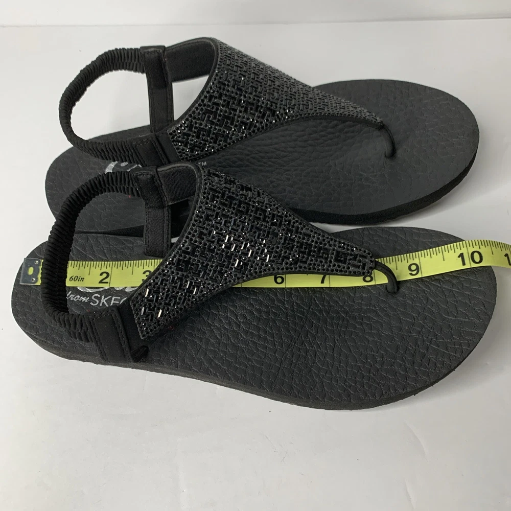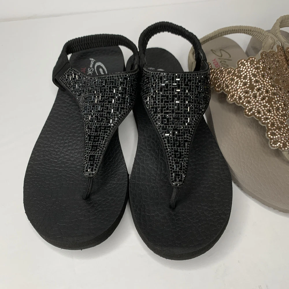 This product is a set of two Skechers sandals in black and rose gold, featuring a comfortable Yoga Foam insole. They are slip-on style slingback sandals with rhinestone accents and the Skechers logo. The sandals have a flat heel under 1 inch, making them suitable for casual wear, travel, and parties. They are lightweight, cushioned, and breathable, perfect for summer, fall, and spring seasons.