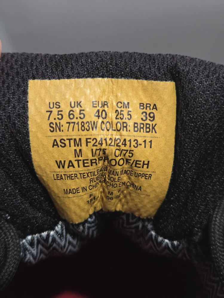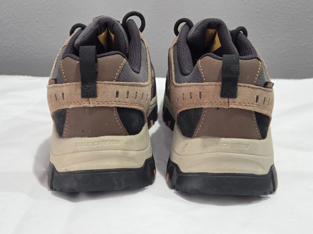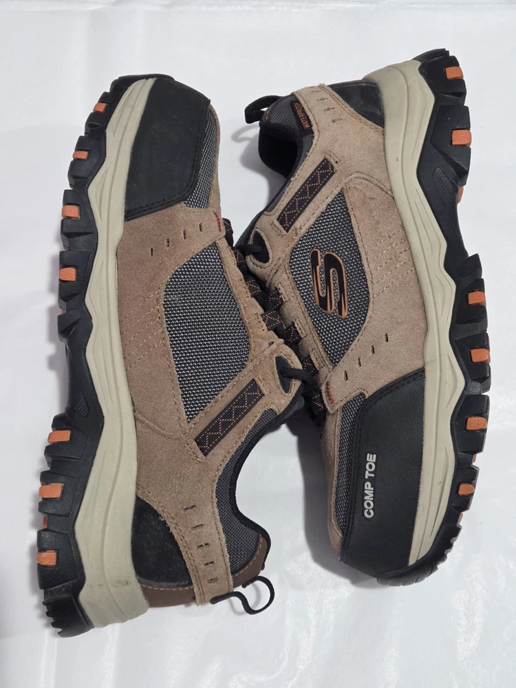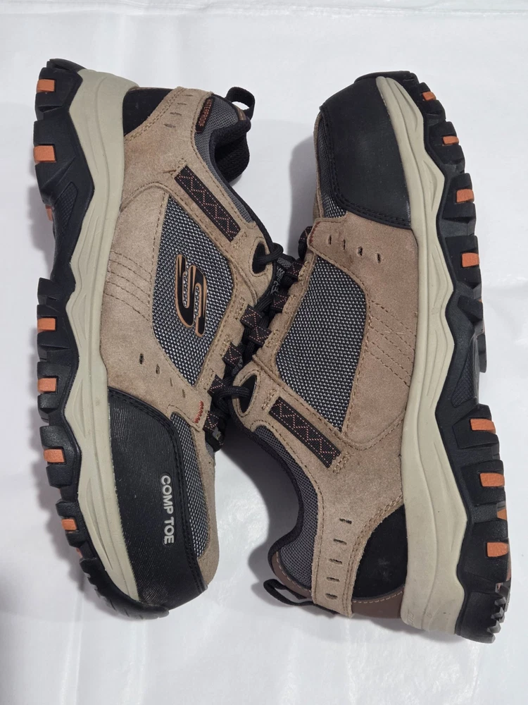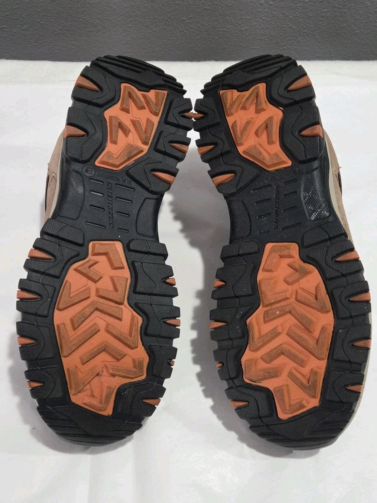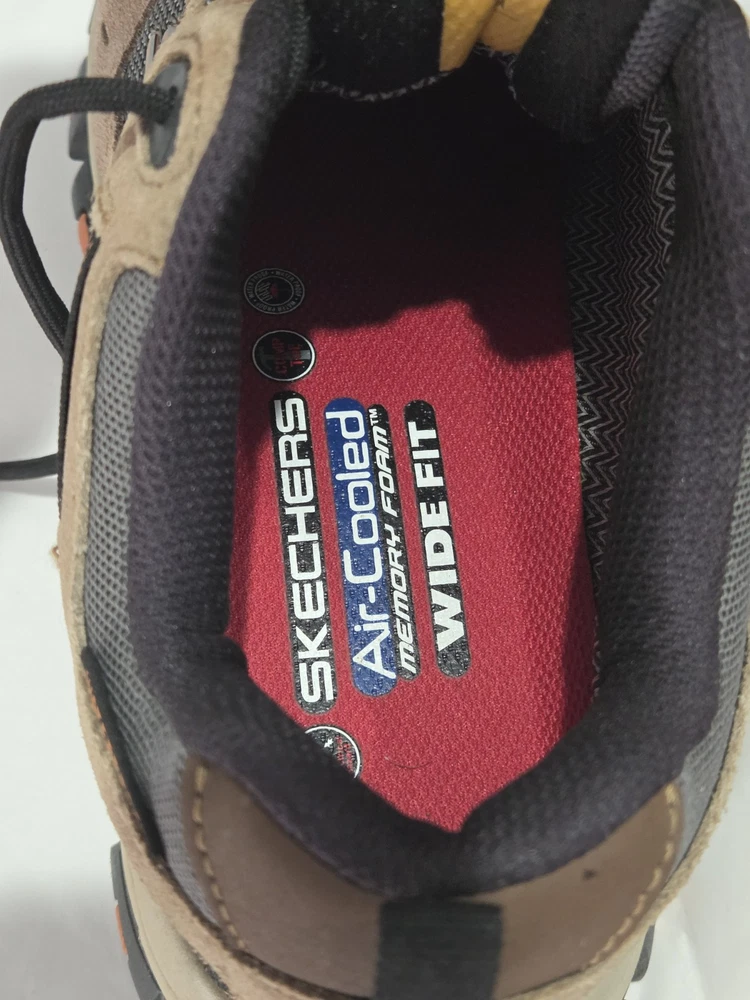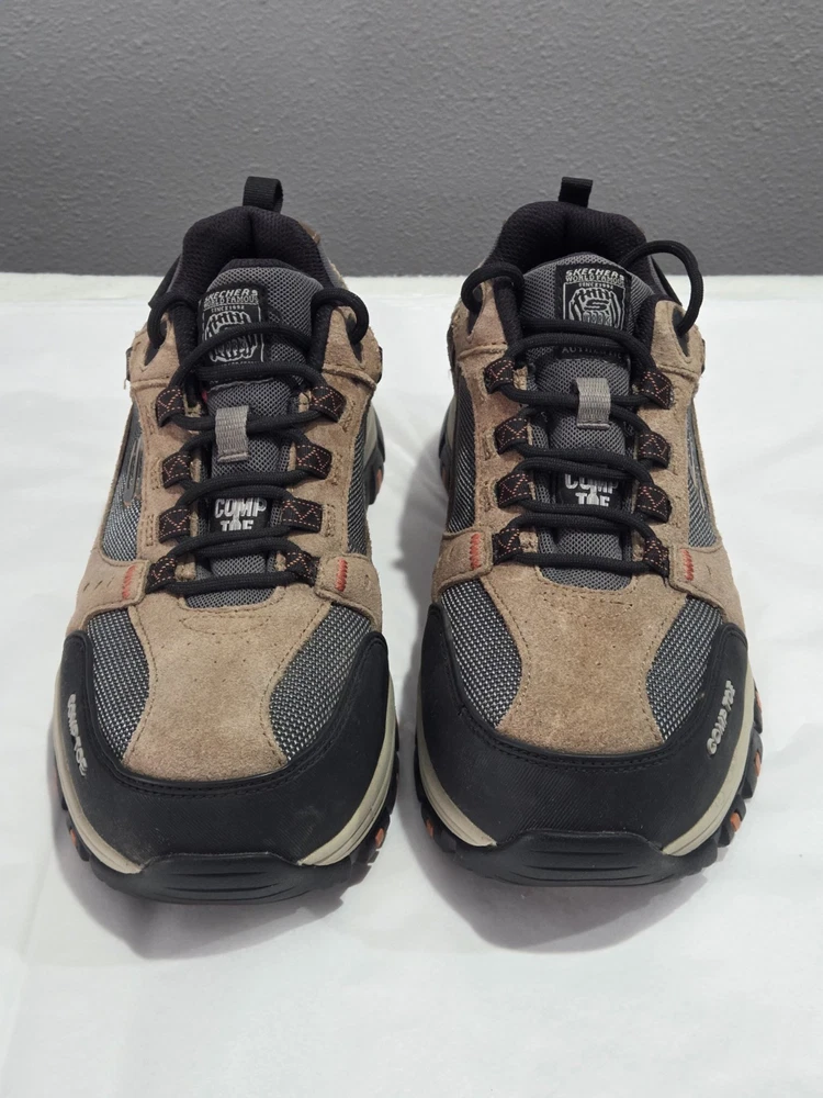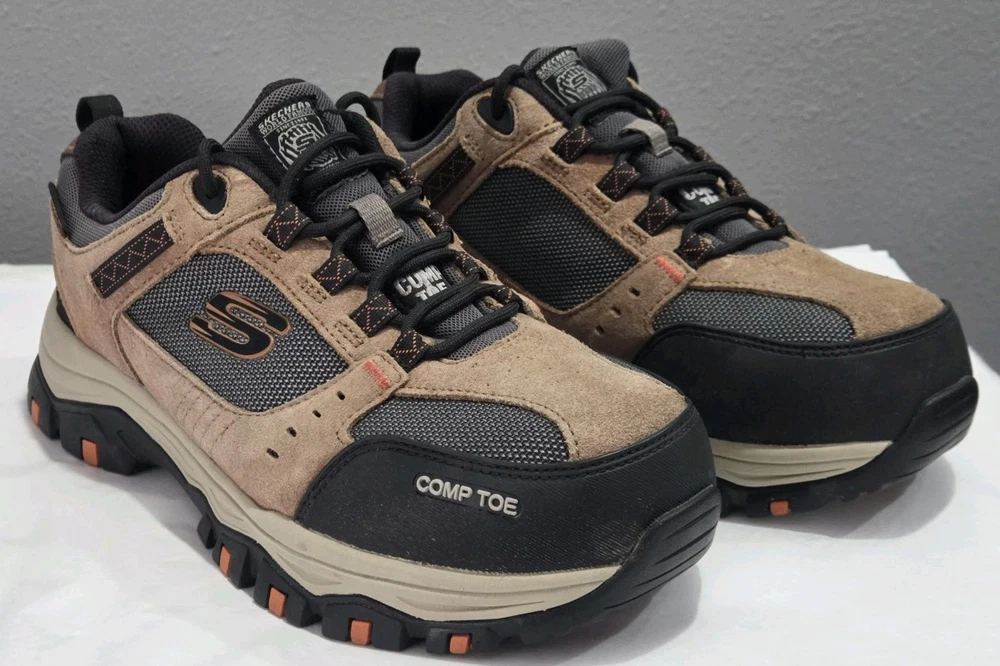 Skechers Men's Brown Composite Toe Waterproof Sneaker in size 7.5. These work and safety boots feature electrical hazard protection, a cushioned design, and a composite toe for added safety. Made of leather with a waterproof construction, the Skechers 77183 model is built for durability and protection in various work environments.
