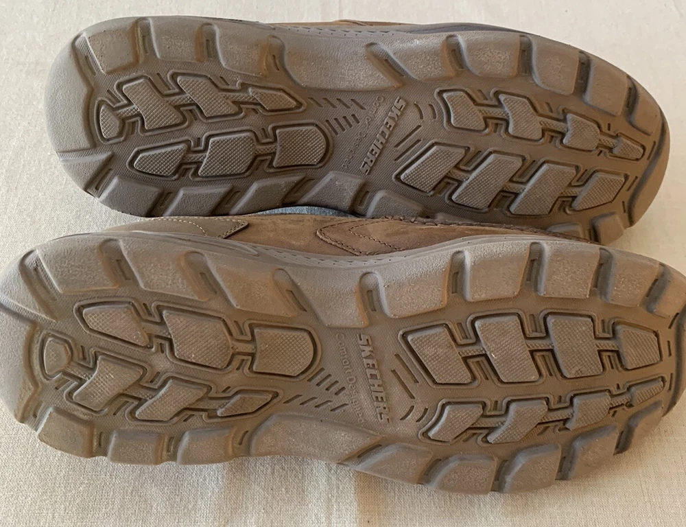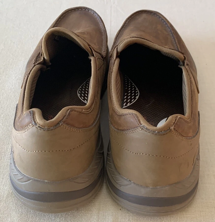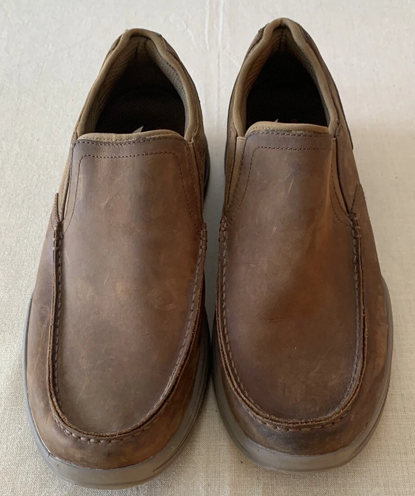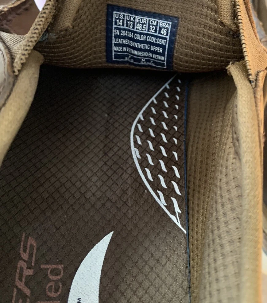 These Skechers slip-on shoes for men are made of brown leather, featuring an almond toe and a slip-resistant leather outsole. They have arch support, cushioning, and a comfortable padded lining. The shoes are size 14 in US measurements and have an almond toe shape. Perfect for travel, casual outings, or workwear, they combine style and comfort in a versatile design.