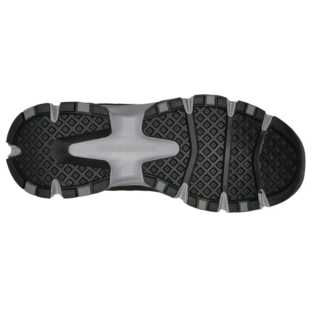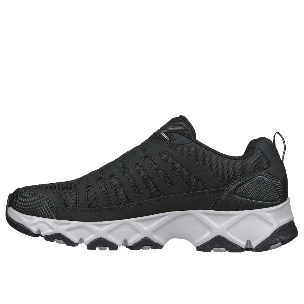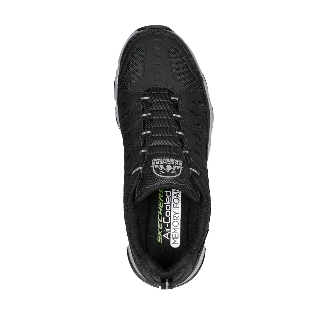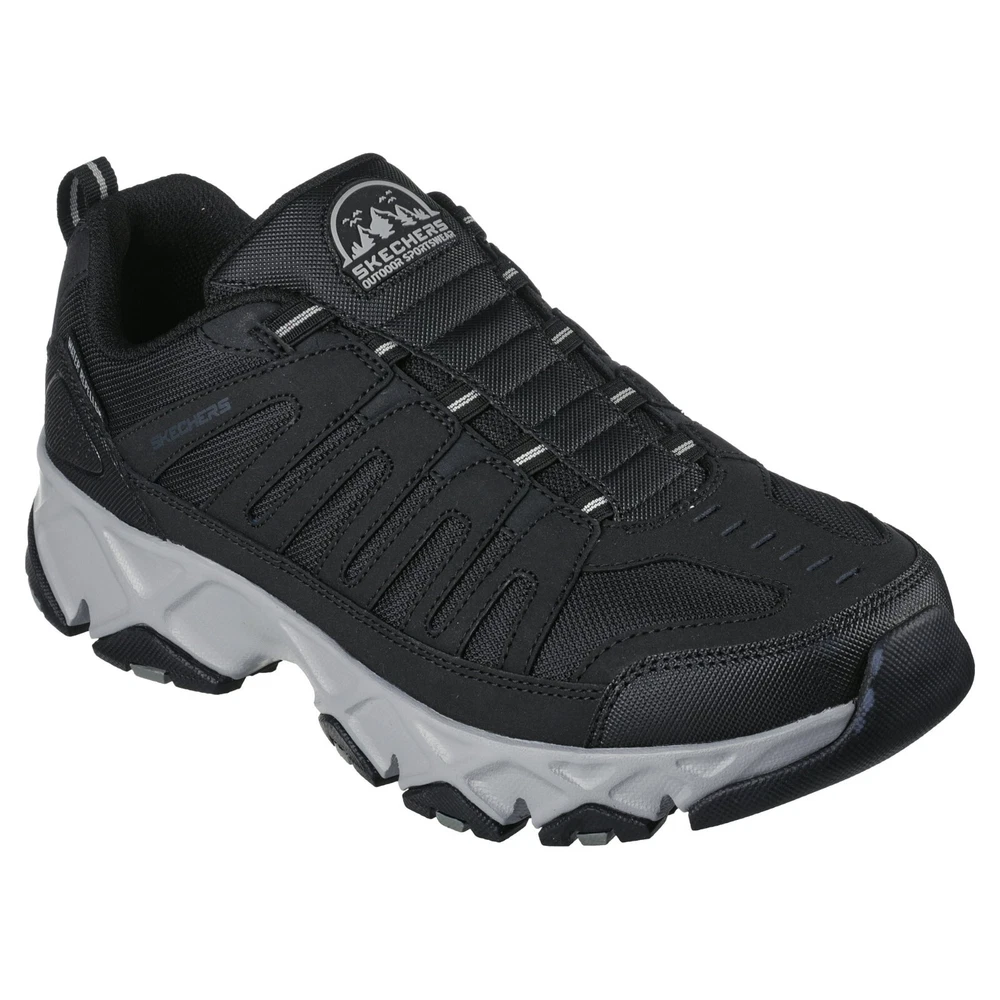 Product details Explore the great outdoors in rugged style and comfort with Skechers relaxed fit ( roomier in forefoot) crossbar- cedar. This Athleisure everyday trail design features a leather and mesh upper with a stretch lace panel, plus a Skechers air cooled memmory water repellant stretch lace panel relaxed fit