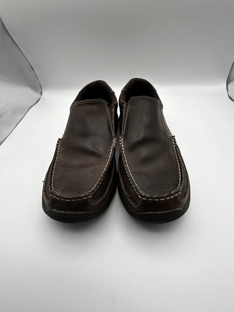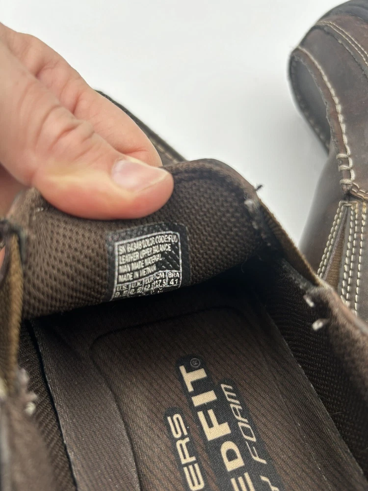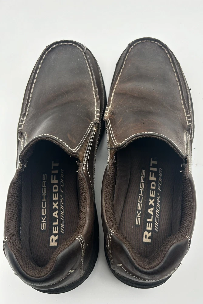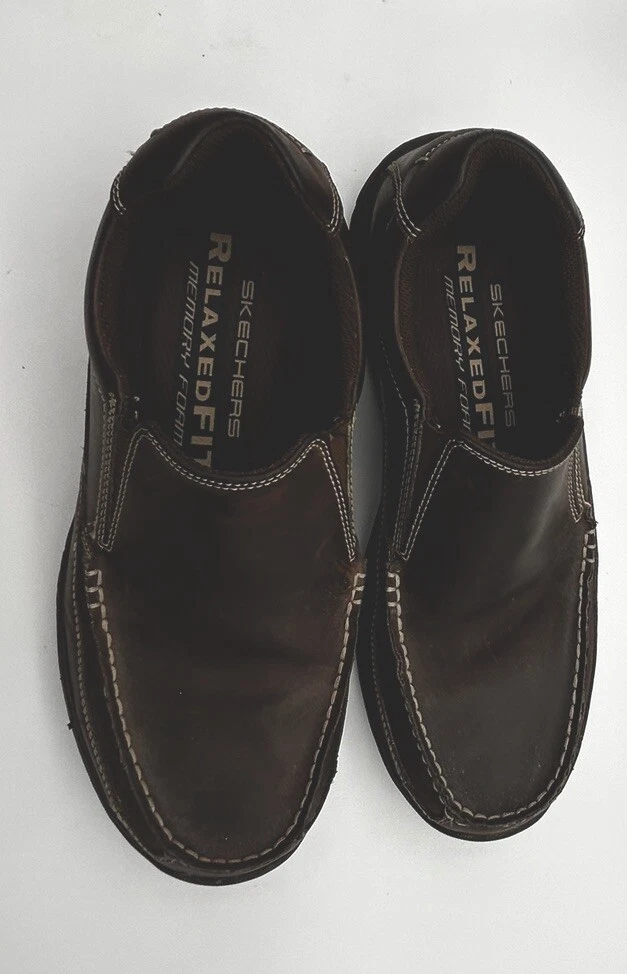 Elevate your casual shoe game with these Skechers relaxed fit memory foam slip-on loafers. The brown leather upper material paired with a round toe shape and synthetic outsole material gives a stylish and comfortable fit for any occasion, whether it be travel or casual wear. The cushioned, lightweight, and breathable features make these shoes perfect for all seasons, from winter to summer. These Skechers loafers come in a men's size 9.5 and foam insole material. The solid pattern and Skechers relaxed fit product line make these shoes a reliable and fashionable addition to any wardrobe. No matter if you're running errands or going on a trip, these shoes will provide the comfort and support you need.