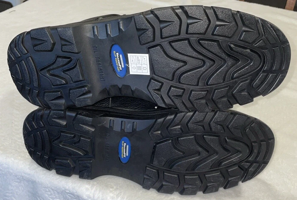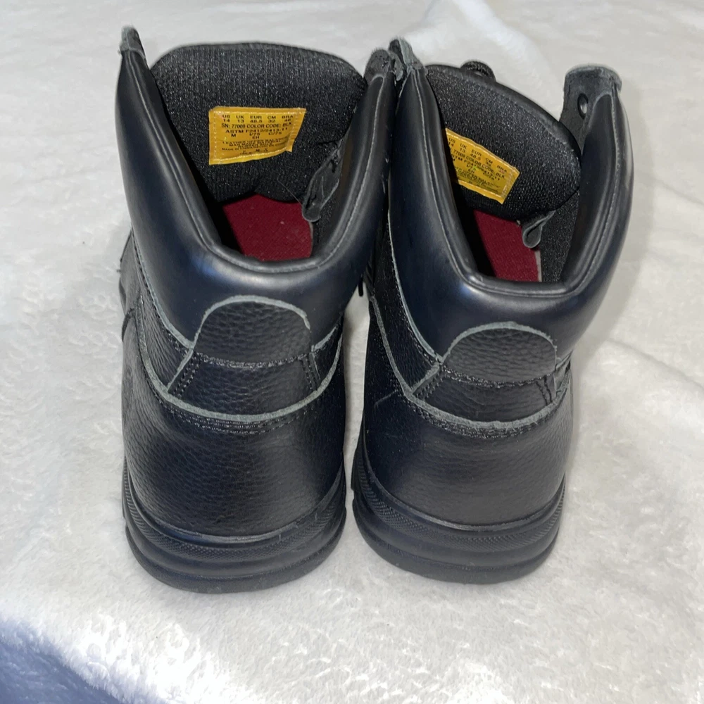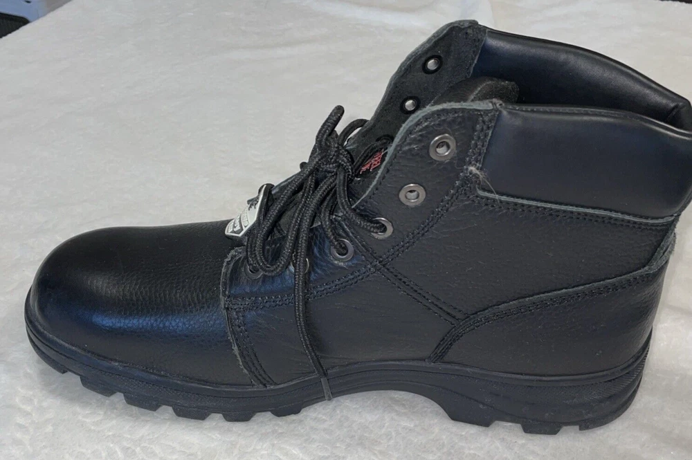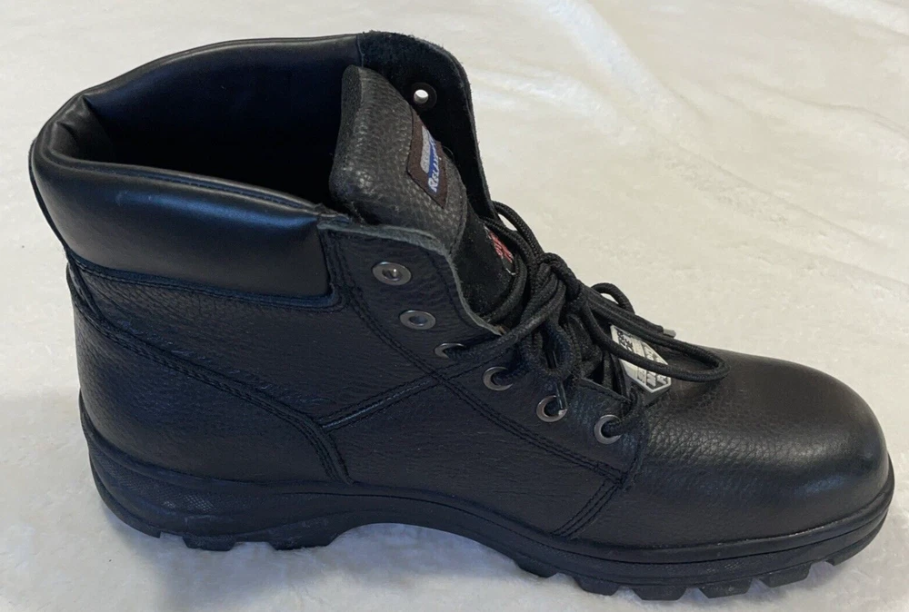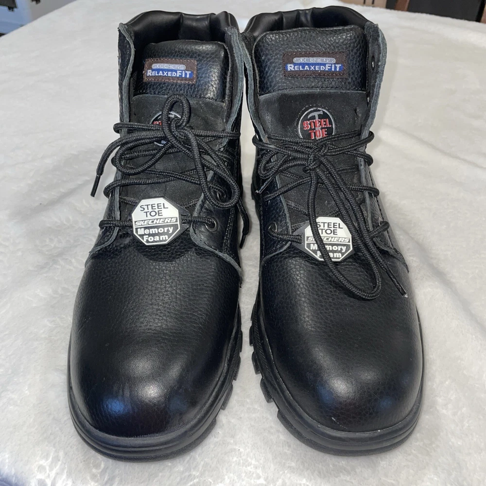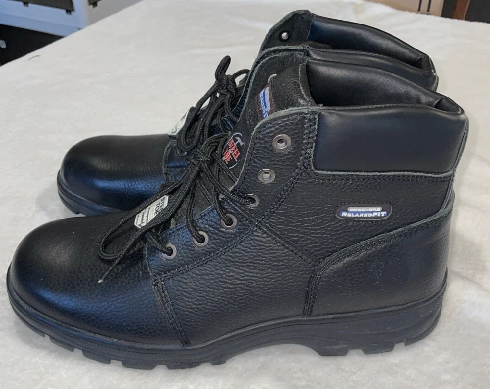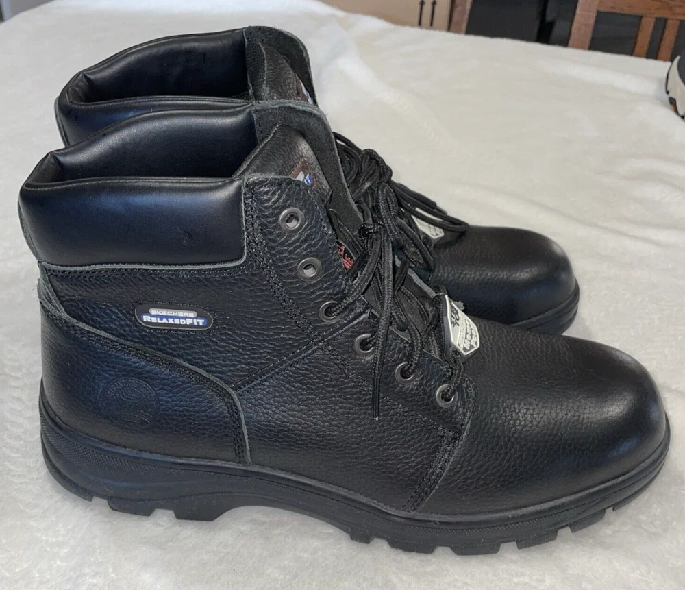 The Skechers Relaxed Fit Steel Toe Black Leather Work Boots are designed for men in size 14 with a standard shoe width. These ankle boots feature a solid black color, lace-up closure, and a round toe shape. The outsole is made of leather and is oil-resistant, making them suitable for work environments. The steel toe provides extra protection, while the Skechers Relaxed Fit ensures comfort for all-day wear. This model, numbered 77009, is part of the Skechers product line and showcases a durable and stylish design for those in need of reliable work boots.