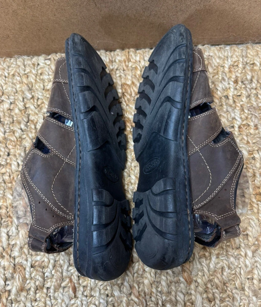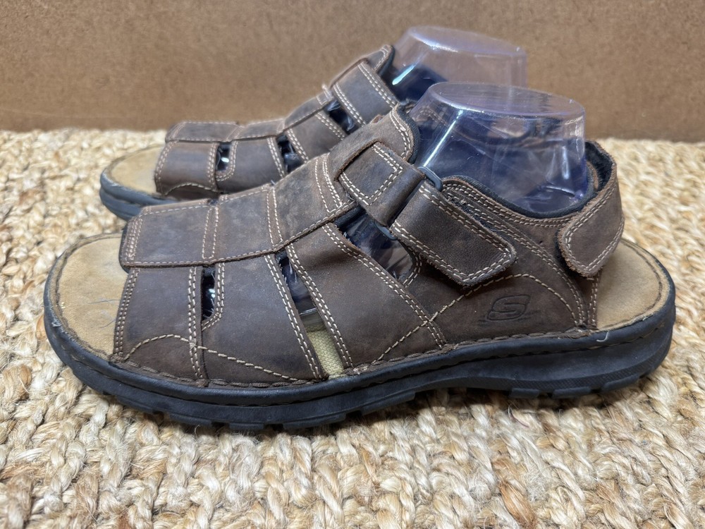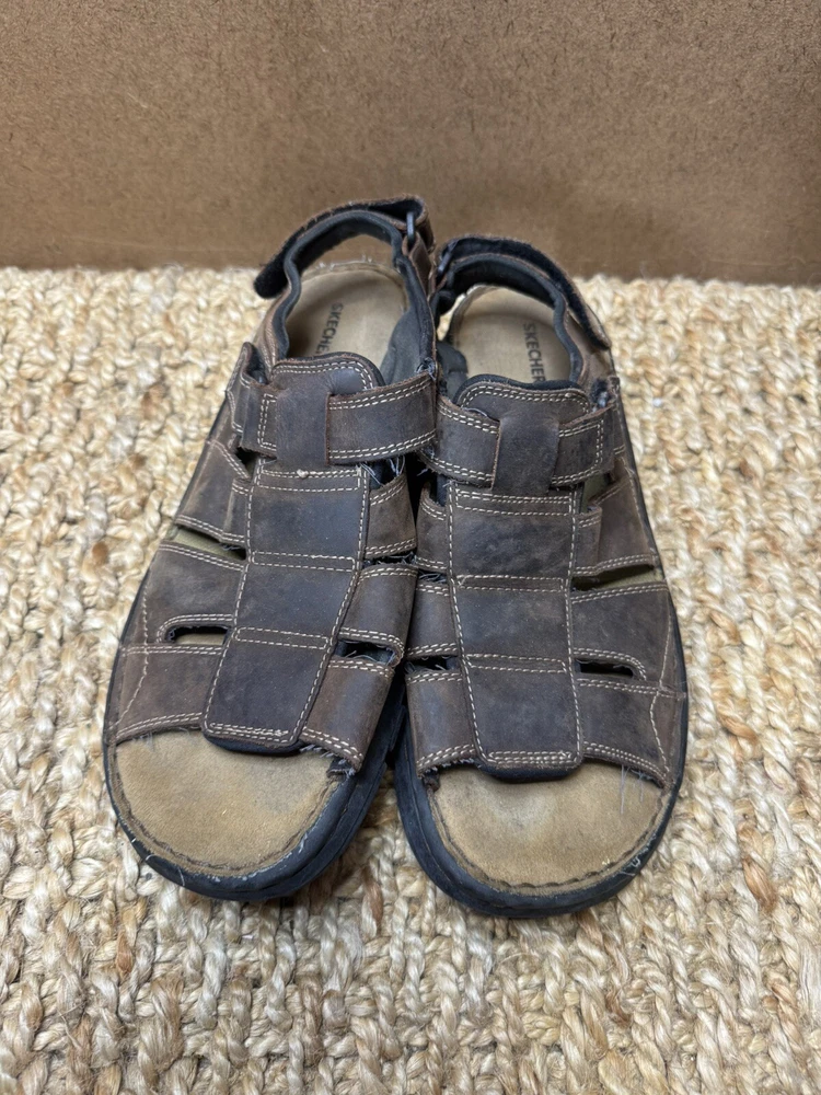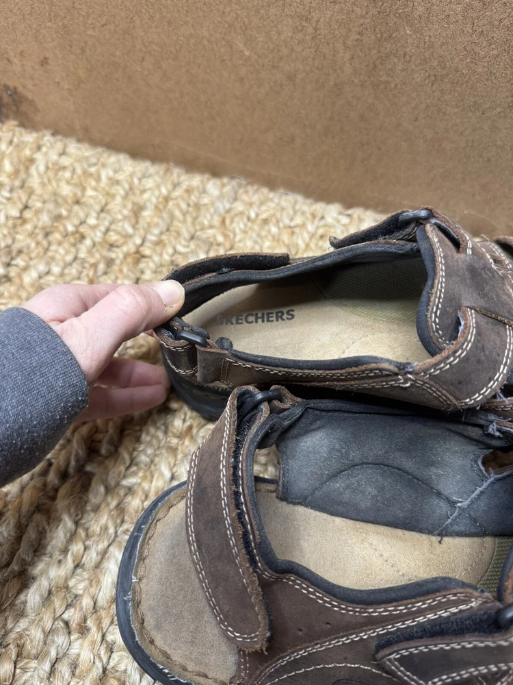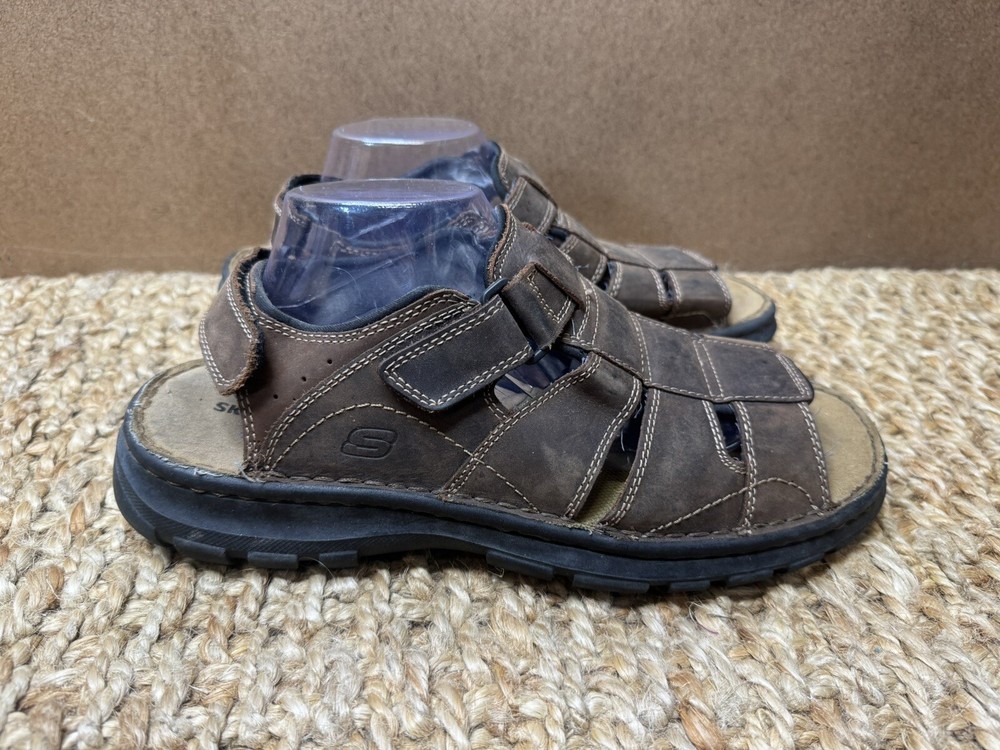 Handmade: No Features: Adjustable Strap, Comfort, Straps Pattern: Solid Shoe Width: Standard Model: Open Toe Color: Brown Lining Material: Faux Leather Insole Material: Faux Leather Accents: Logo US Shoe Size: 12 Character: Fisherman Vintage: Yes Closure: Hook & Loop Upper Material: Leather Customized: No Theme: Preppy, Y2k, Chunky, Grandpa Outsole Material: Leather Occasion: Activewear, Casual, Travel Department: Men Season: Fall, Spring, Summer Type: Sandal Style: Slingback Country/Region of Manufacture: Unknown Brand: Skechers