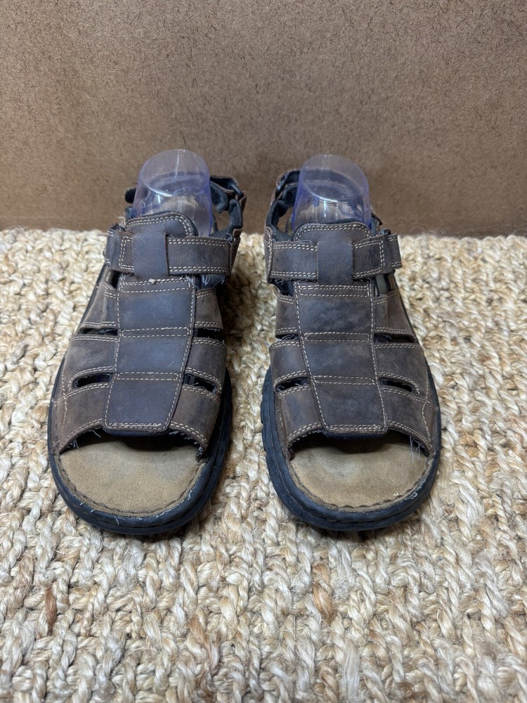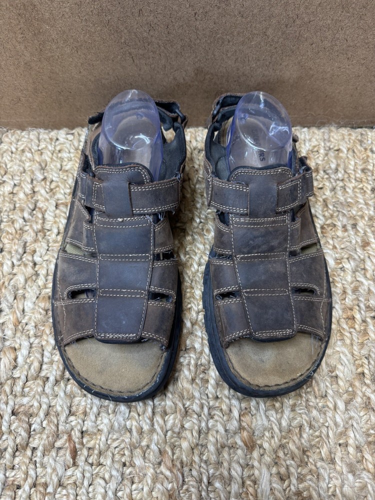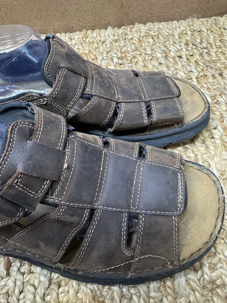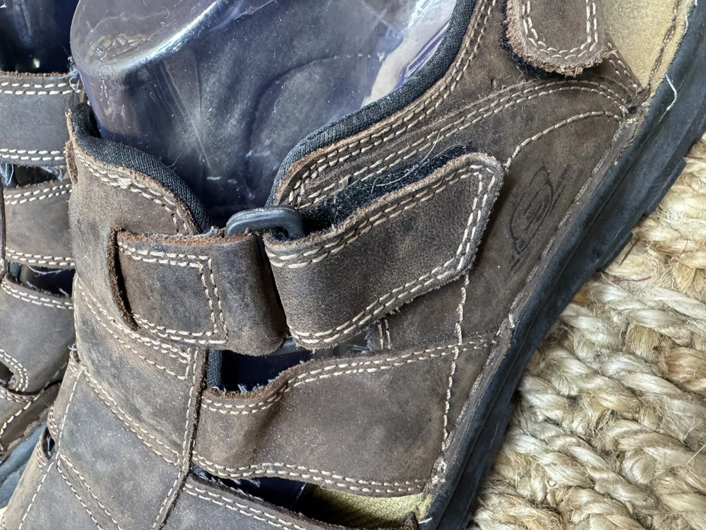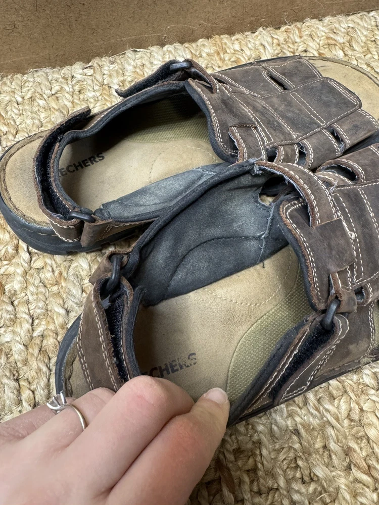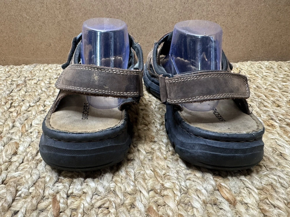 Handmade: No Features: Adjustable Strap, Comfort, Straps Pattern: Solid Shoe Width: Standard Model: Open Toe Color: Brown Lining Material: Faux Leather Insole Material: Faux Leather Accents: Logo US Shoe Size: 12 Character: Fisherman Vintage: Yes Closure: Hook & Loop Upper Material: Leather Customized: No Theme: Preppy, Y2k, Chunky, Grandpa Outsole Material: Leather Occasion: Activewear, Casual, Travel Department: Men Season: Fall, Spring, Summer Type: Sandal Style: Slingback Country/Region of Manufacture: Unknown Brand: Skechers