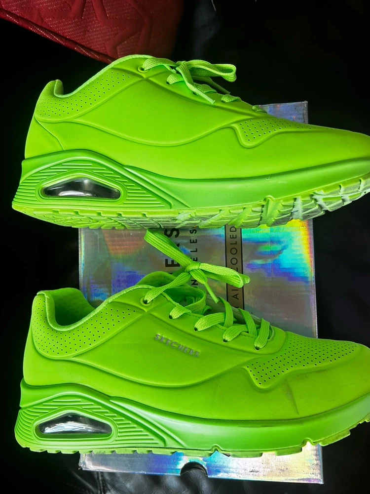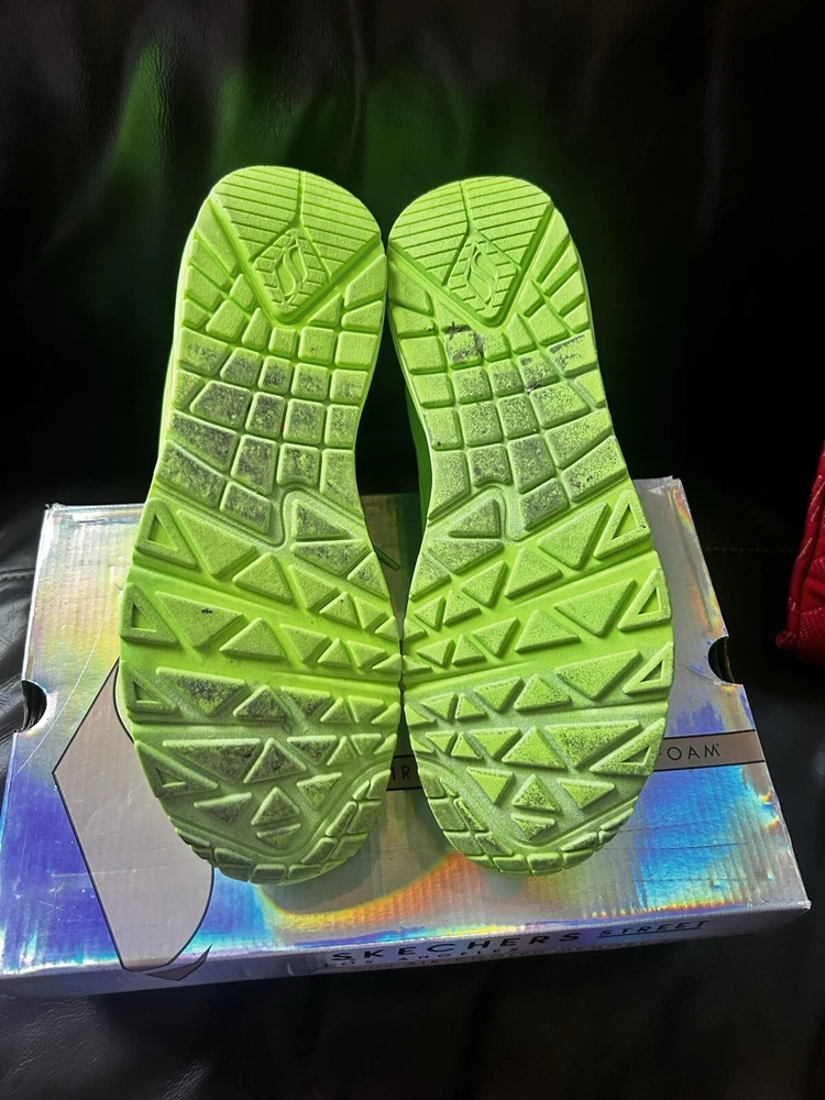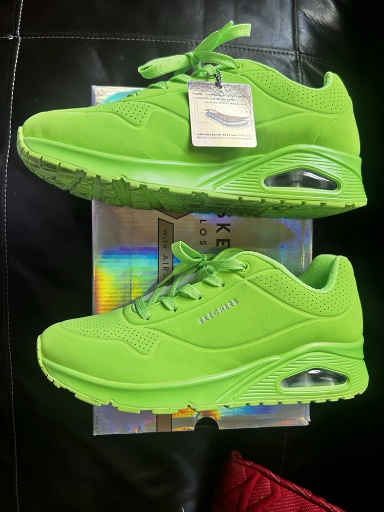 Skechers Street Los Angeles is a women's athletic sneaker made by the brand Skechers. It features a lime and green design with the Skechers logo as an accent. The shoe has a lace-up closure and is made with synthetic materials. It is designed for walking and is available in size 11 for the US, 8 for the UK, and 41 for the EU. The shoe is part of the Skechers Street product line and was made in China. used only twice but in Amazing Shape Sold as is No Return. Air Cool Memory Foam