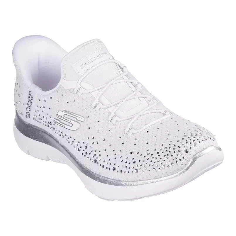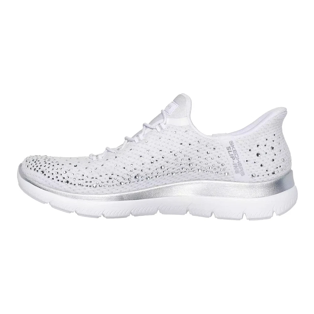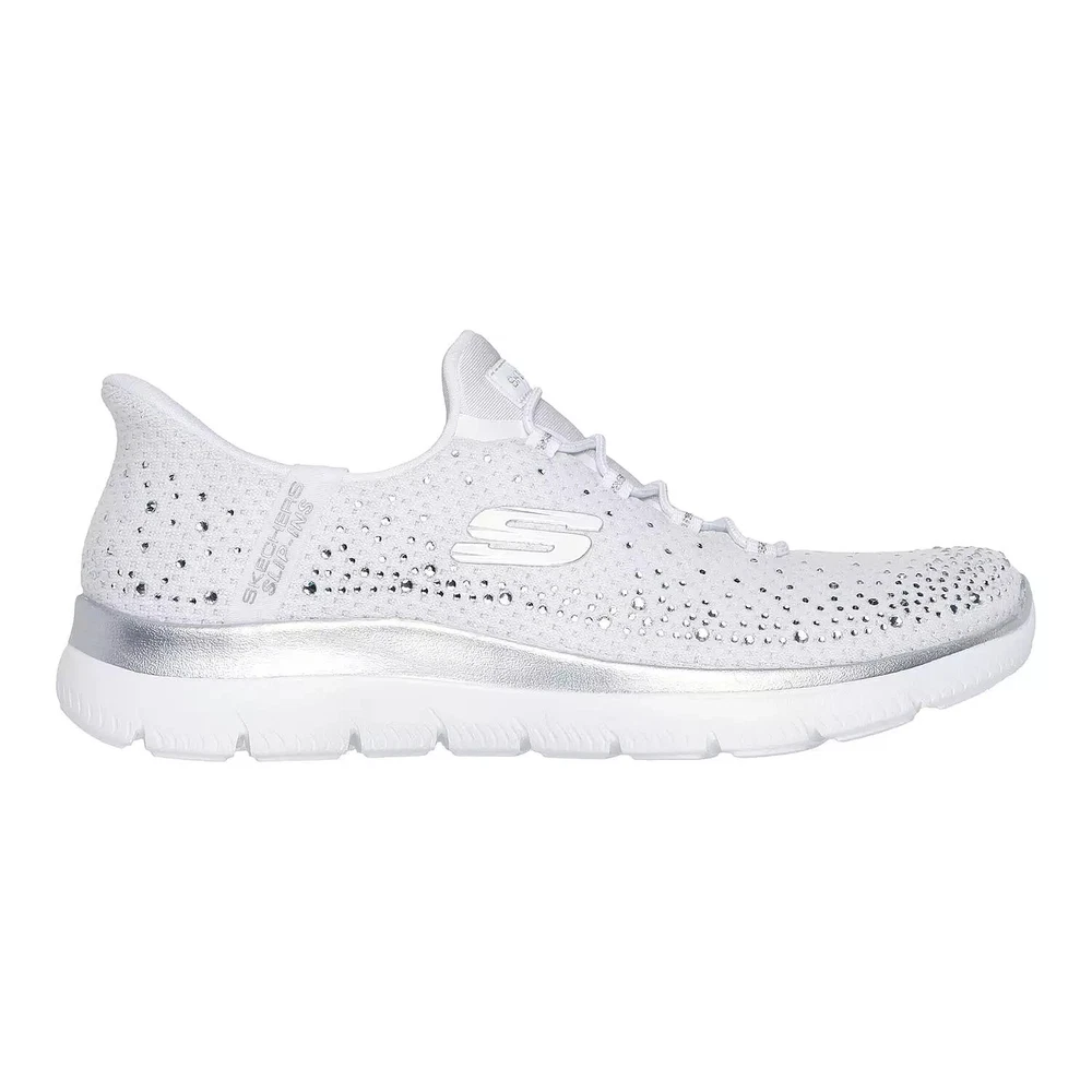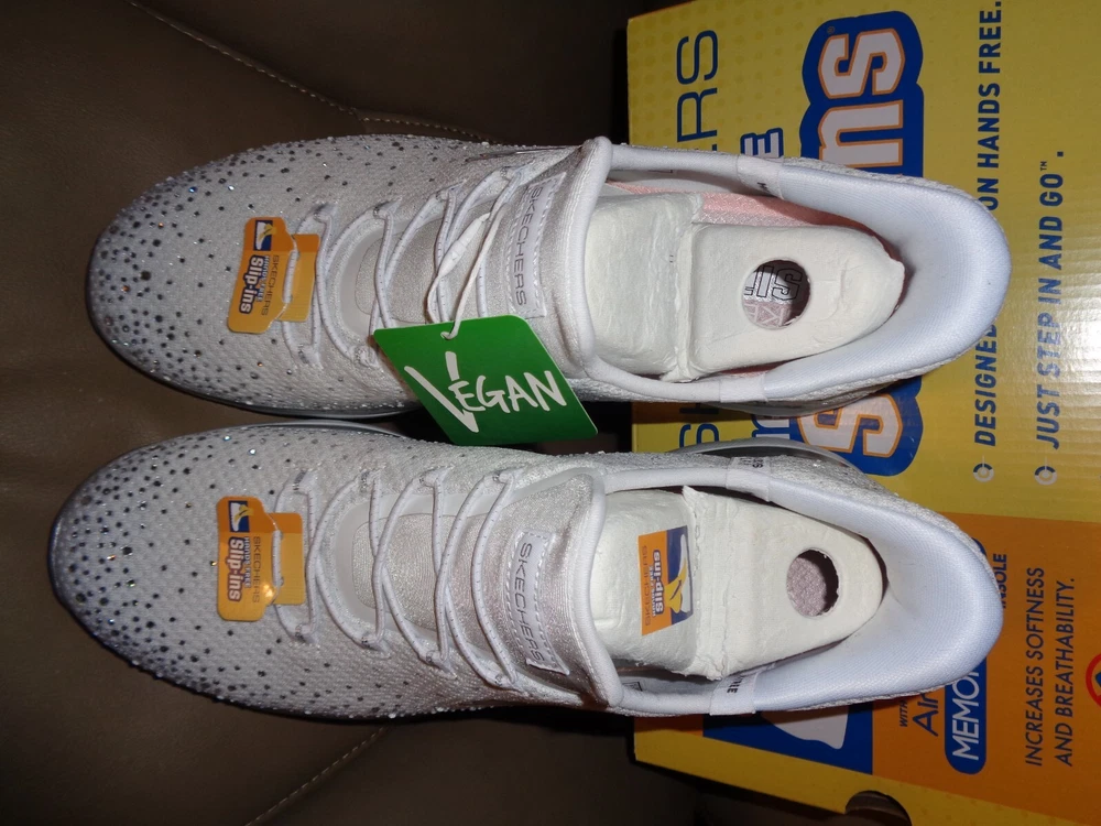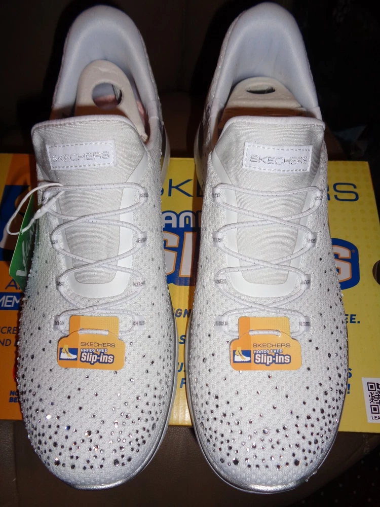 Pick up the pace with increased ease-of-wear and platinum comfort wearing these Skechers Hands Free Slip-ins®: Summits shoes. Size 10 Medium and NEW in Box!! Very hard to find!! FEATURES Rhinestone Mesh with Bungee lace upper Slip-Ins Skechers Hands Free Slip-ins for an easy fit Exclusive Heel Pillow holds your foot securely in place Lightweight shock-absorbing midsole Skechers Air-Cooled Memory Foam® cushioned comfort insole Flexible traction outsole Crafted with 100% vegan materials DETAILS Mesh upper Polyester lining Rubber outsole Round toe Elastic closure Foam footbed Treaded outsole 1.25-in. heel height Spot clean Any questions? Please ask!! sizing SKECHERS Size Chart Skechers Women's Shoe Size Chart US Size Euro Size Inches Centimeters 5 35 8.86 22 5.5 35.5 8.85 22.5 6 36 9.05 23 6.5 36.5 9.25 23.5 7 37 9.44 24 7.5 37.5 9.64 24.5 8 38 9.84 25 8.5 38.5 10.03 25.5 9 39 10.23 26 9.5 39.5 10.43 26.5 10 40 10.62 27 10.5 40.5 10.82 27.5 11 41 11.02 28 Size chart is a general guide. It may include sizes t Carousel