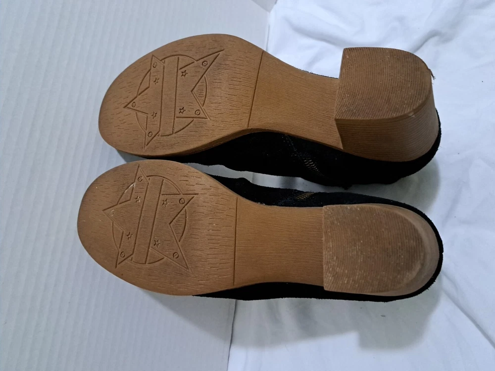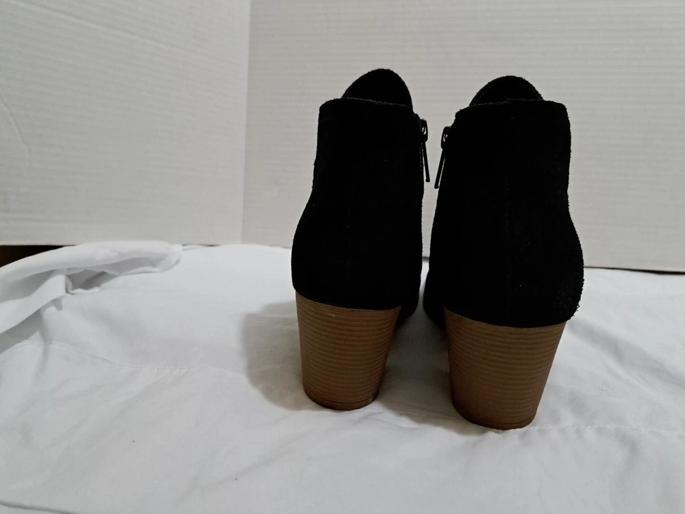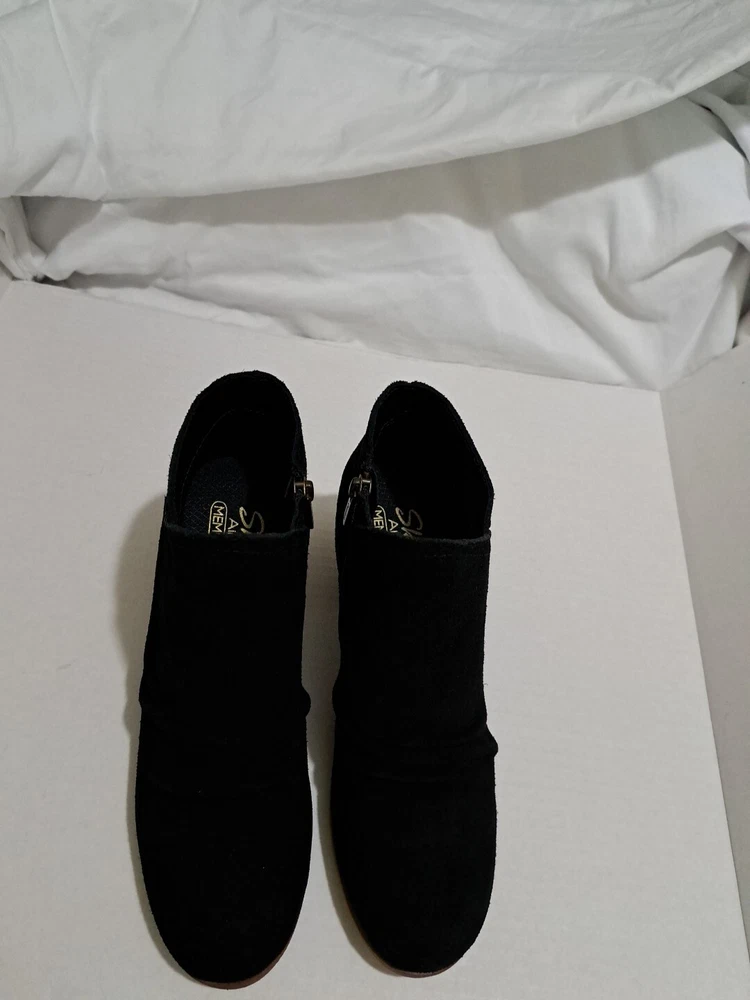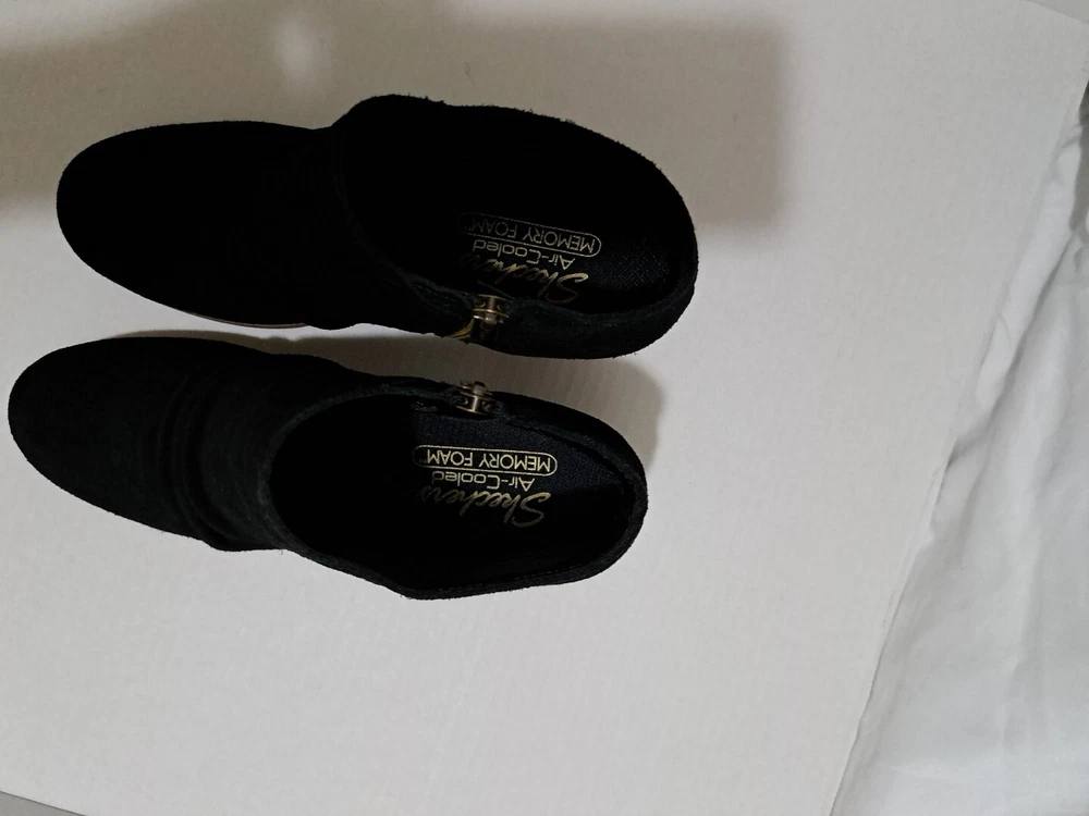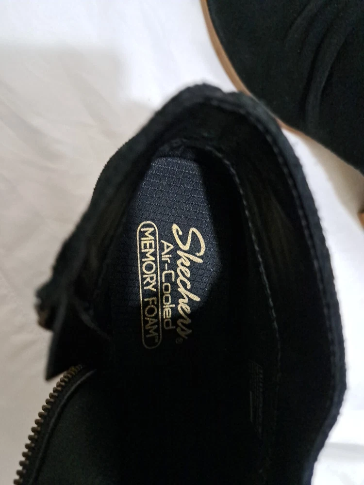 These are a pair of black Skechers Taxi boots in size 7.5 for women. They feature a side zip closure for easy wear and are made of water-repellent suede material. The boots have a mid heel height with a block heel style, providing both style and comfort. This pre-owned pair is in excellent condition, making them a great choice for anyone looking for stylish and functional footwear.