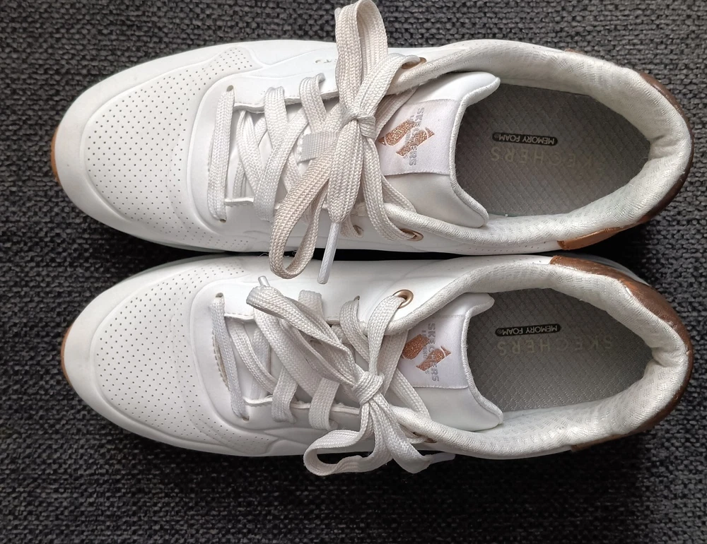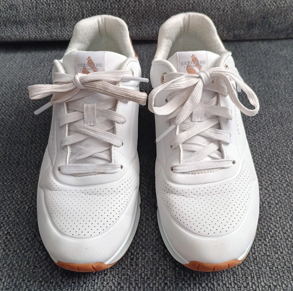 Choose gold and spice up your style with Skechers Street Uno Golden Air now. This fashionable lace-up shoe features a smooth Durabuck upper with gold accents, a padded Skechers AirCooled Memory Foam; comfort sole and a visible, air-cushioned SkechAir midsole. This very comfortable Shoes are in good and very clean condition.