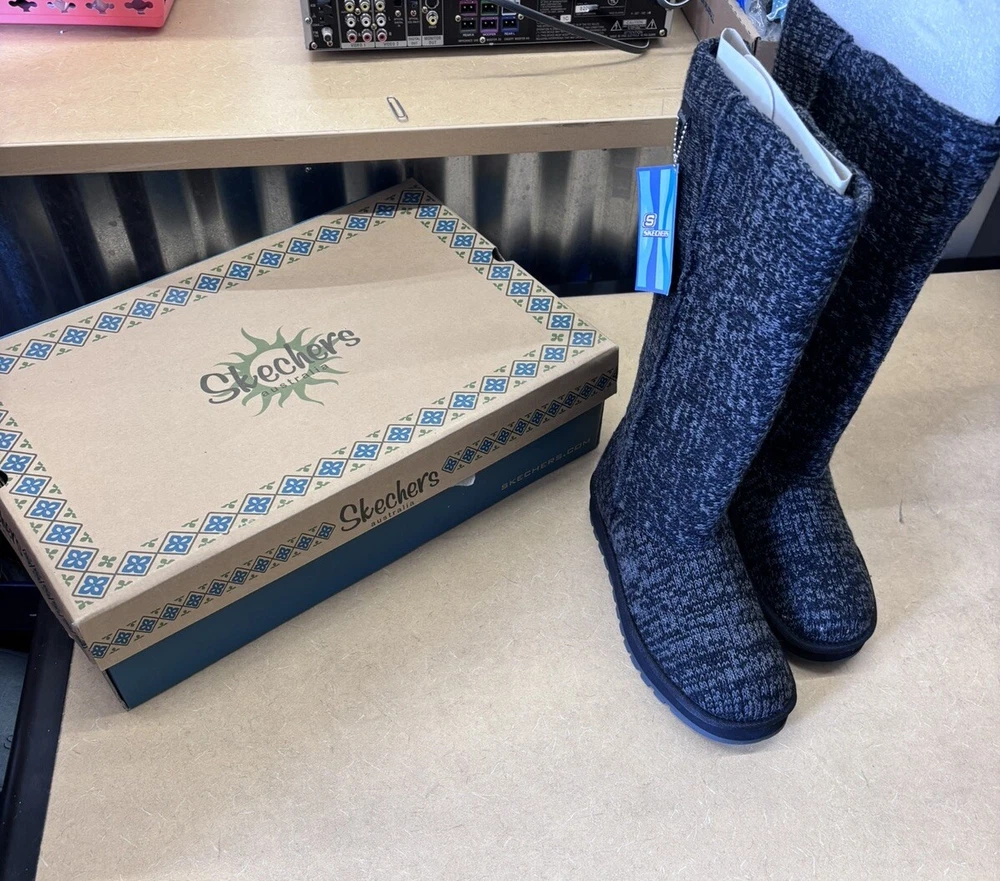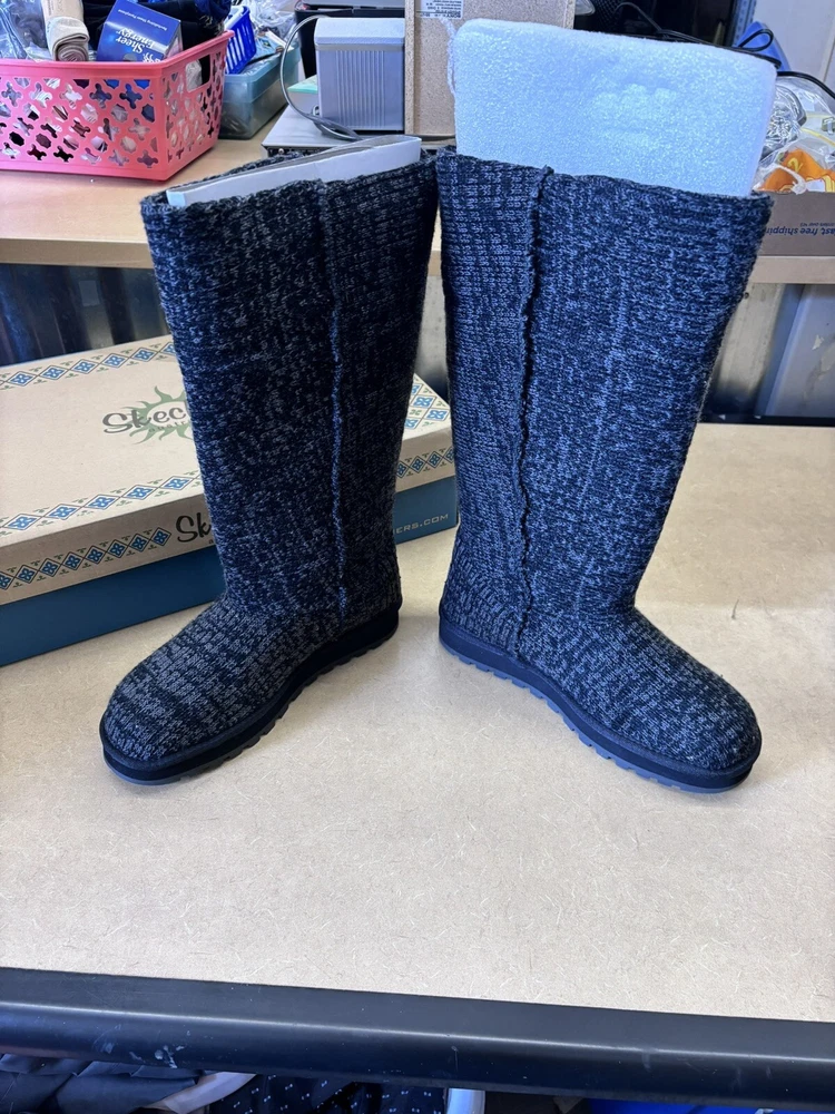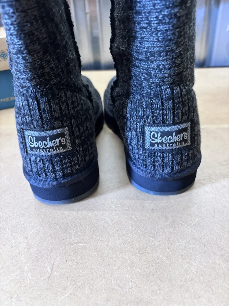 Step into comfort and style with these Skechers Winter Boots. The black mid-calf snow boots feature a cozy faux fur lining and insole, perfect for keeping your feet warm during the colder months. The knit fabric upper provides a comfortable fit, while the rubber outsole ensures durability and traction on slippery surfaces. These boots are perfect for casual occasions and can be easily pulled on for convenience. The round toe and flat heel style offer a classic and modern look, making these boots a versatile addition to any winter wardrobe. The Skechers logo and fur trim add a touch of elegance to these practical boots.