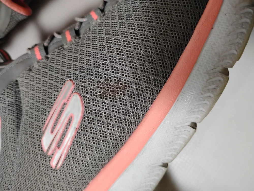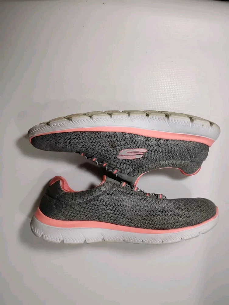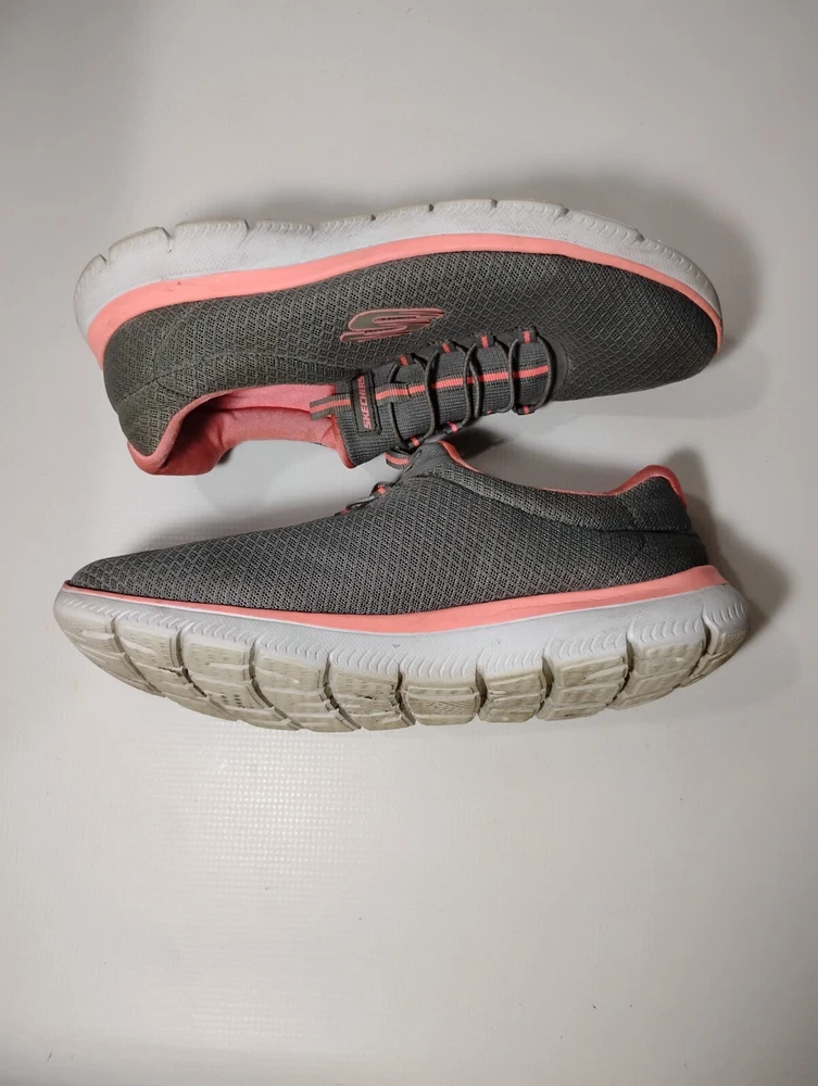 These shoes are in great condition with no rips or tears. One shoe has a small stain on the side. see pictures for details. Used with plenty of life left in them. This is a pair of Skechers Women's Summits running shoes in size 10. They are slip-on sneakers with a mesh fabric upper in gray and pink. The shoes feature a rubber outsole, breathable comfort, Skechers Memory Foam insole, and are suitable for all seasons. The style code is 12980W, and they are designed for casual wear and sports activities.