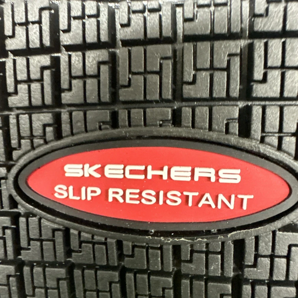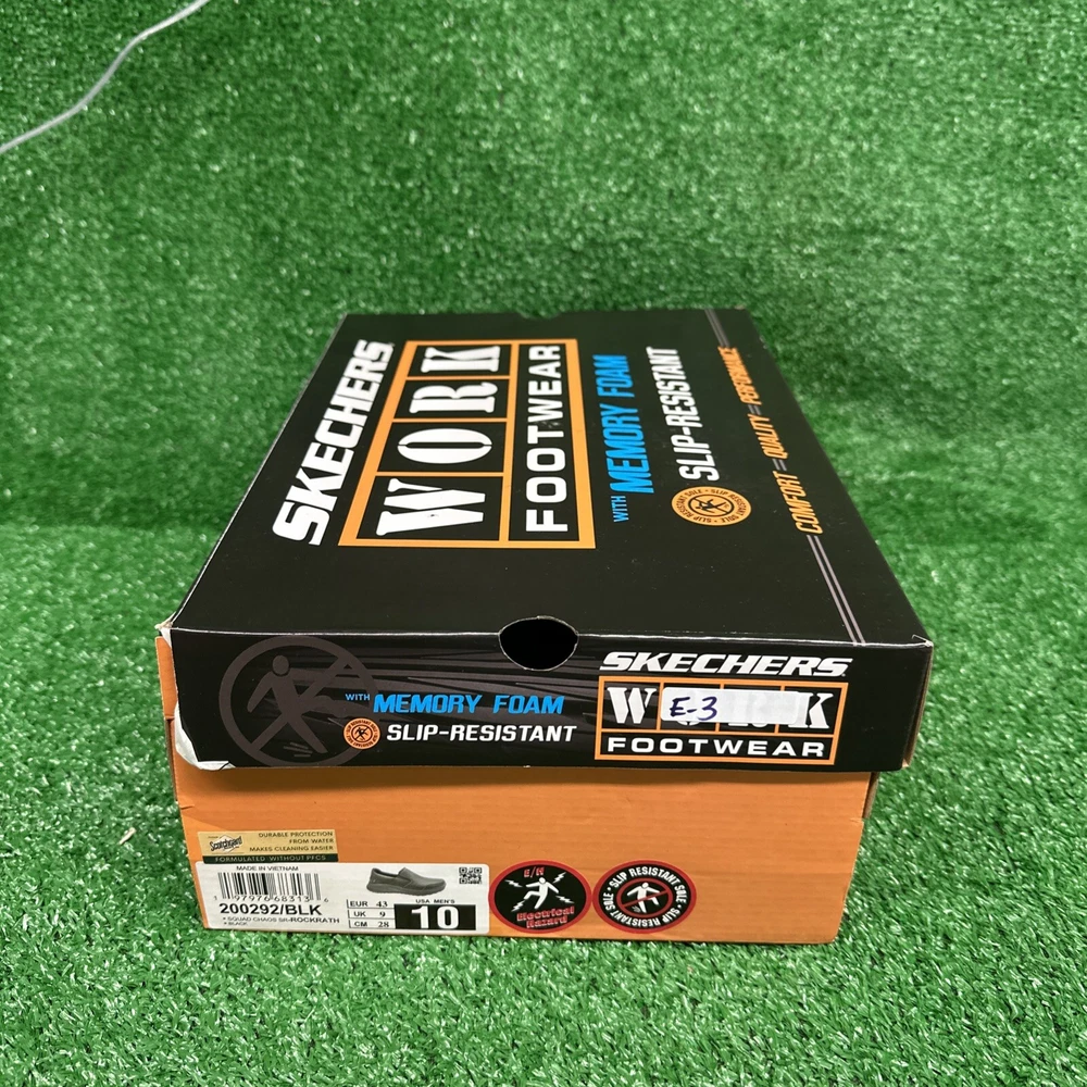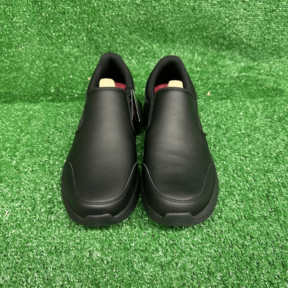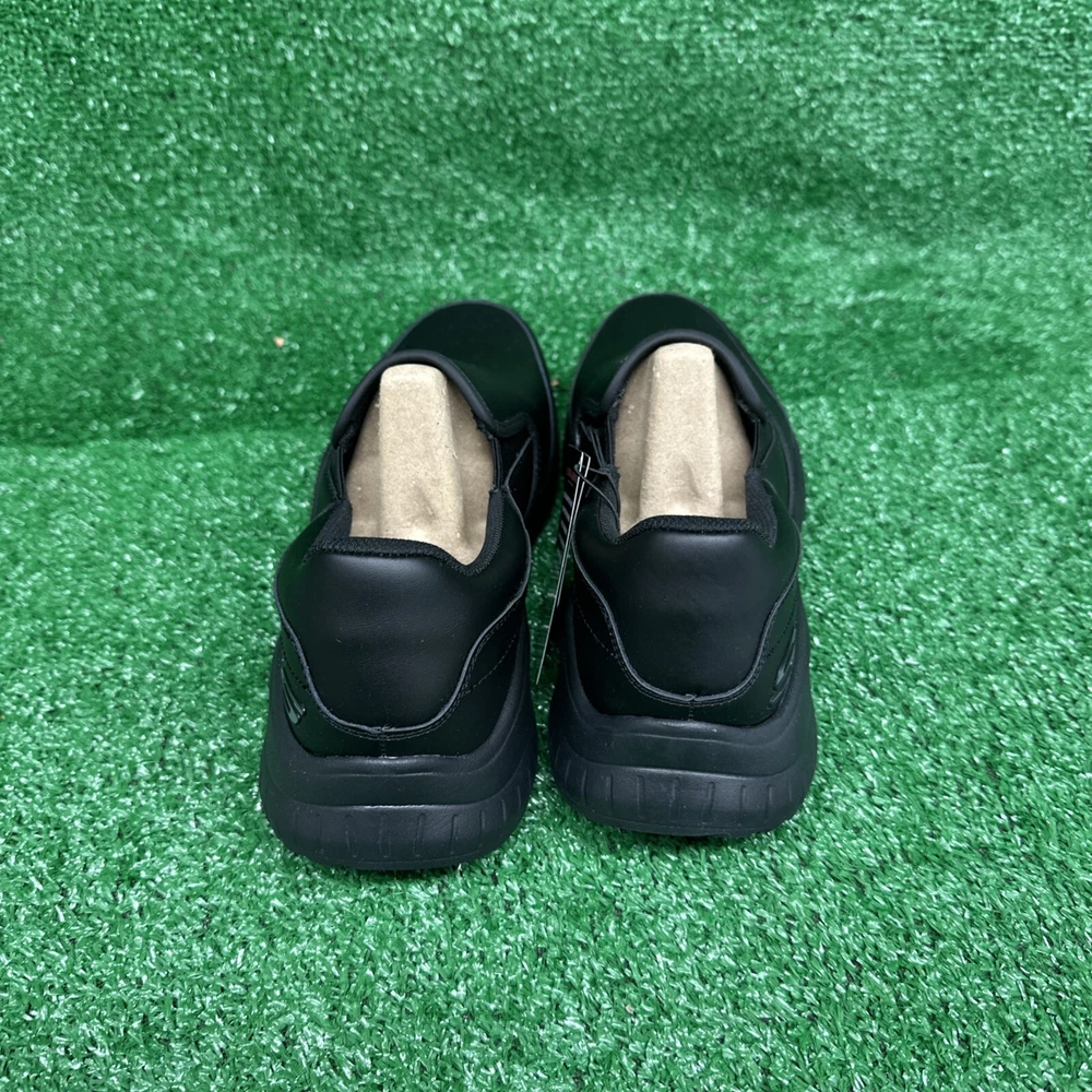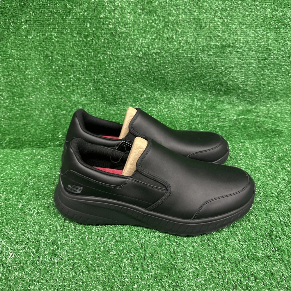 This is a pair of men's Skechers slip-on casual shoes in black, featuring the Rockrath model from the Skechers Relaxed Fit product line. The shoes are designed to be slip-resistant and have a synthetic upper material. They are in US shoe size 10 and are ideal for work environments requiring slip-resistant footwear. SKU- E3 Date- 02/05/25 Listed by-LM Condition- NWB Shade/size- 10/ black Inspected to the best of our abilities and looks to be in good condition. **Item has sticker for SKU purposes**