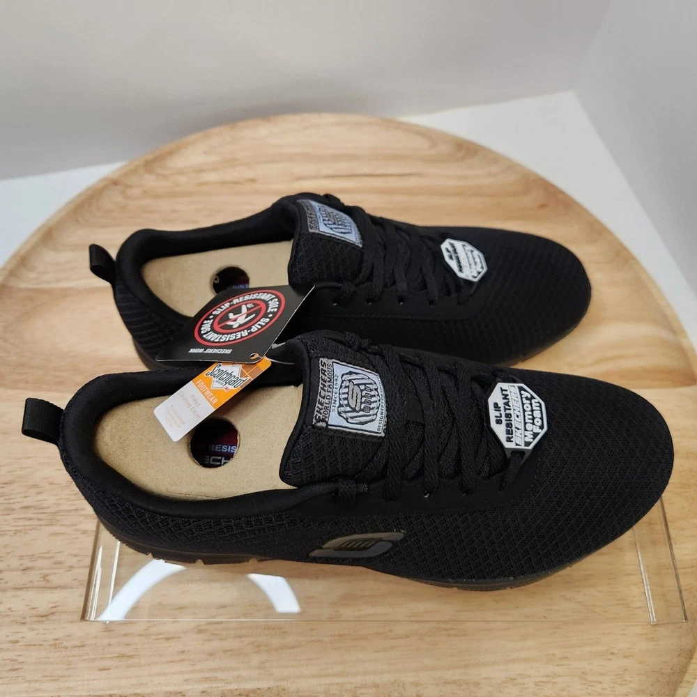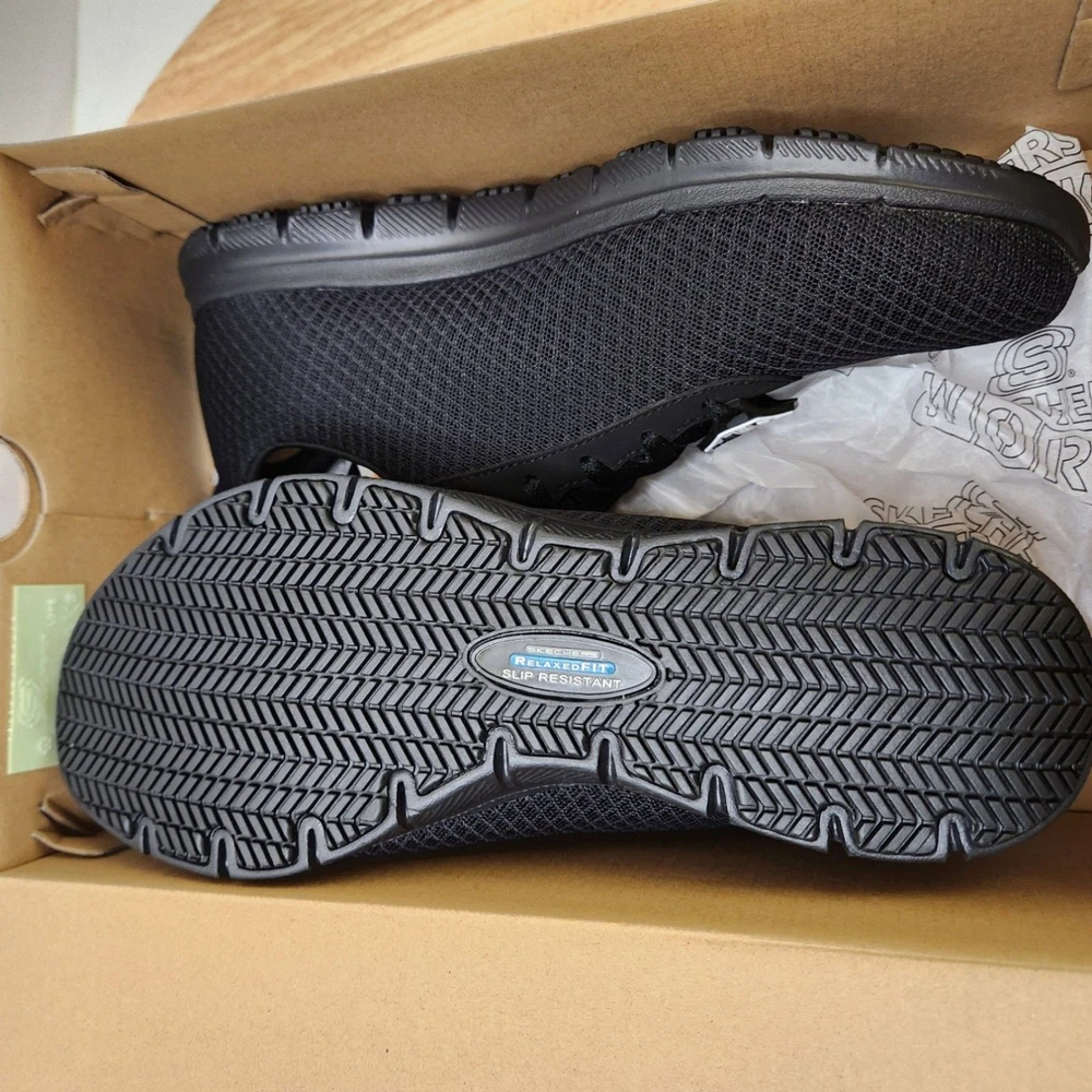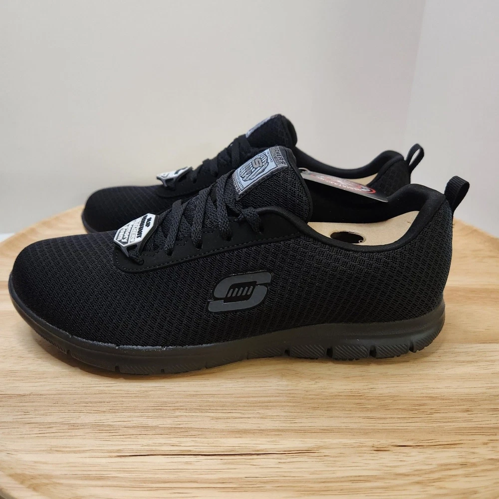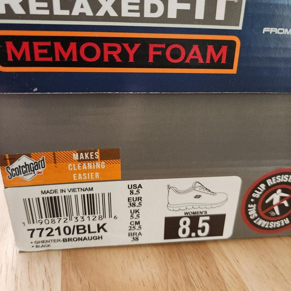 women's US size 8.5 Euro 38.5 Skechers Ghenter Bronaugh work shoes black slip-resistant relaxed fit memory foam clean soles, with box Please go by the photos and typed description (not auto fill) for item details. Any questions, just ask!